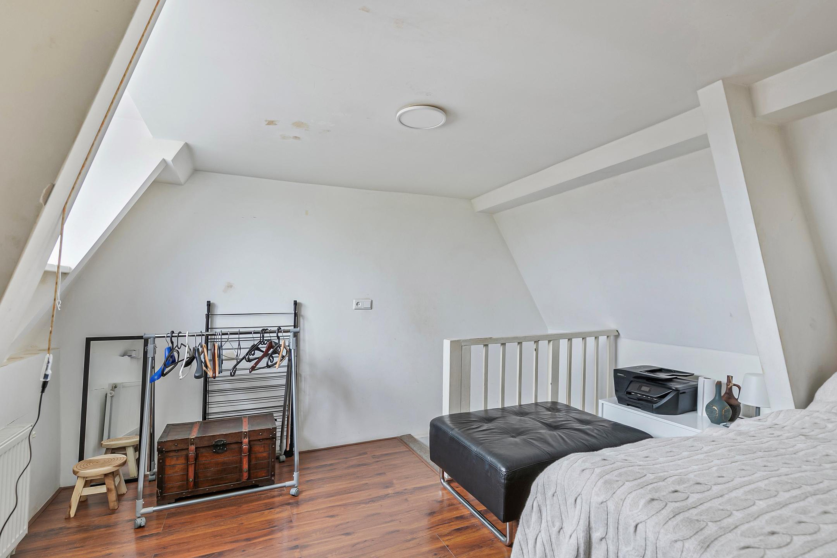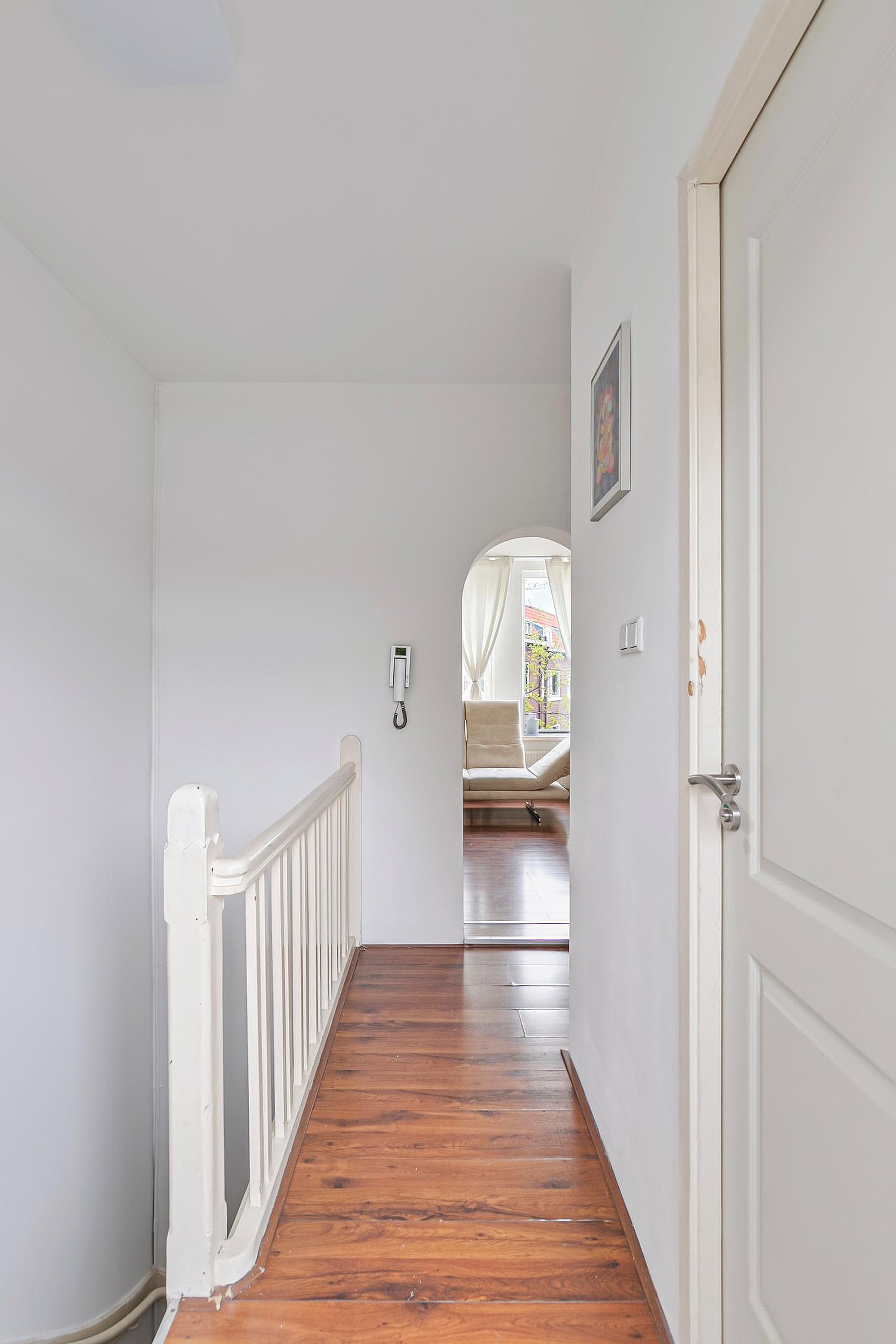 Tweede verdieping 2e verdieping: Overloop, hal met toilet en meterkast, badkamer, slaapkamer, balkon. Ruime en sfeervolle woonkamer met open keuken. Vanuit de woonkamer is er toegang tot een slaapkamer aan de voorzijde..