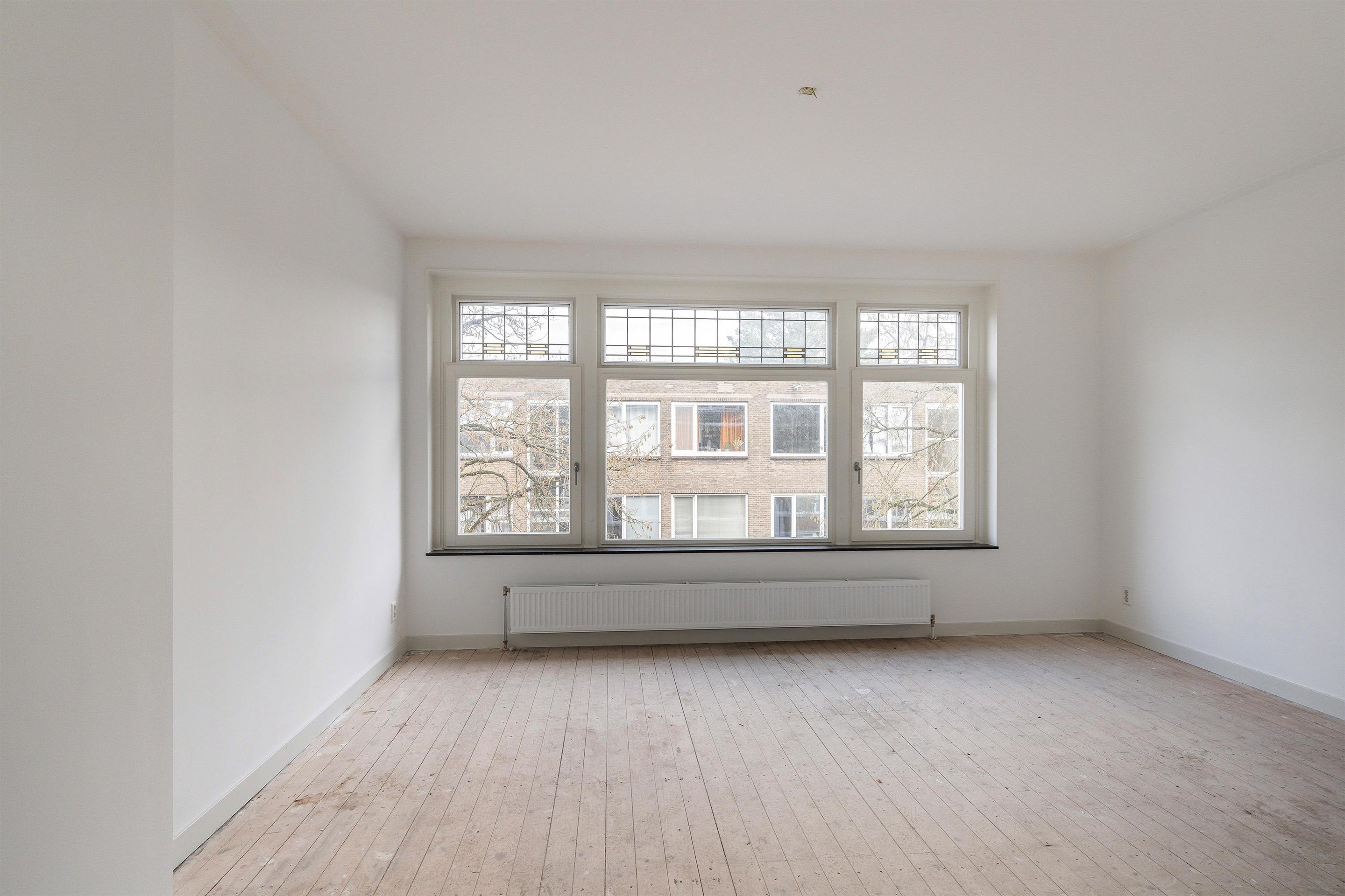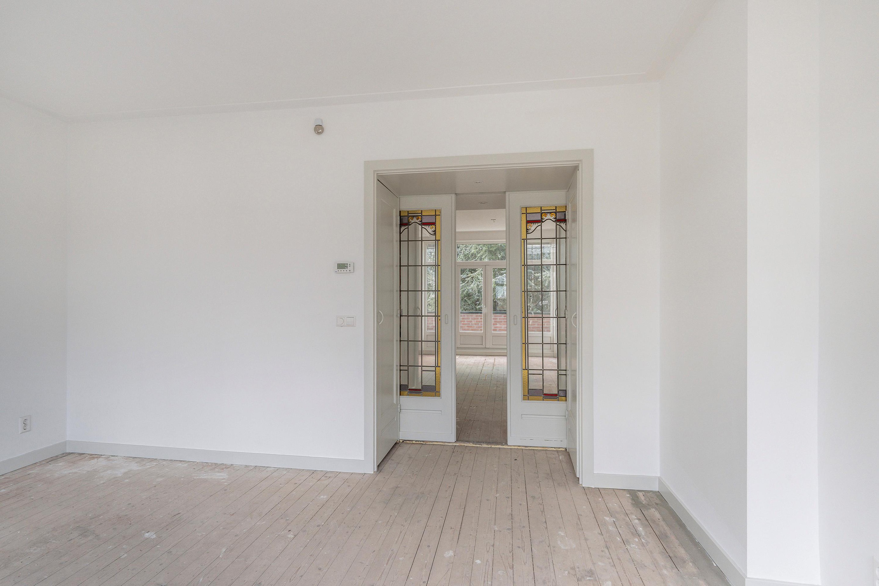 - Woonkamer aan voorzijde, bereikbaar via karakteristieke inbouwkast met glas-in-lood ensuite deuren; veel lichtinval.