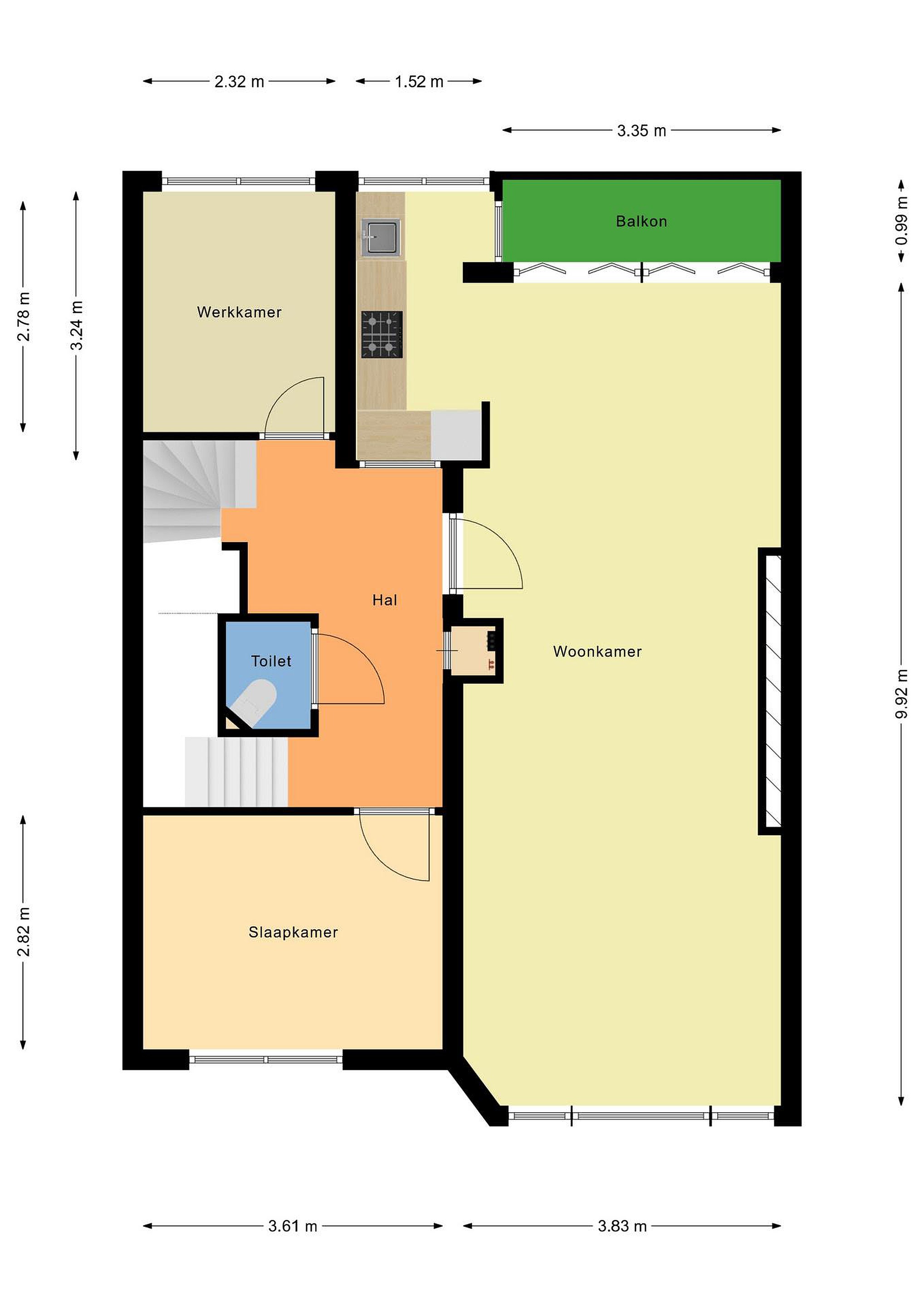 De ruime hal geeft toegang tot de doorzonwoonkamer met open keuken, de toiletruimte en twee slaapkamers. Daarnaast bevindt zich hier een vaste kast met de meterkast en leidt de trap vanuit de hal naar de derde verdieping.