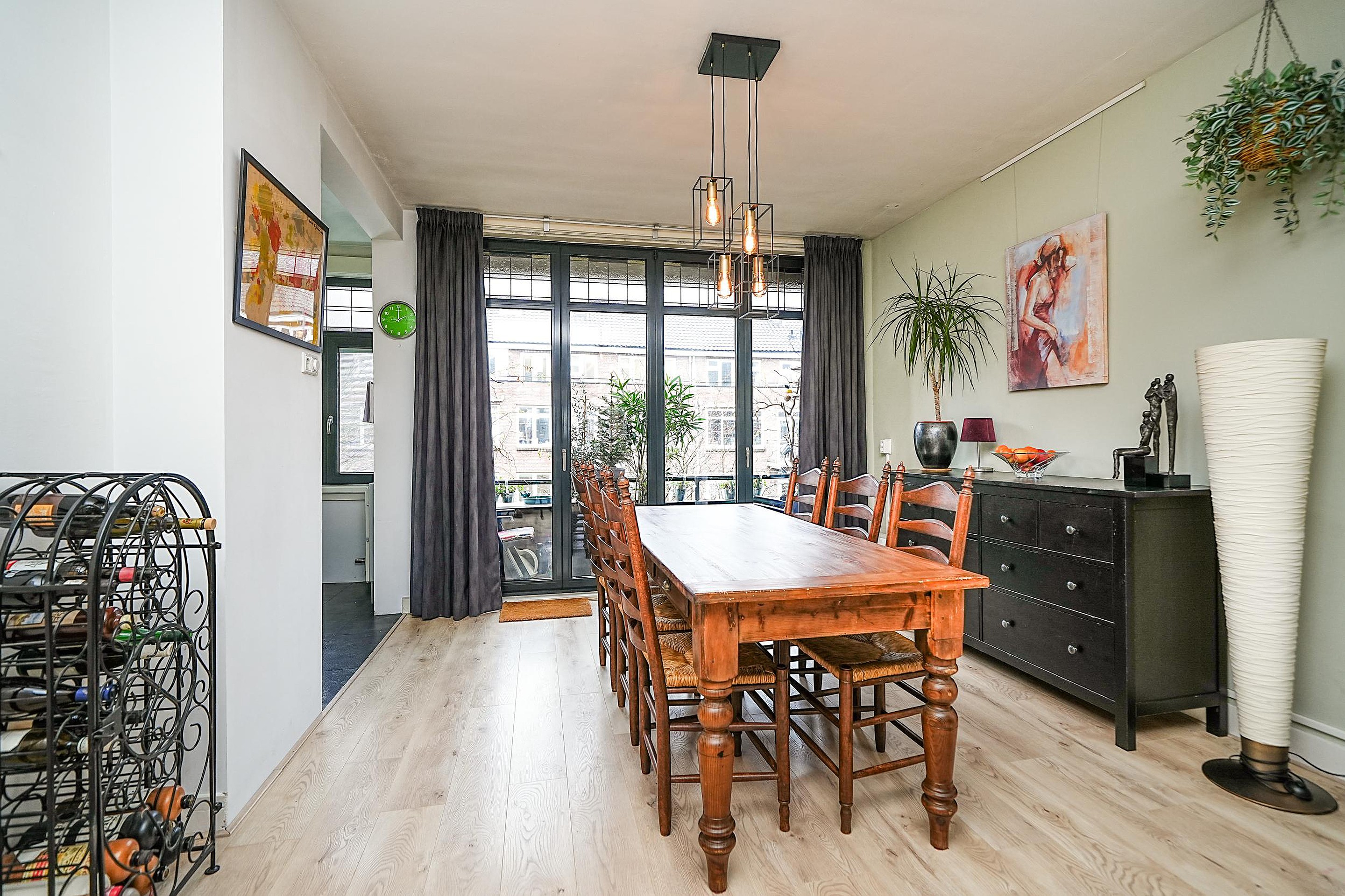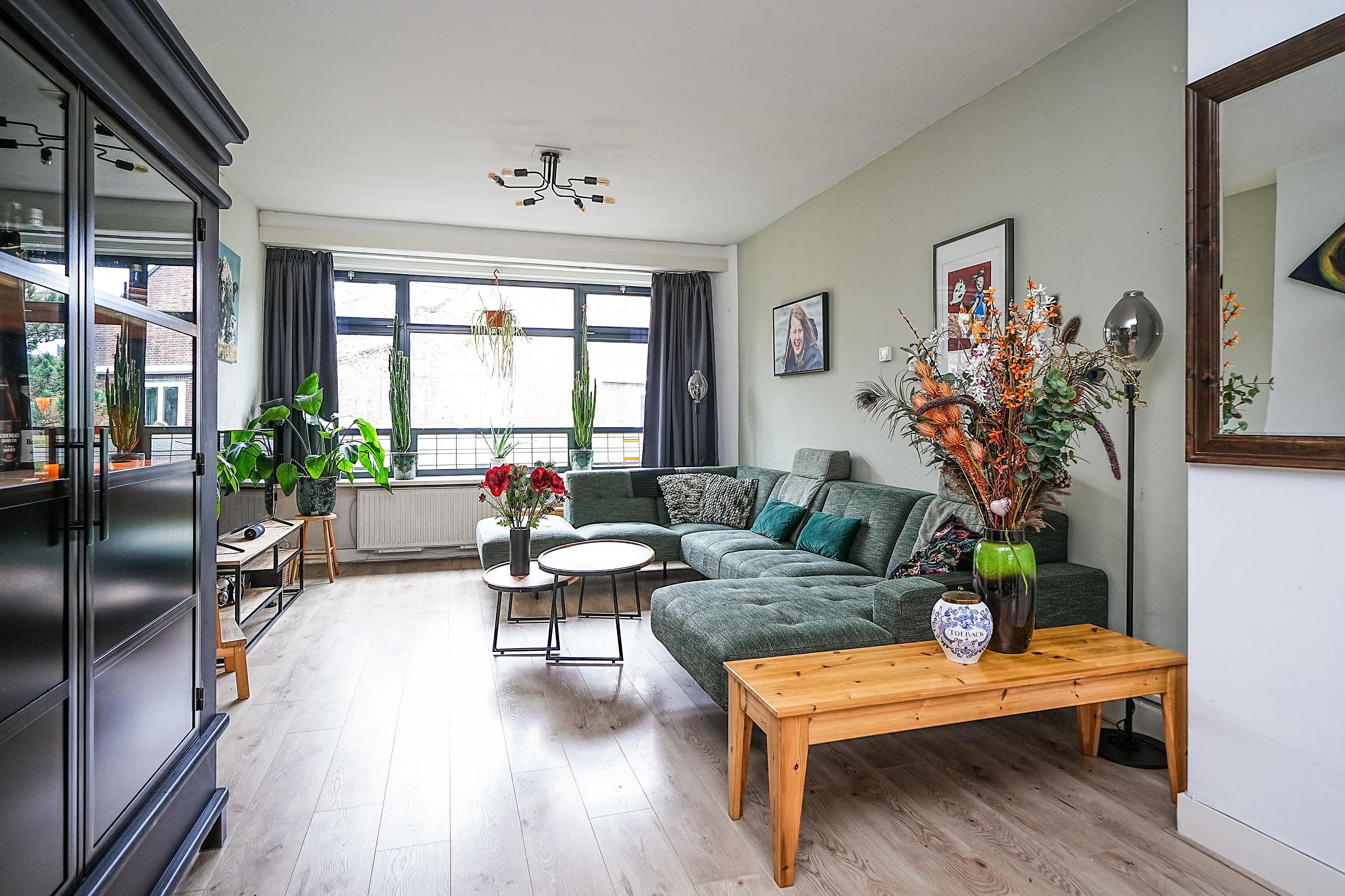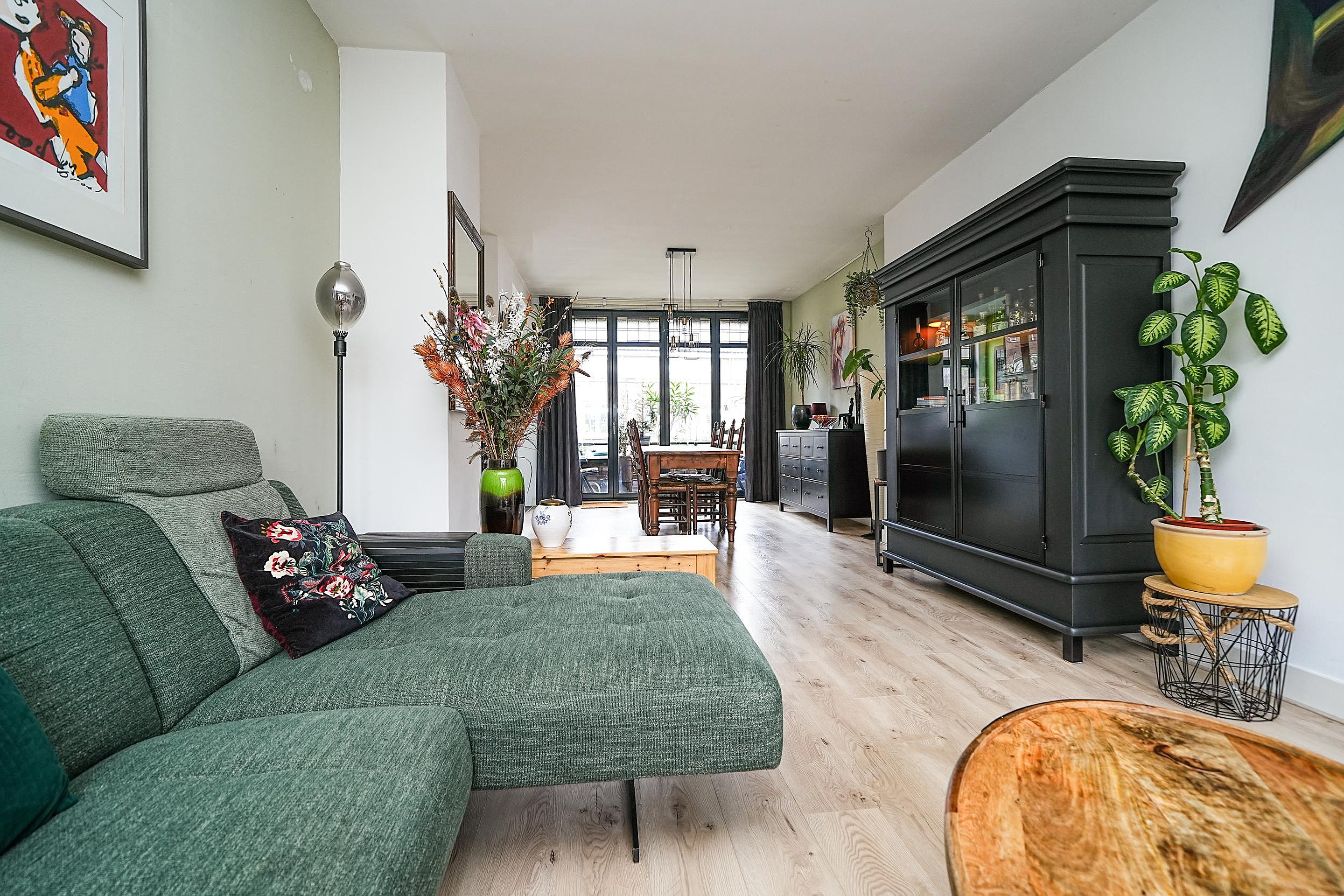 De woonkamer is zeer ruim. Hier kom je écht binnen en voel je je direct thuis. Dankzij de grote raampartijen aan beide zijden geniet je van een prachtige lichtinval. Een mooi detail is dat de sfeervolle glas-in-loodramen behouden zijn gebleven.