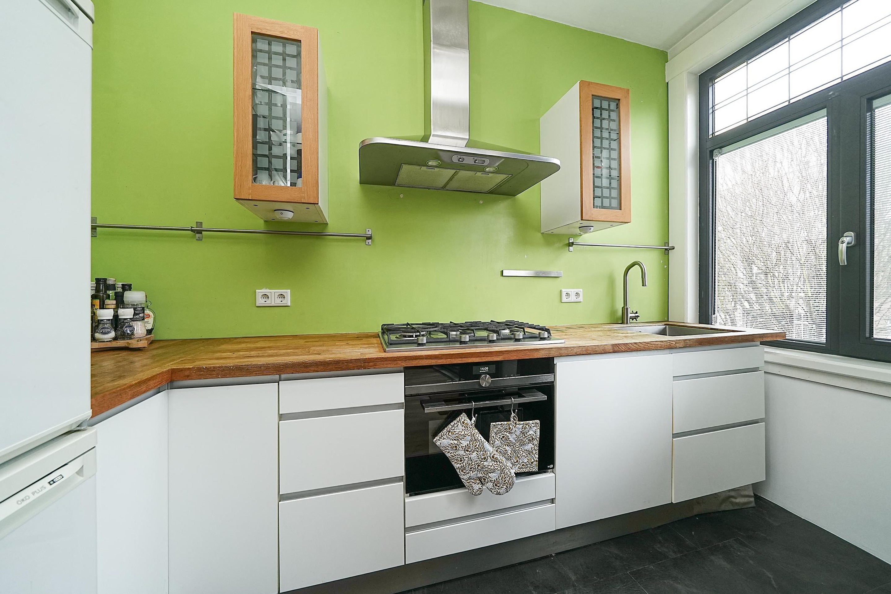 De woonkamer staat in open verbinding met de keuken. De keuken is uitgevoerd in een hoekopstelling en vormt een fijne plek voor kookliefhebbers. Deze is uitgerust met veel kastruimte, een 5-pits gasfornuis, een oven, een vaatwasser en een spoelbak met mengkraan. Het mooie houten aanrechtblad maakt het geheel compleet. Kortom, een keuken die van alle gemakken is voorzien.