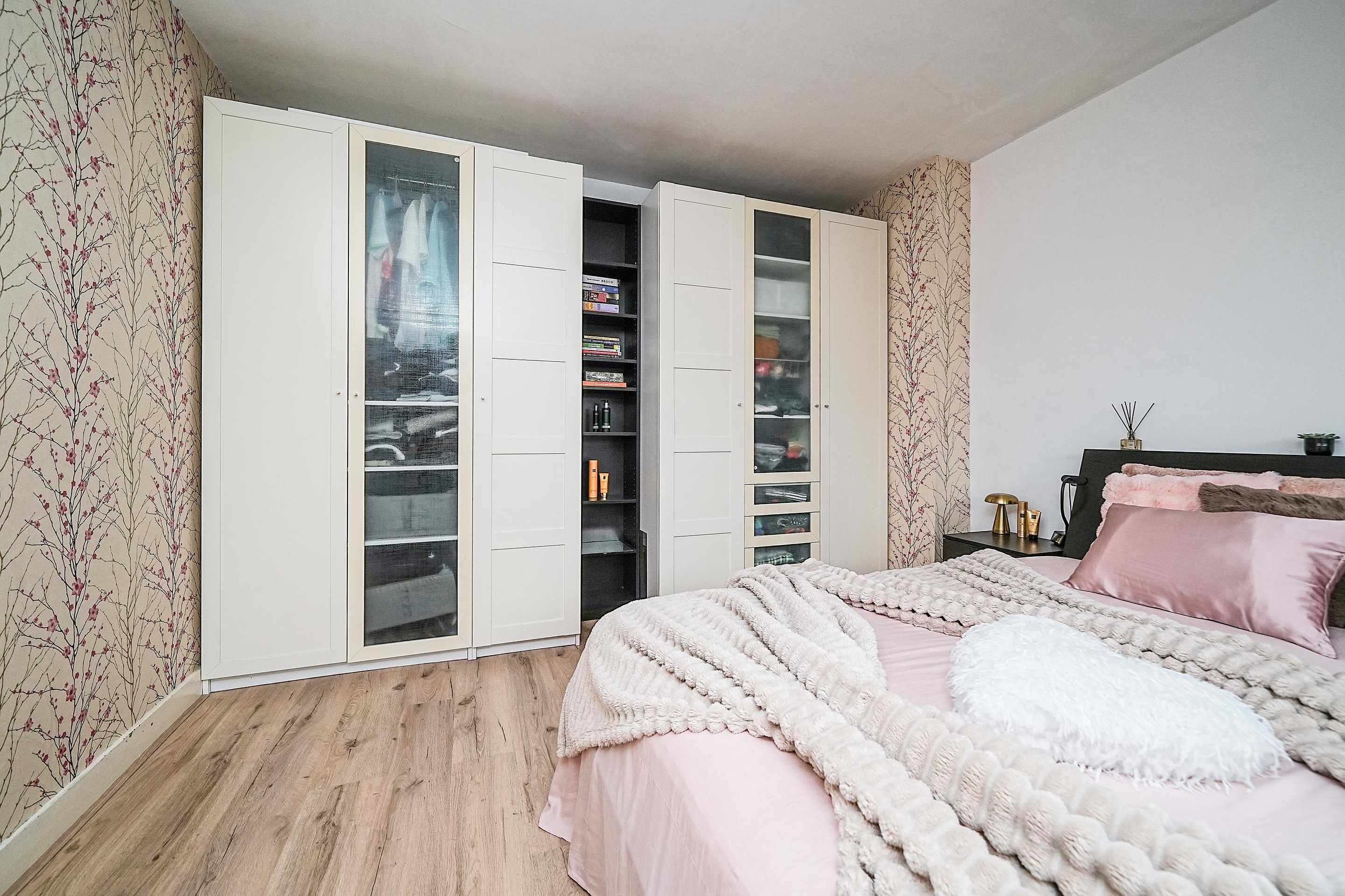 De overloop biedt toegang tot twee comfortabele slaapkamers, waarvan één is voorzien van een riante kastenwand over de volledige lengte.