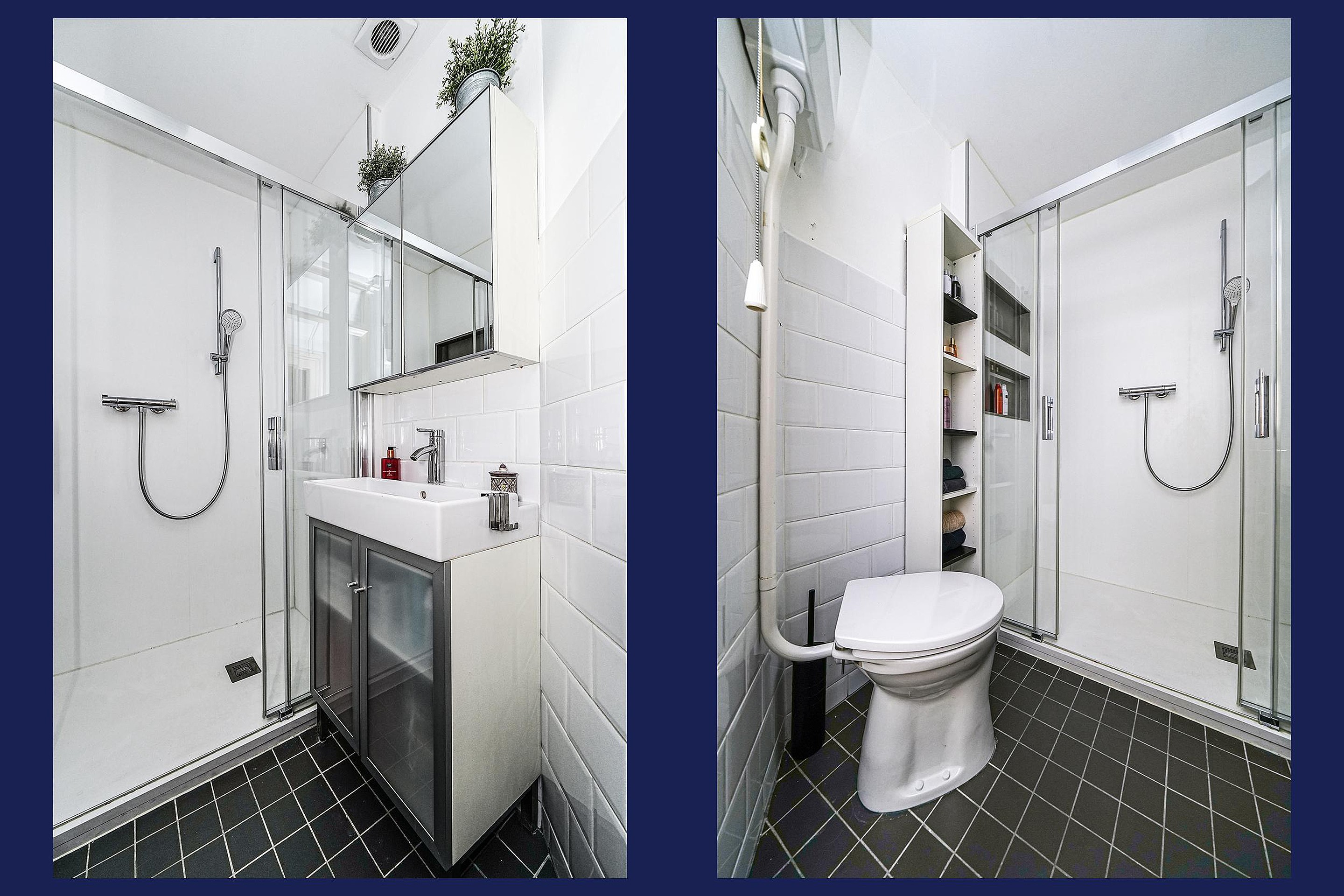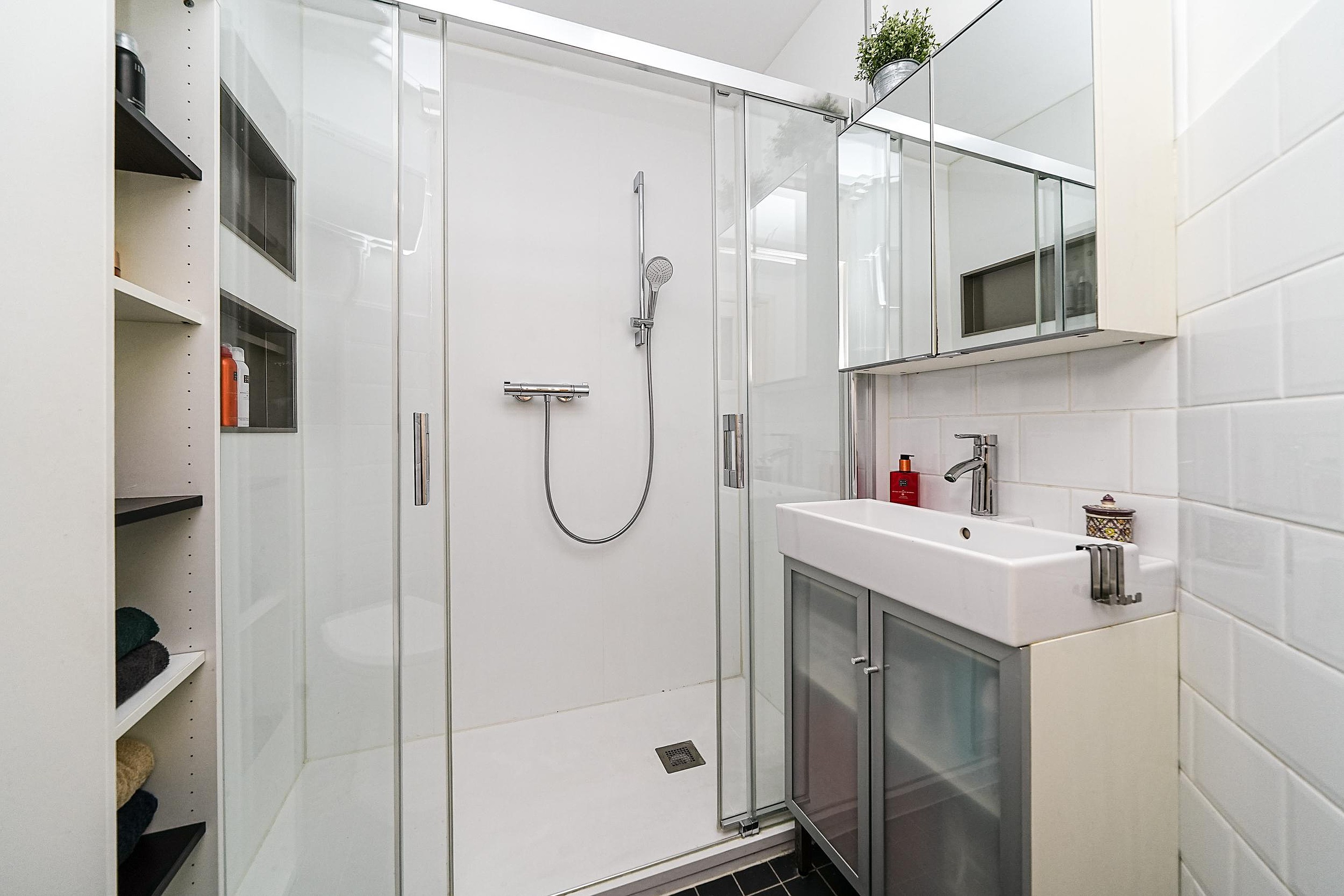 Centraal op deze verdieping bevindt zich de badkamer. De badkamer is volledig betegeld en beschikt over een douche met thermostaatkraan, een wastafelmeubel met onderkast en spiegelkast, en een toilet.