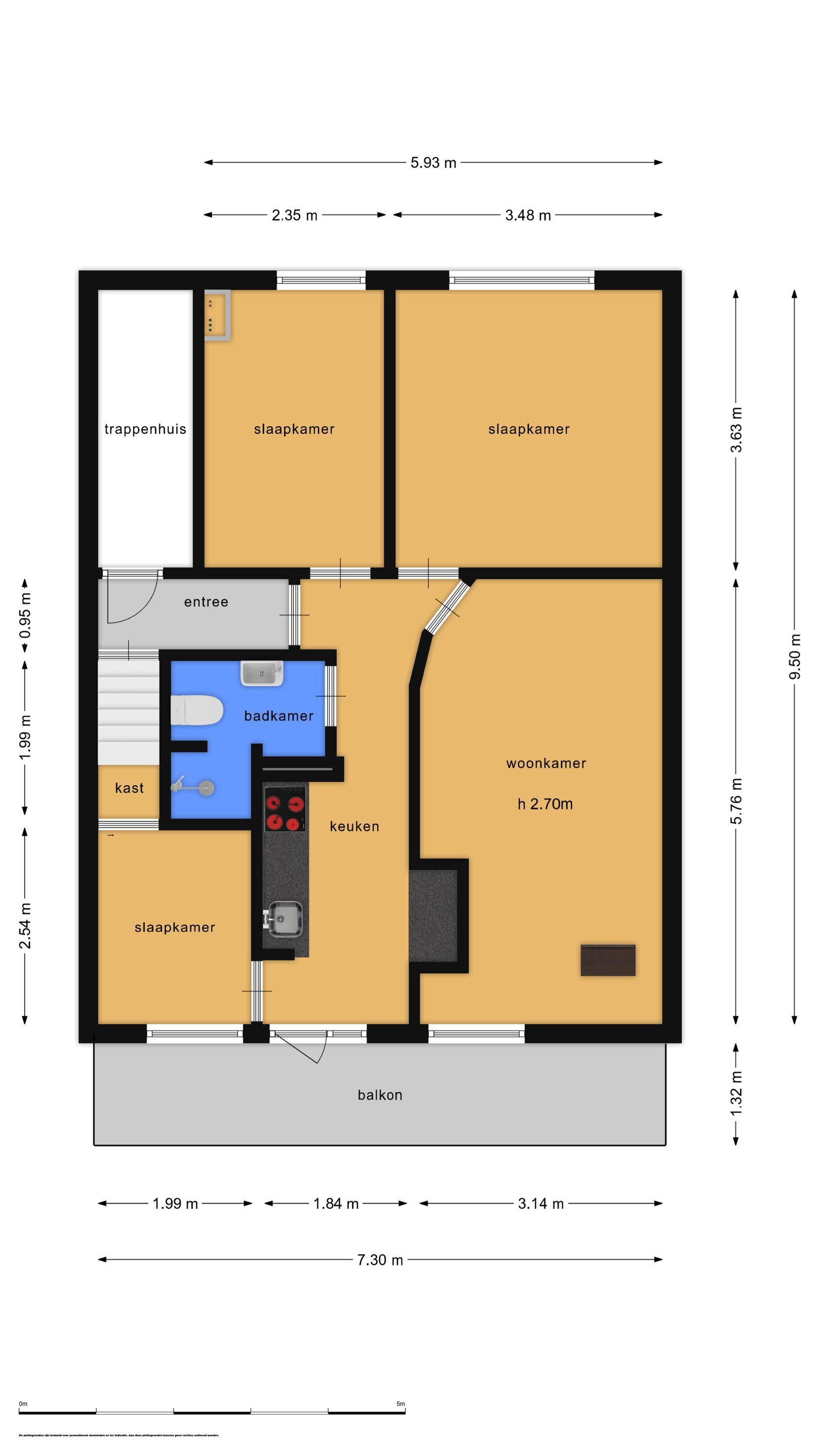 Ruime woonkamer, keuken met alle nodige (inbouw) apparatuur die tevens toegang geeft tot de balkon. Drie slaapkamers, badkamer met inloopdouche, hangtoilet, en wastafel.