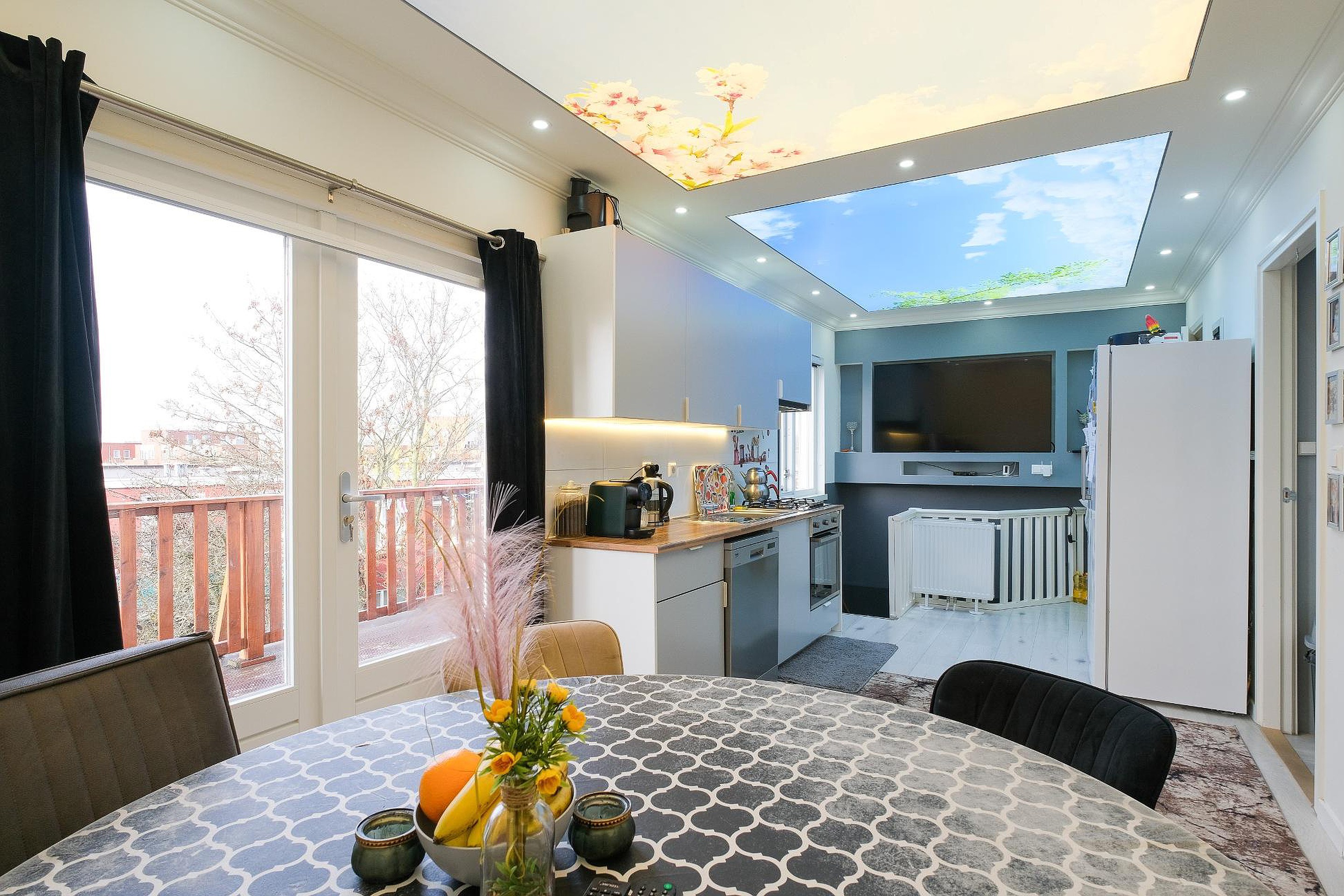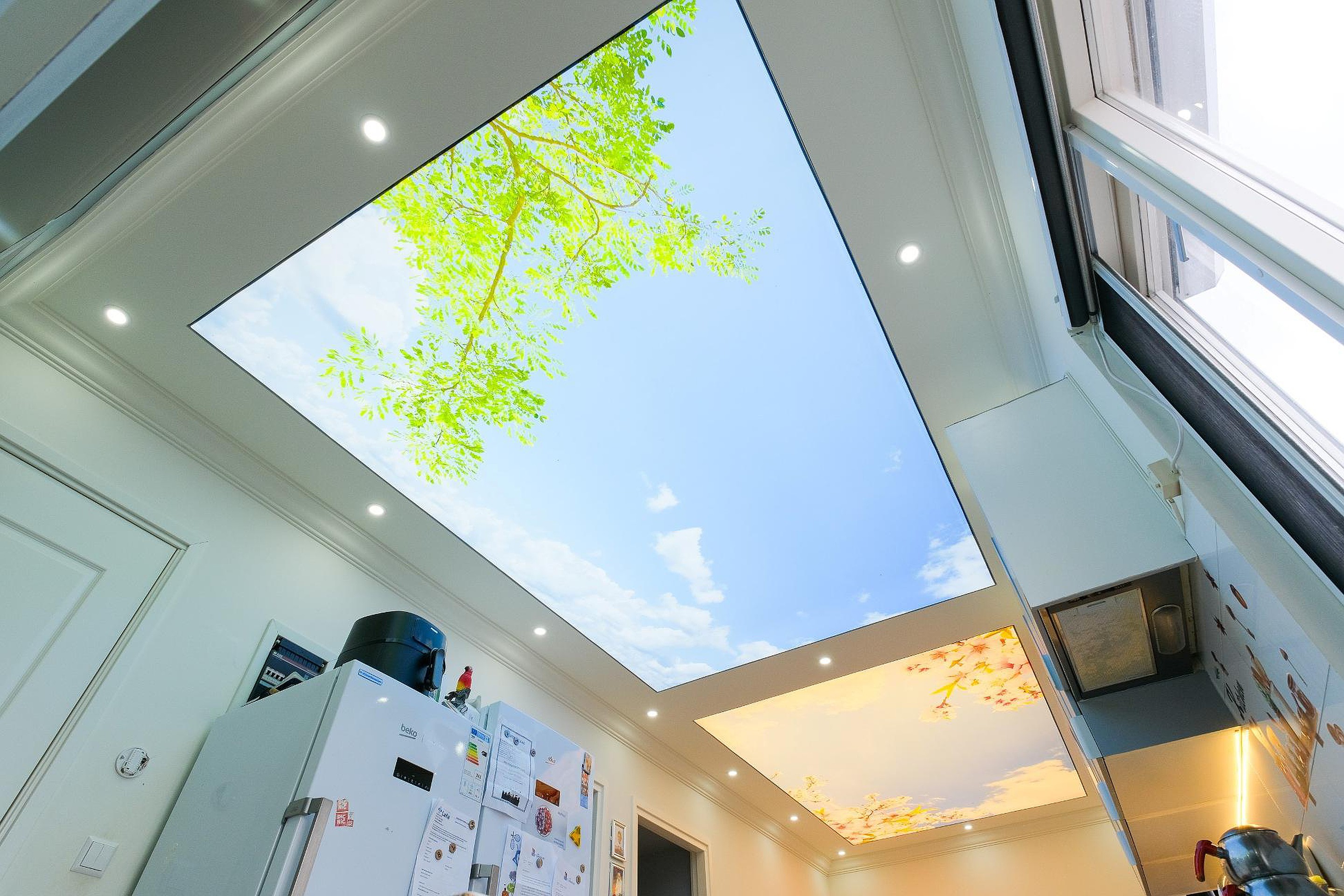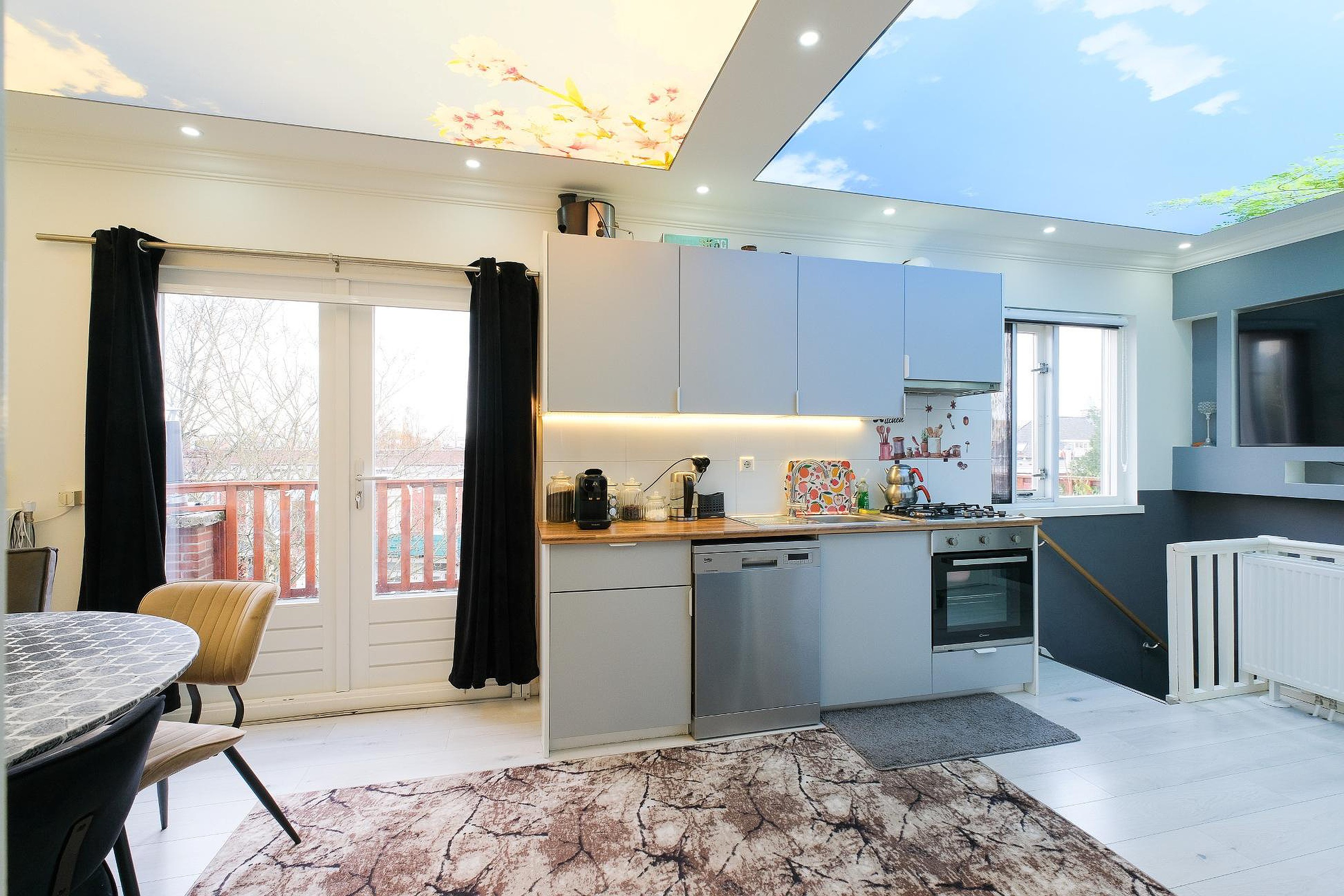 De woonkeuken van derde verdieping is prachtig afgewerkt met een wolken plafond.