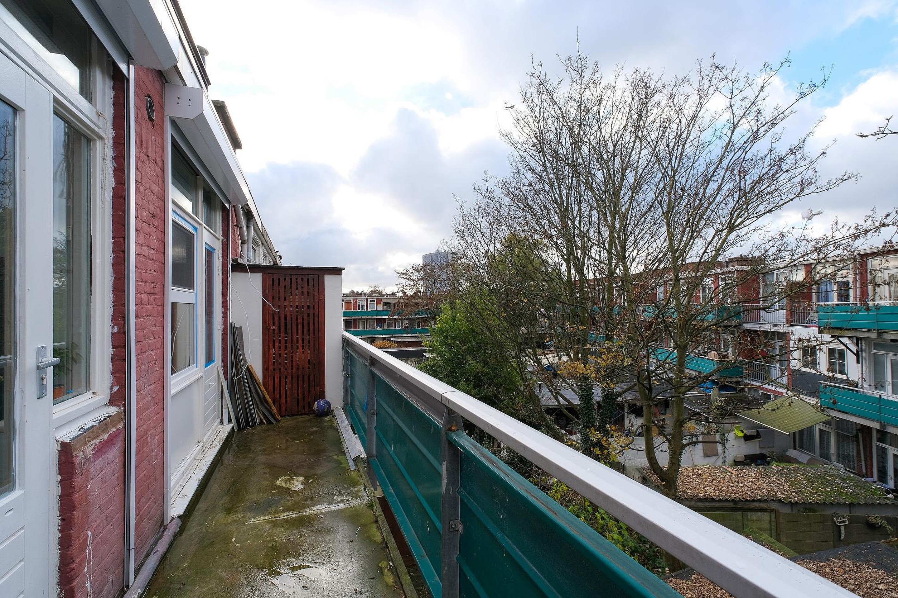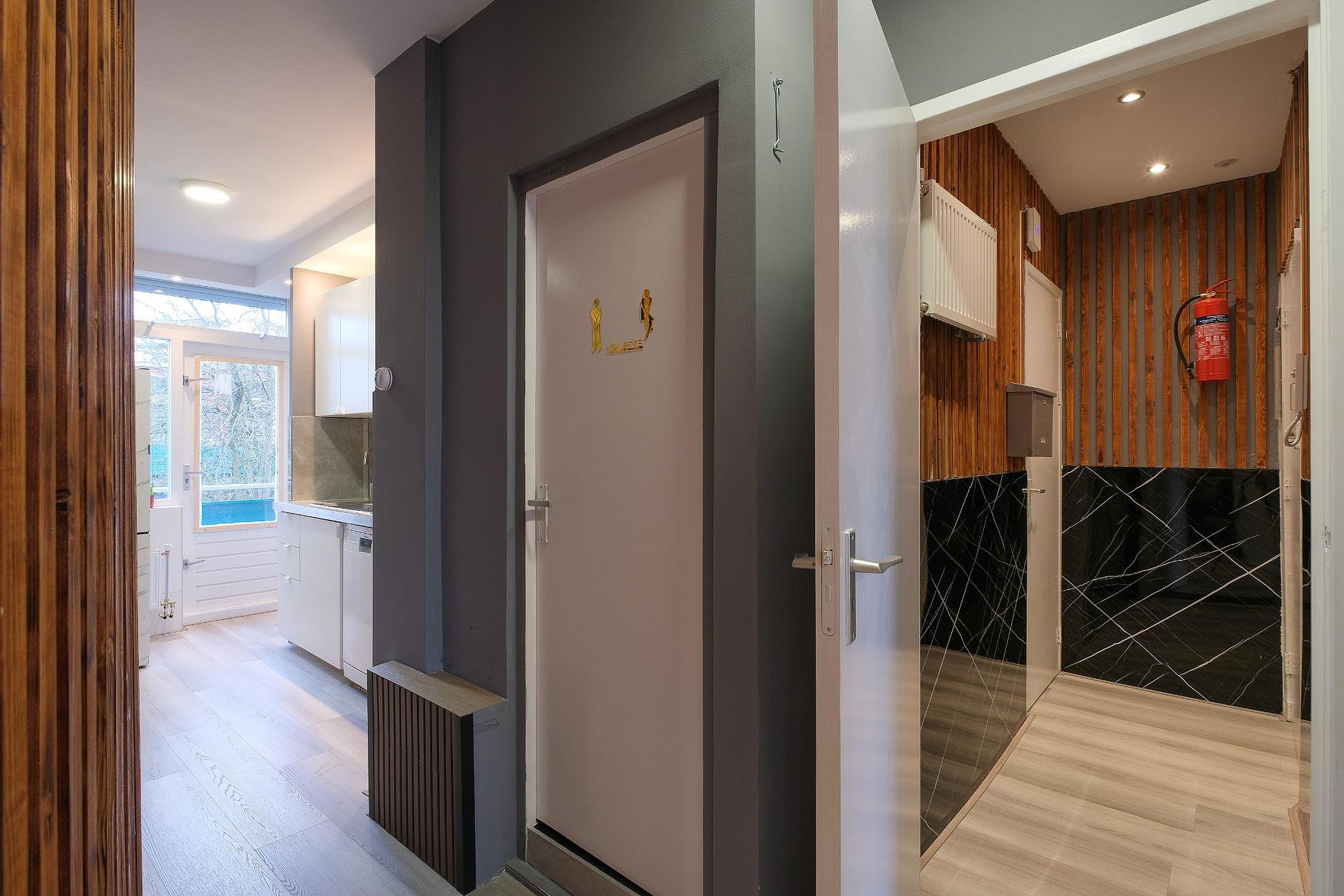 Open Haagse portiek met aparte postbussen, hal, binnentrap naar de tweede en derde verdieping.