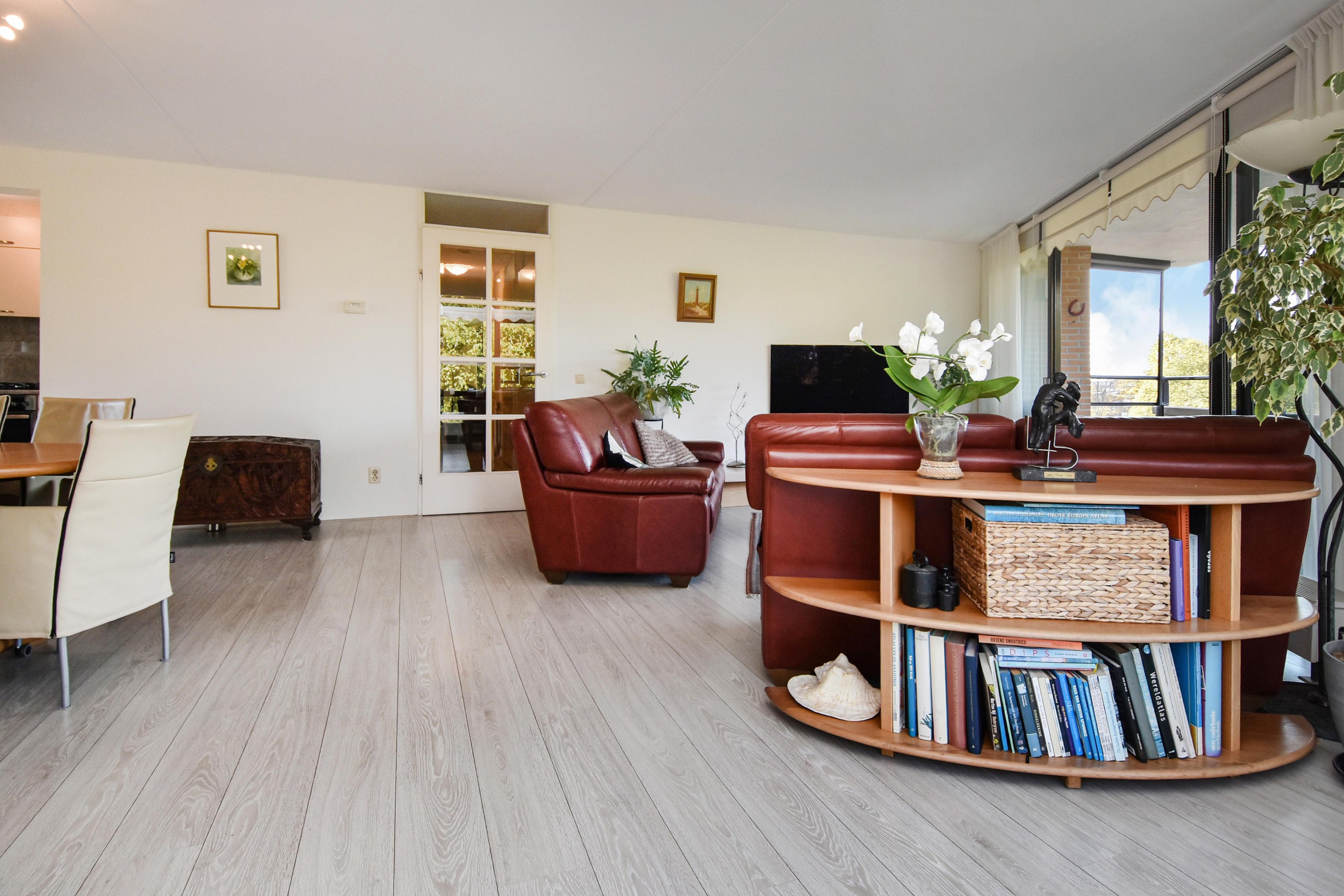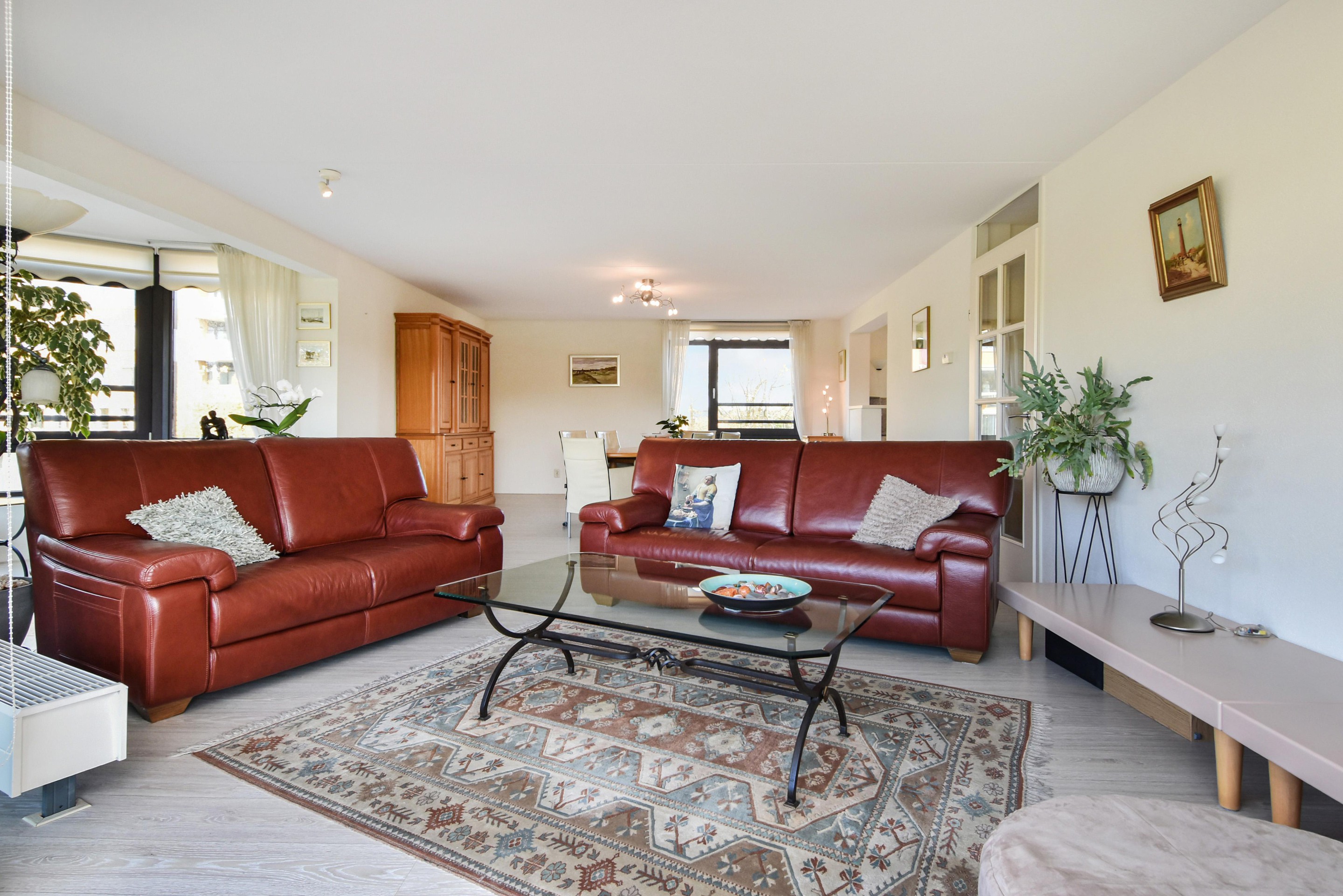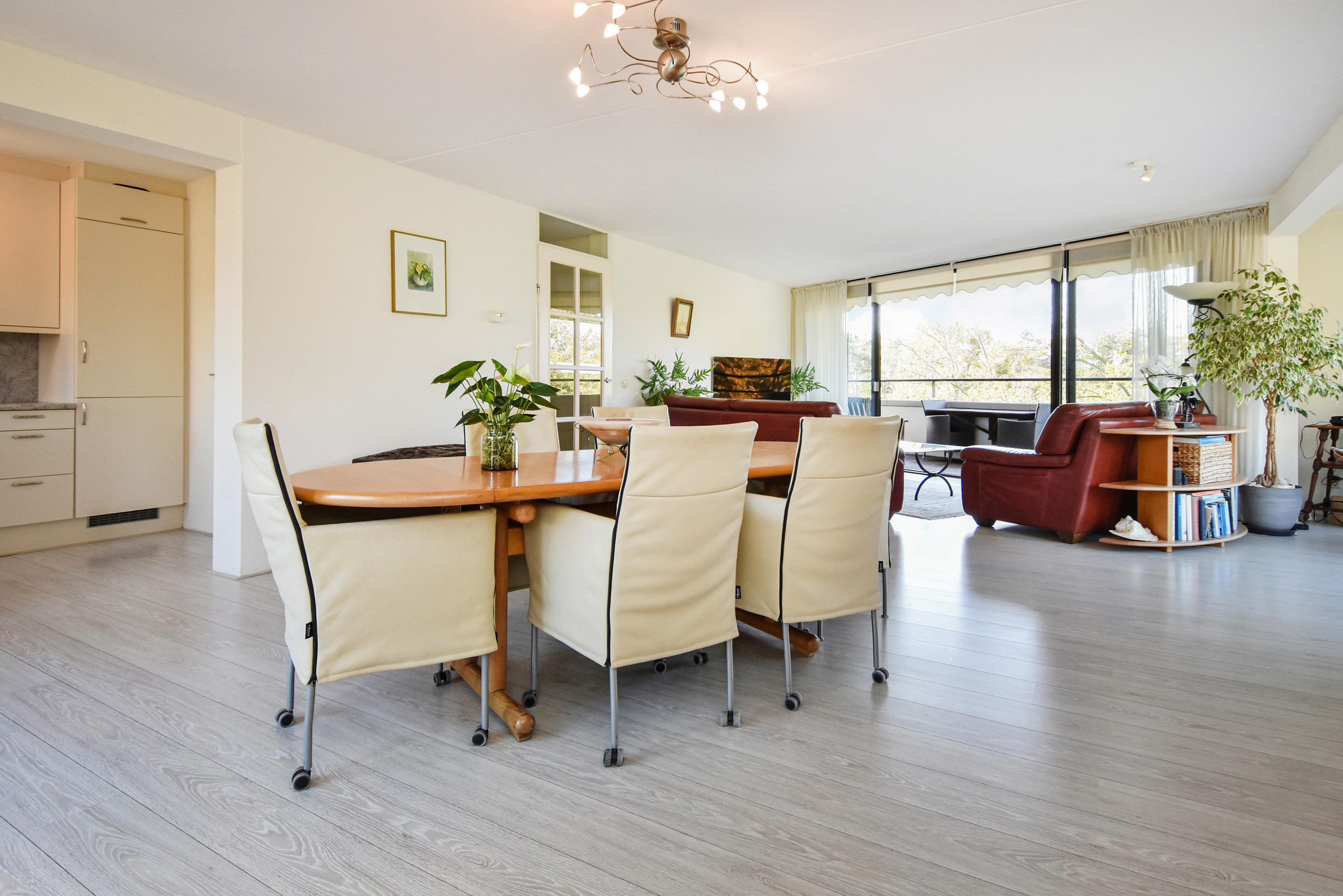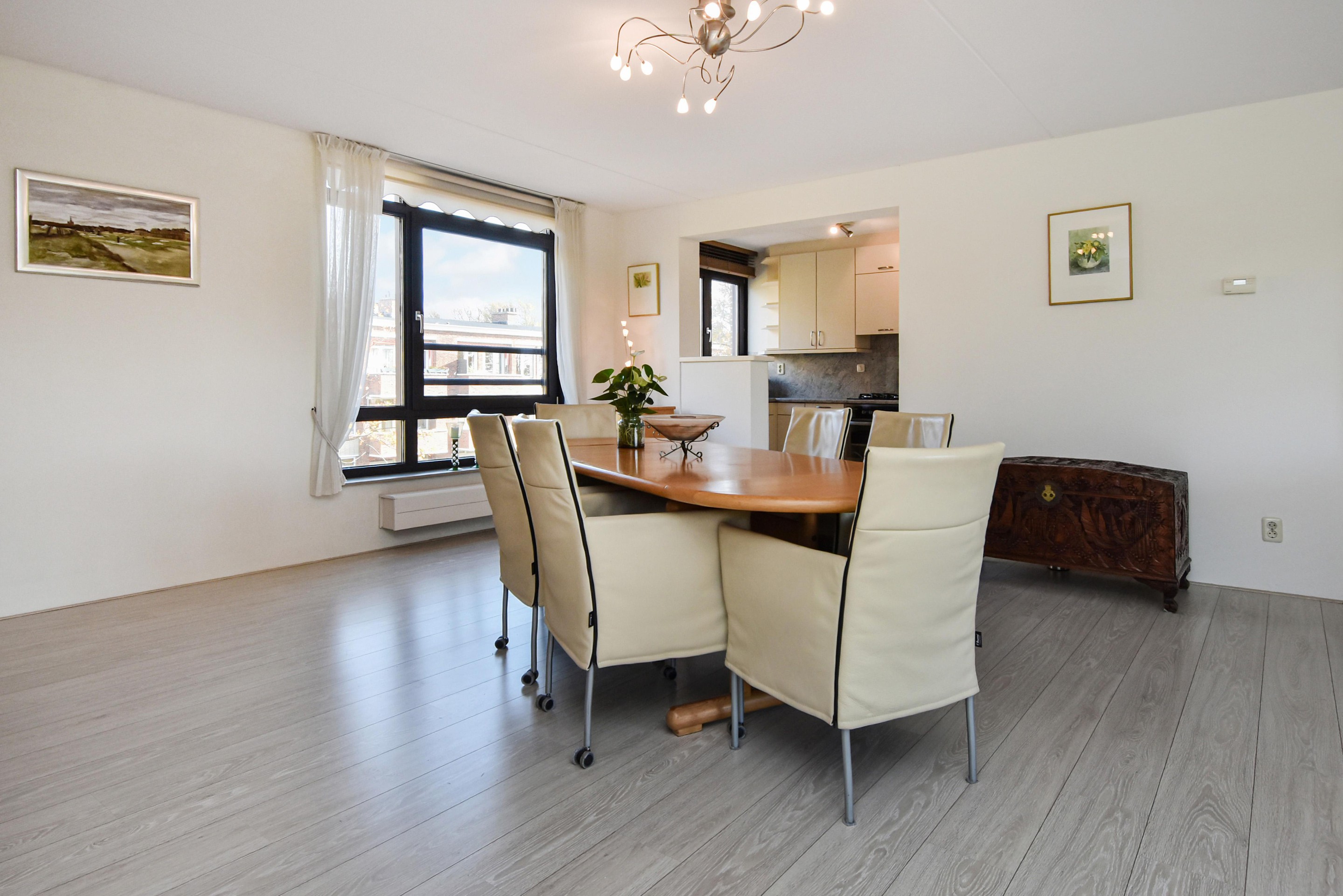 De ruime woon-/eetkamer is opvallend licht door de vele ramen aan drie zijden. Vanuit de comfortabele zithoek met schuifpui stapt u zo het zonnige balkon op, waar u tot laat op de dag van de zon kunt genieten. De brede raampartijen aan de ronde gevel zorgen voor een prachtig ruimtelijk gevoel en uitzicht over de straat.