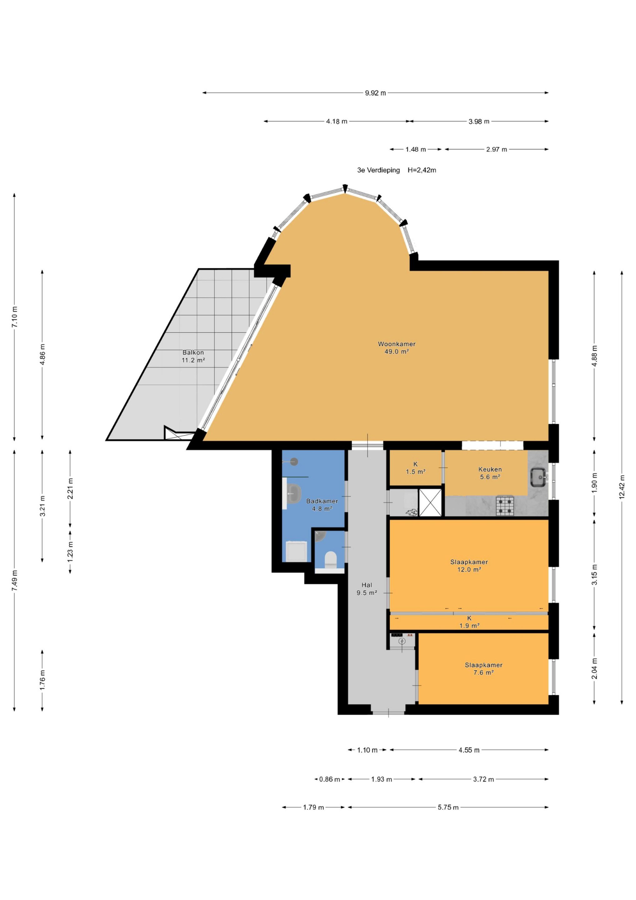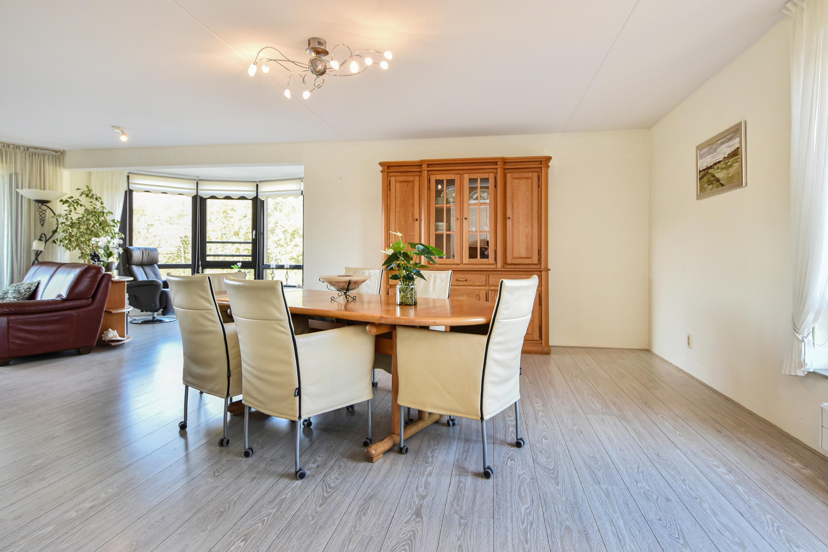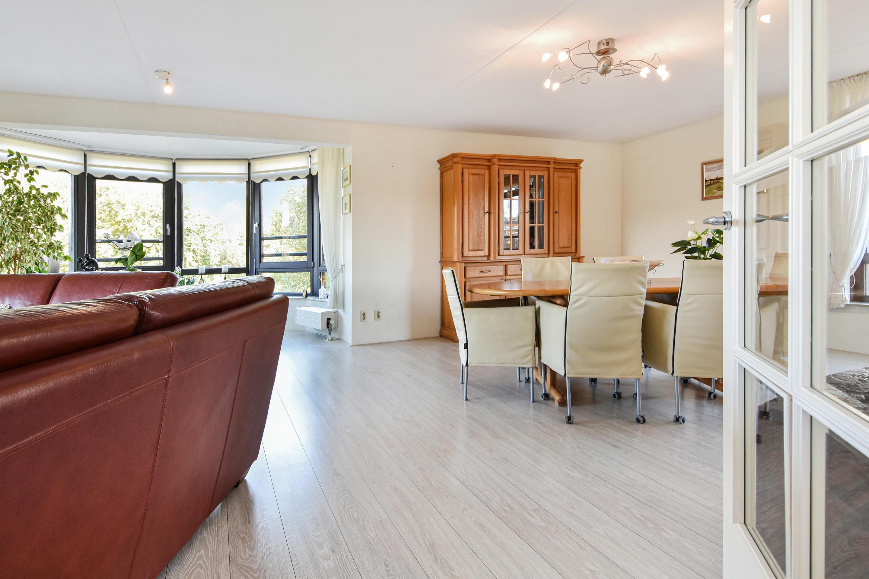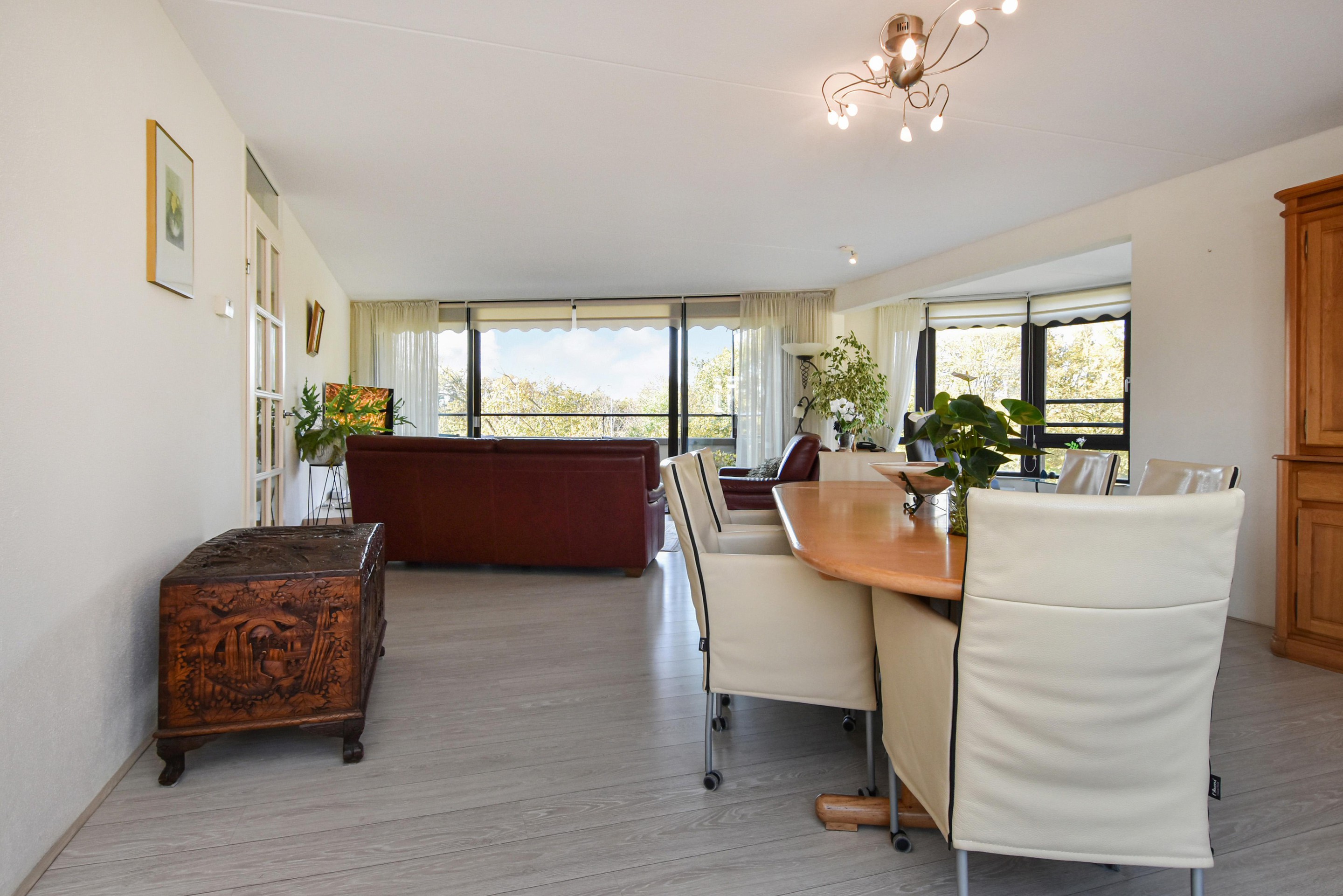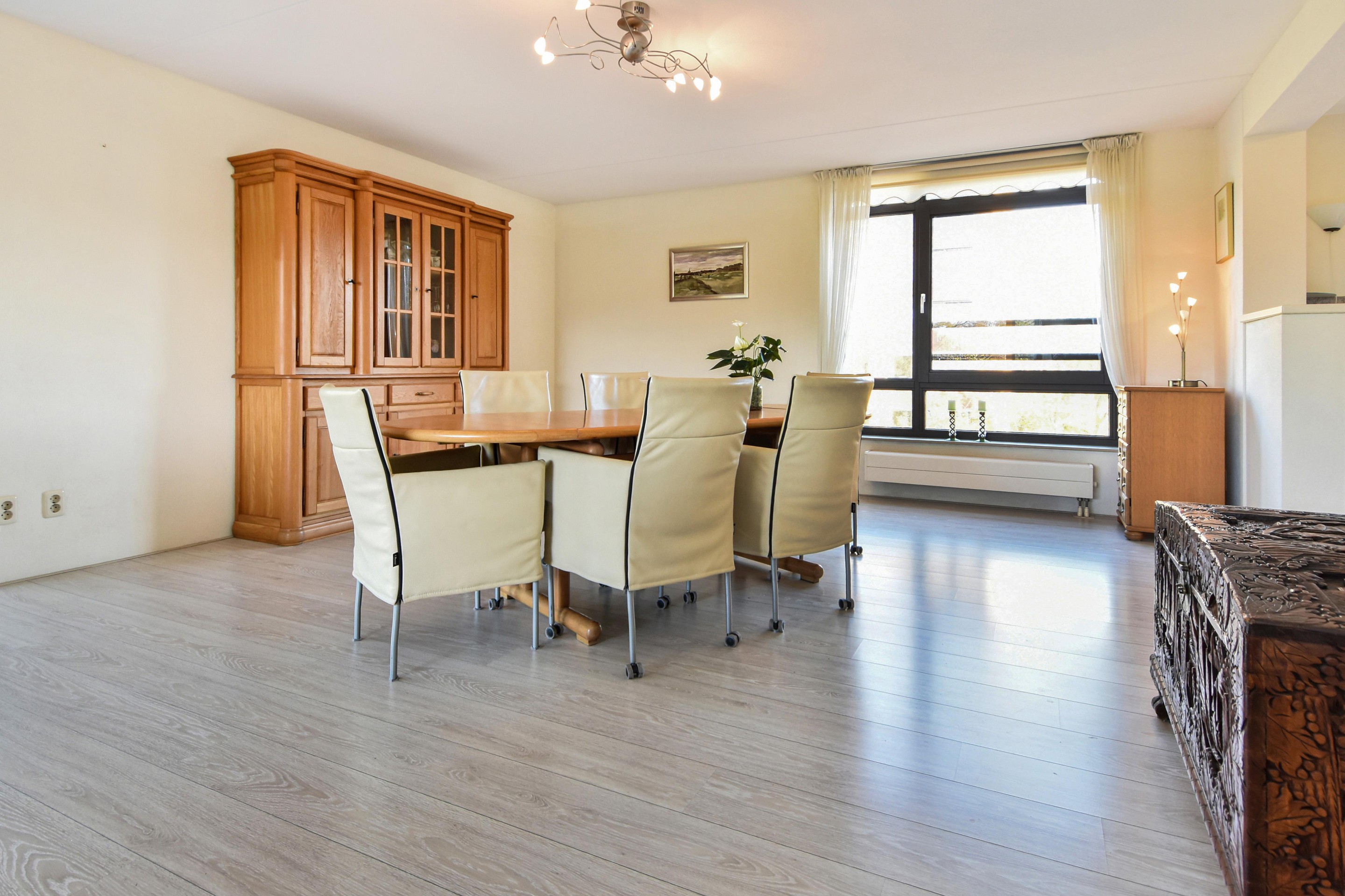 De ruime woon-/eetkamer is opvallend licht door de vele ramen aan drie zijden. Vanuit de comfortabele zithoek met schuifpui stapt u zo het zonnige balkon op, waar u tot laat op de dag van de zon kunt genieten. De brede raampartijen aan de ronde gevel zorgen voor een prachtig ruimtelijk gevoel en uitzicht over de straat.