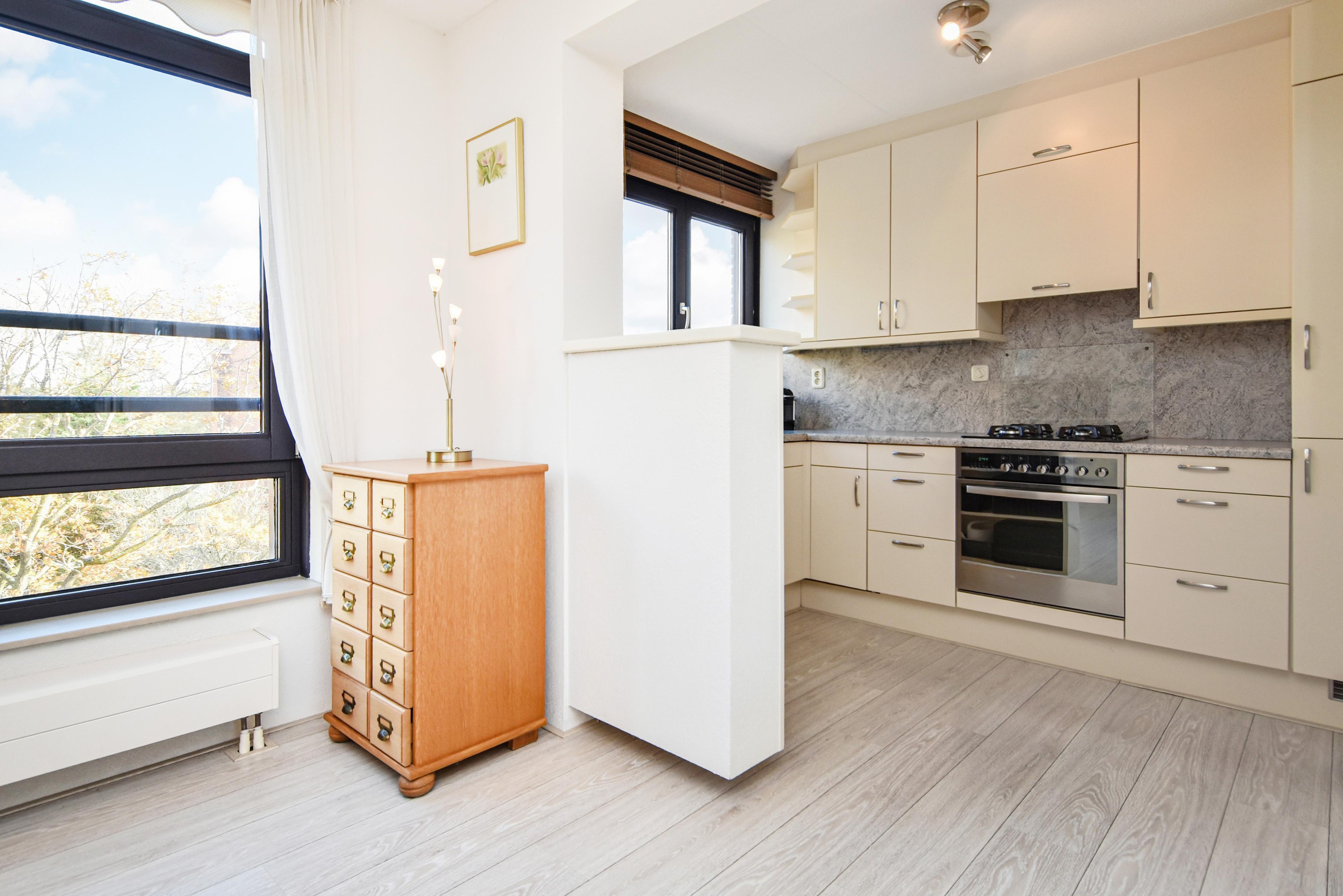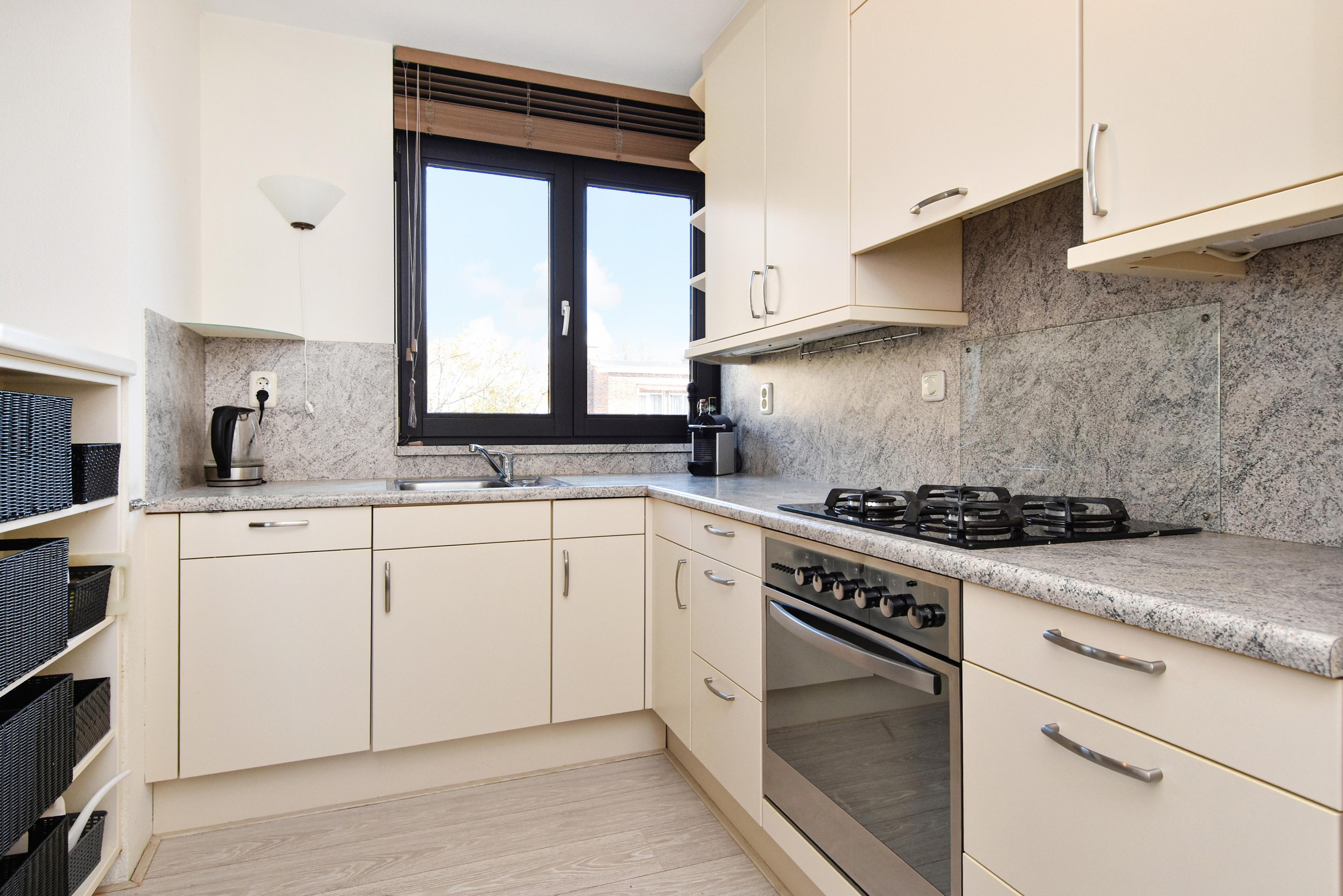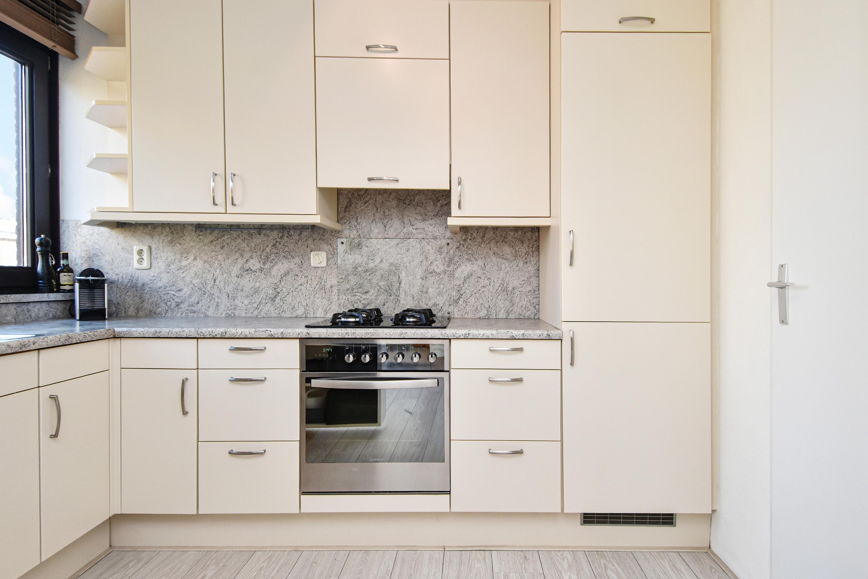 De halfopen L-vormige keuken is netjes onderhouden en voorzien van diverse inbouwapparatuur, waaronder een gasfornuis, oven, vaatwasser, afzuigkap en spoelbak. Aangrenzend bevindt zich een extra bergkast.