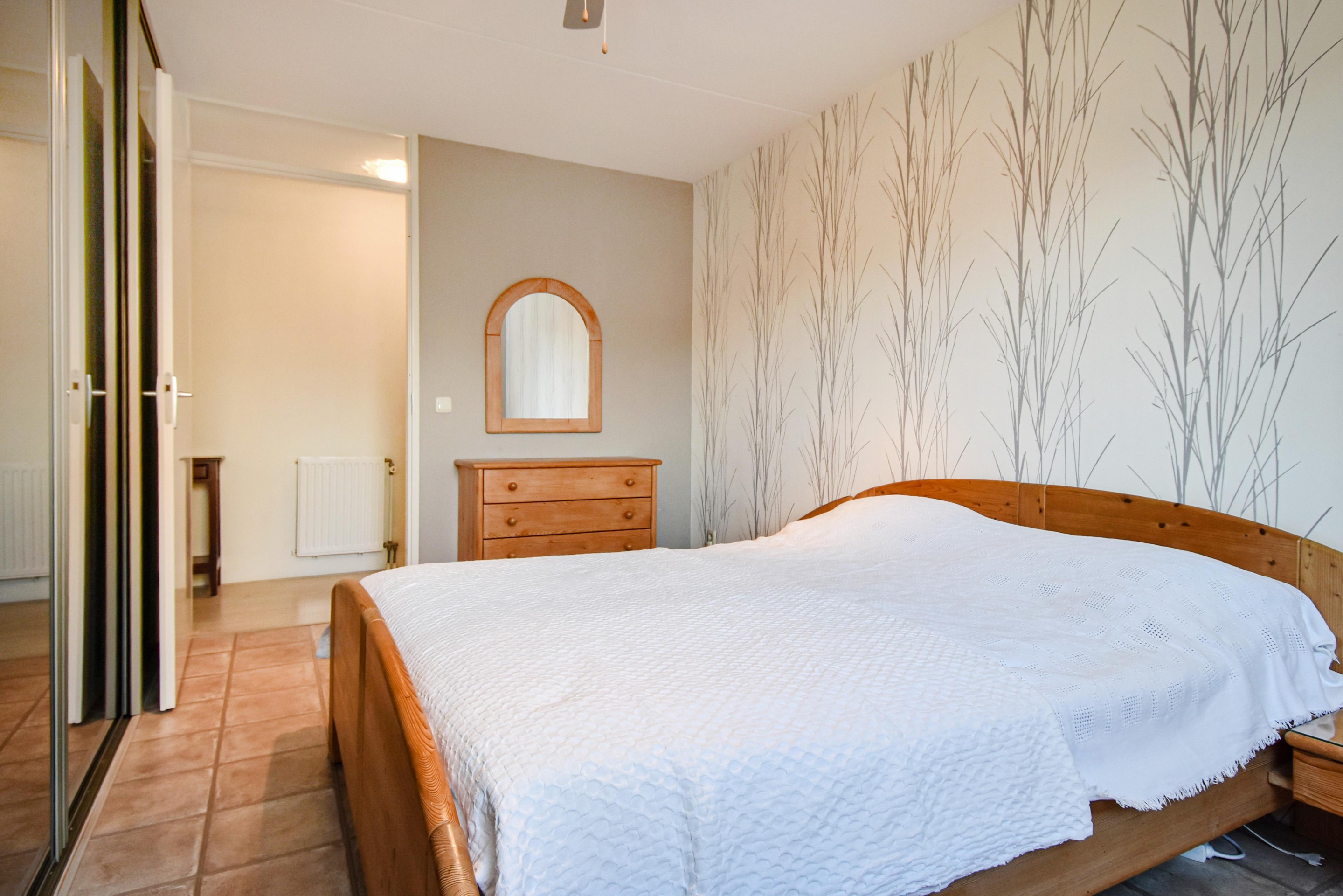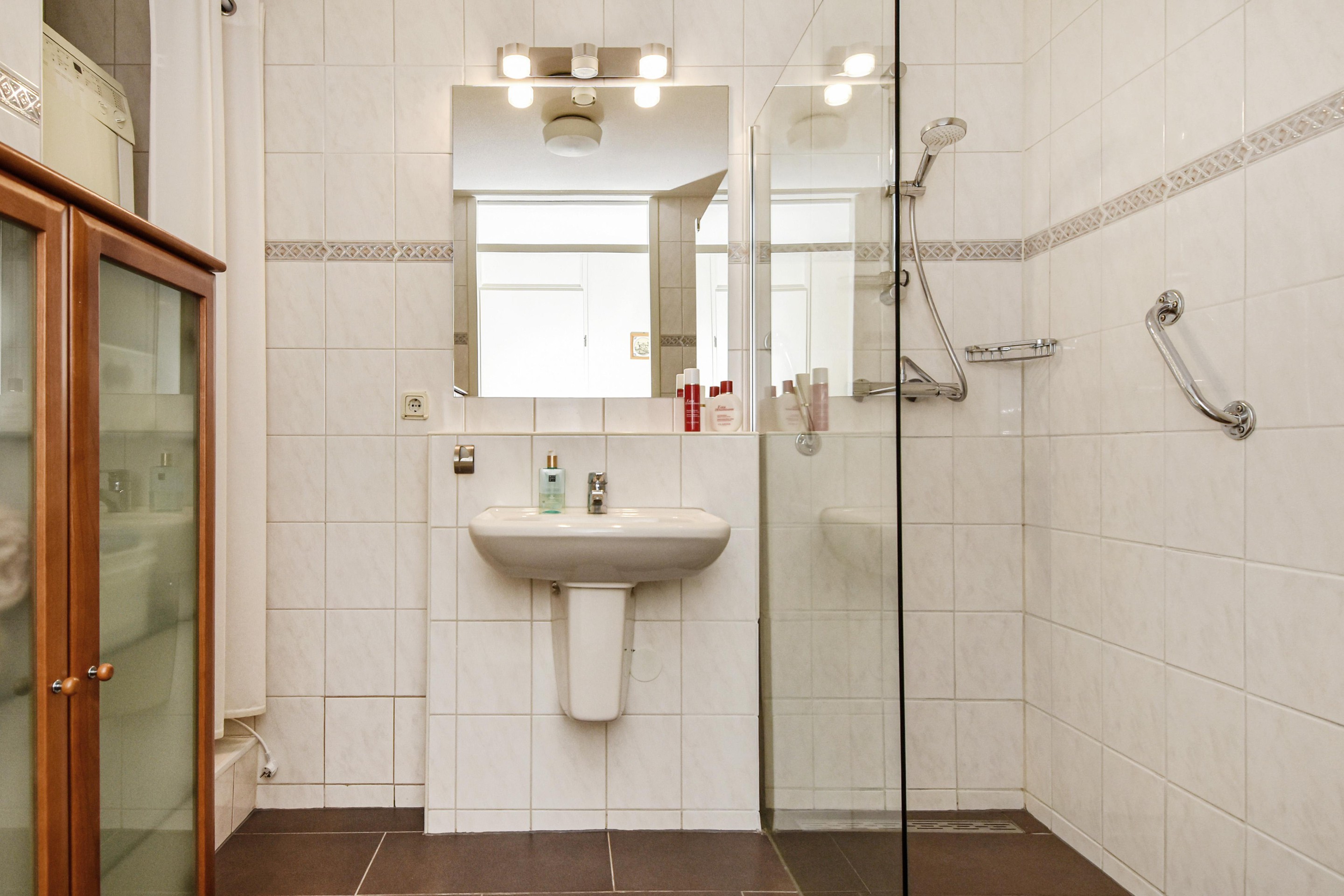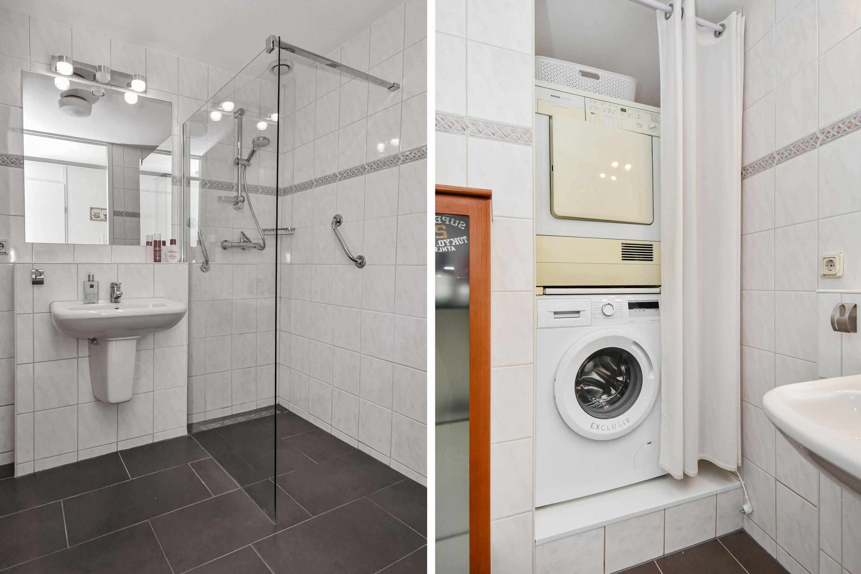 Ruime hoofdslaapkamer met vaste schuifkast en een tweede logeerkamer, ook met vaste kast. De badkamer is volledig betegeld en voorzien van een inloopdouche, wastafelmeubel en aansluitingen voor de wasmachine en droger.