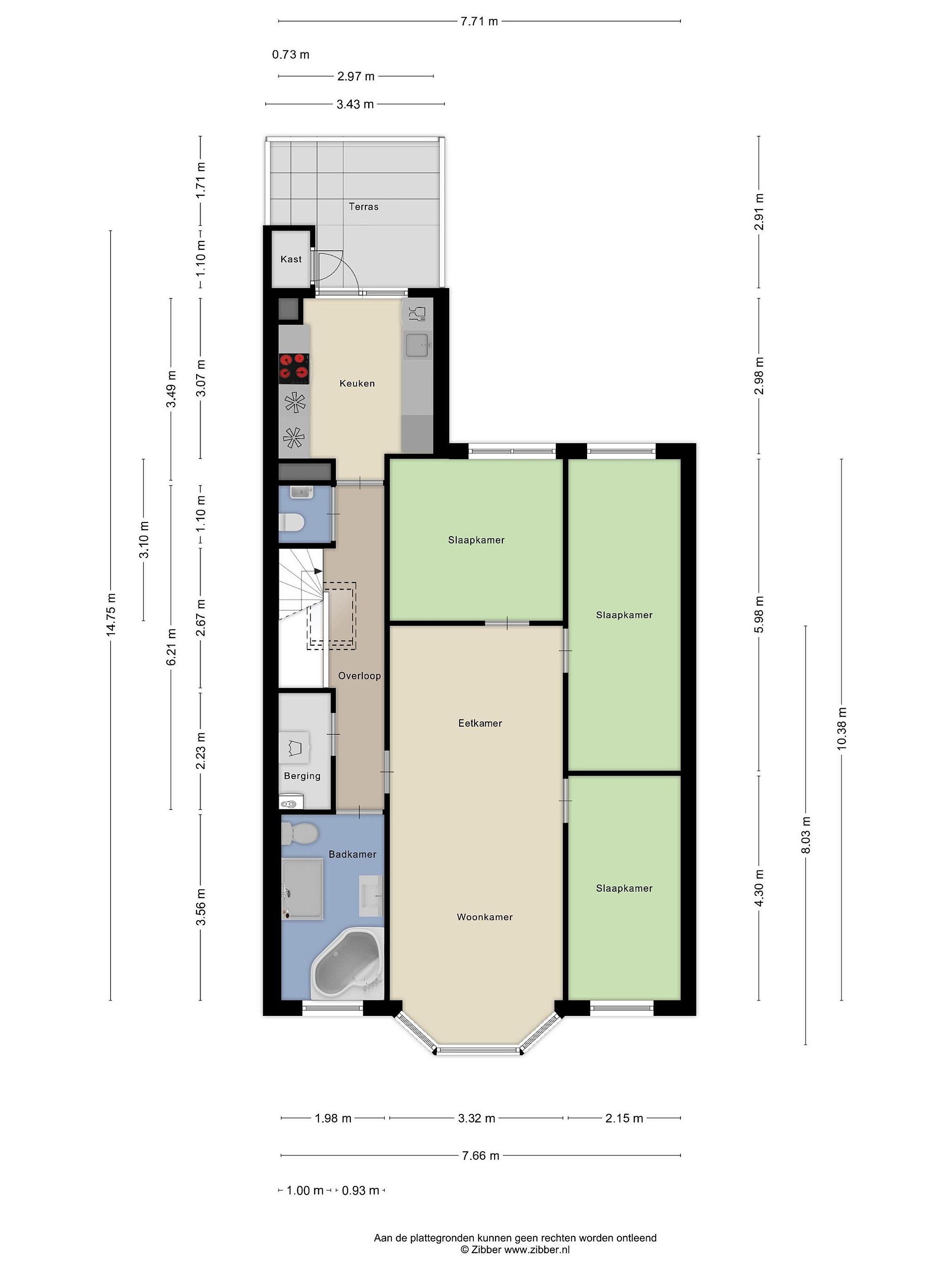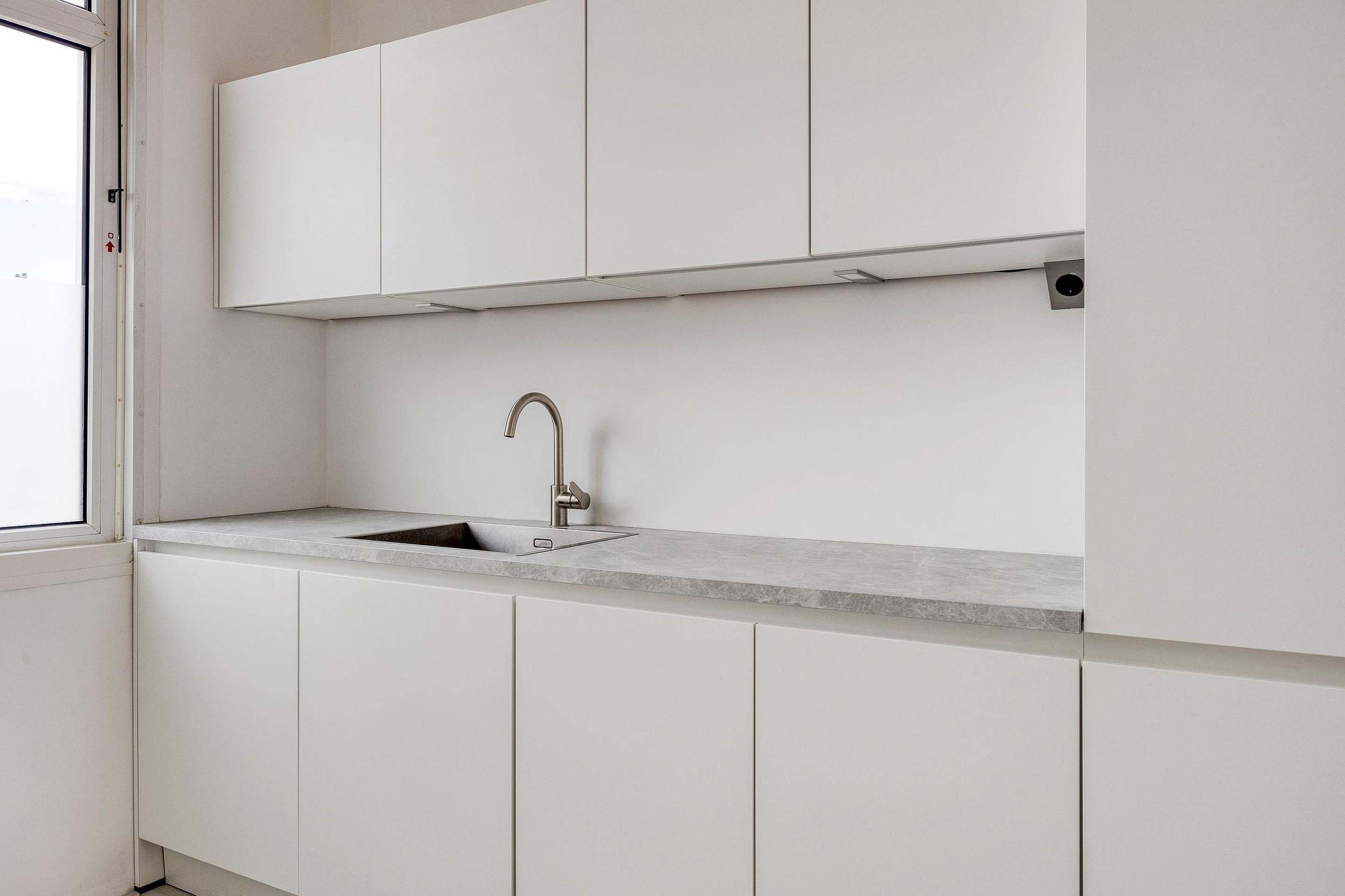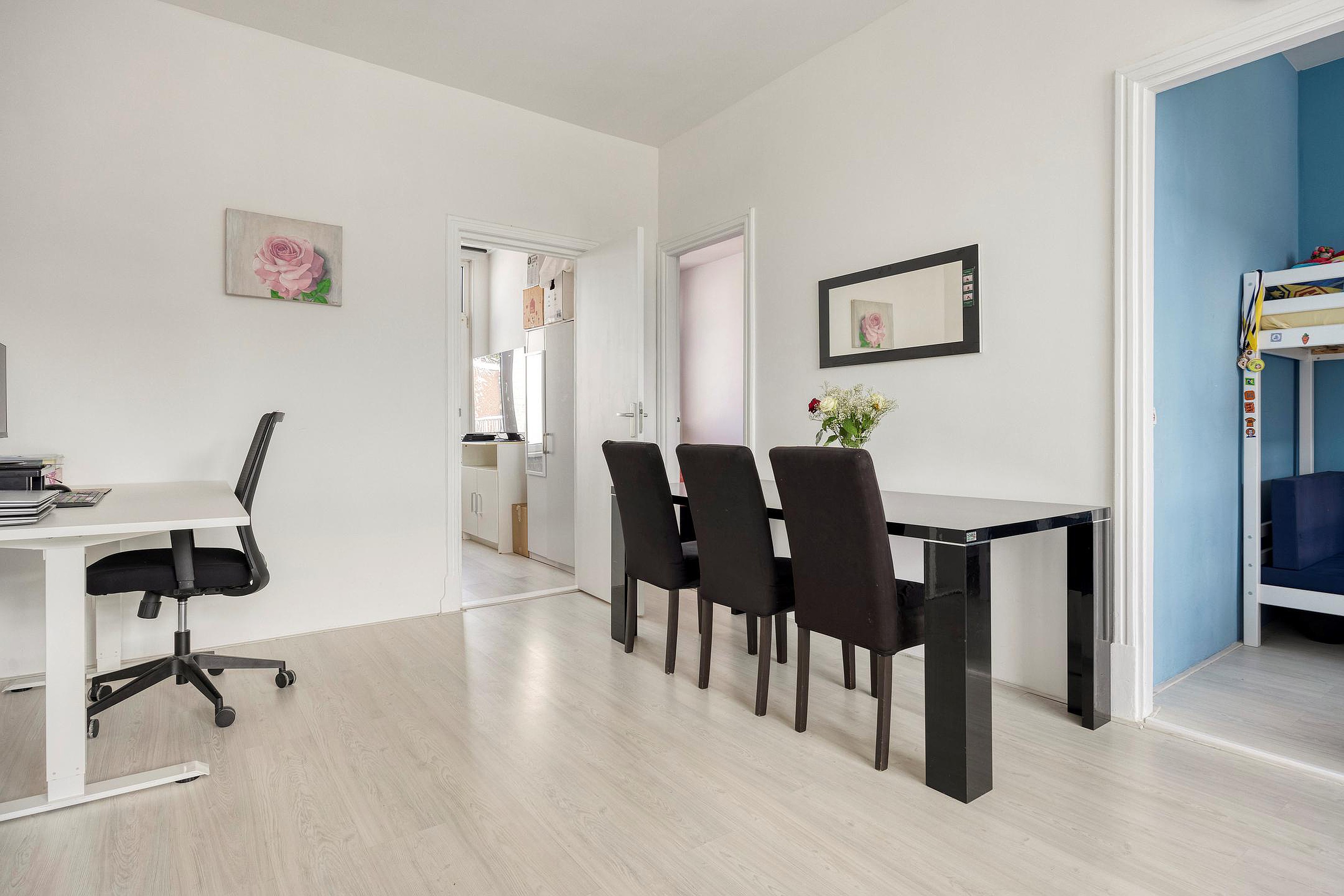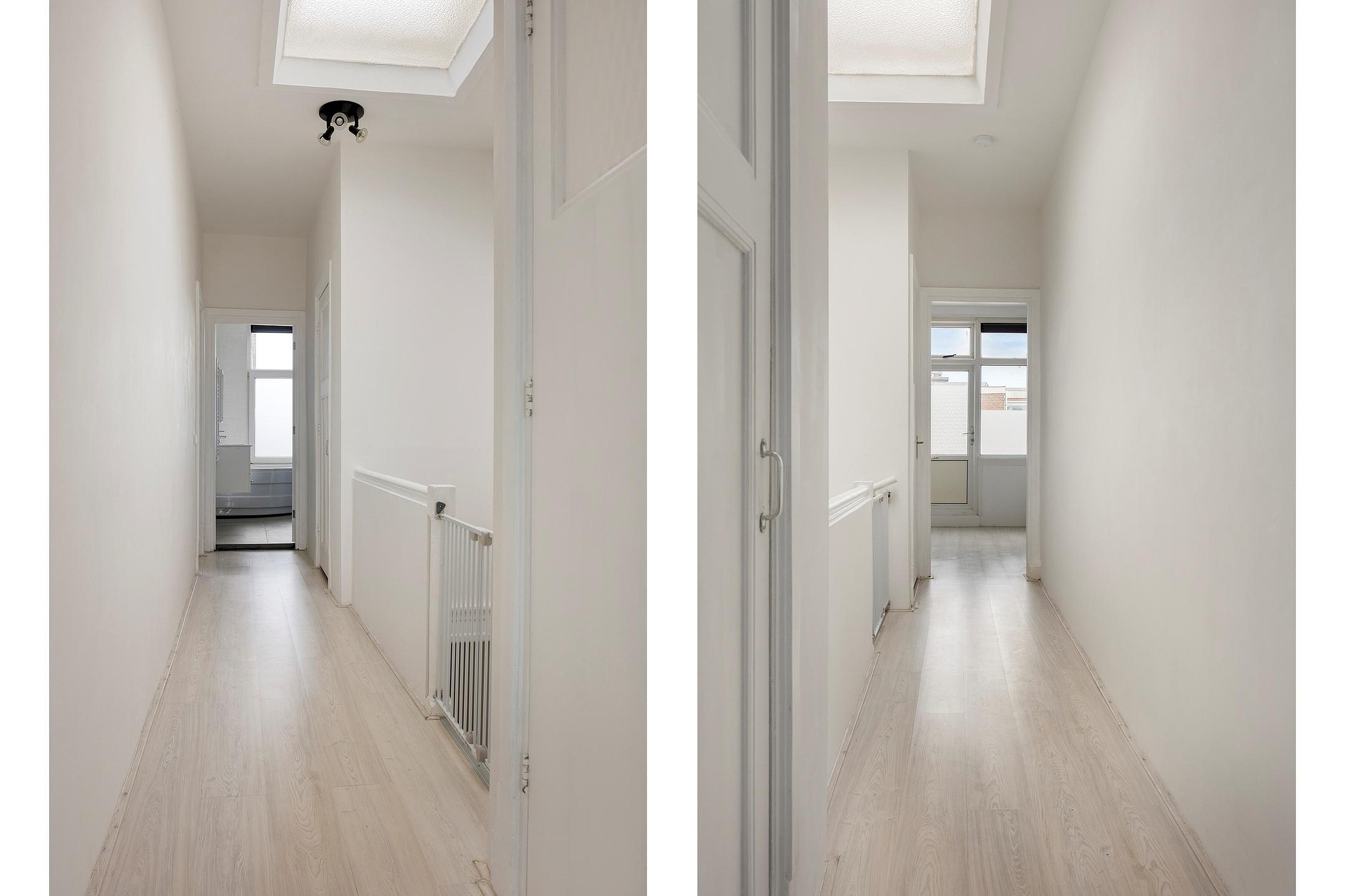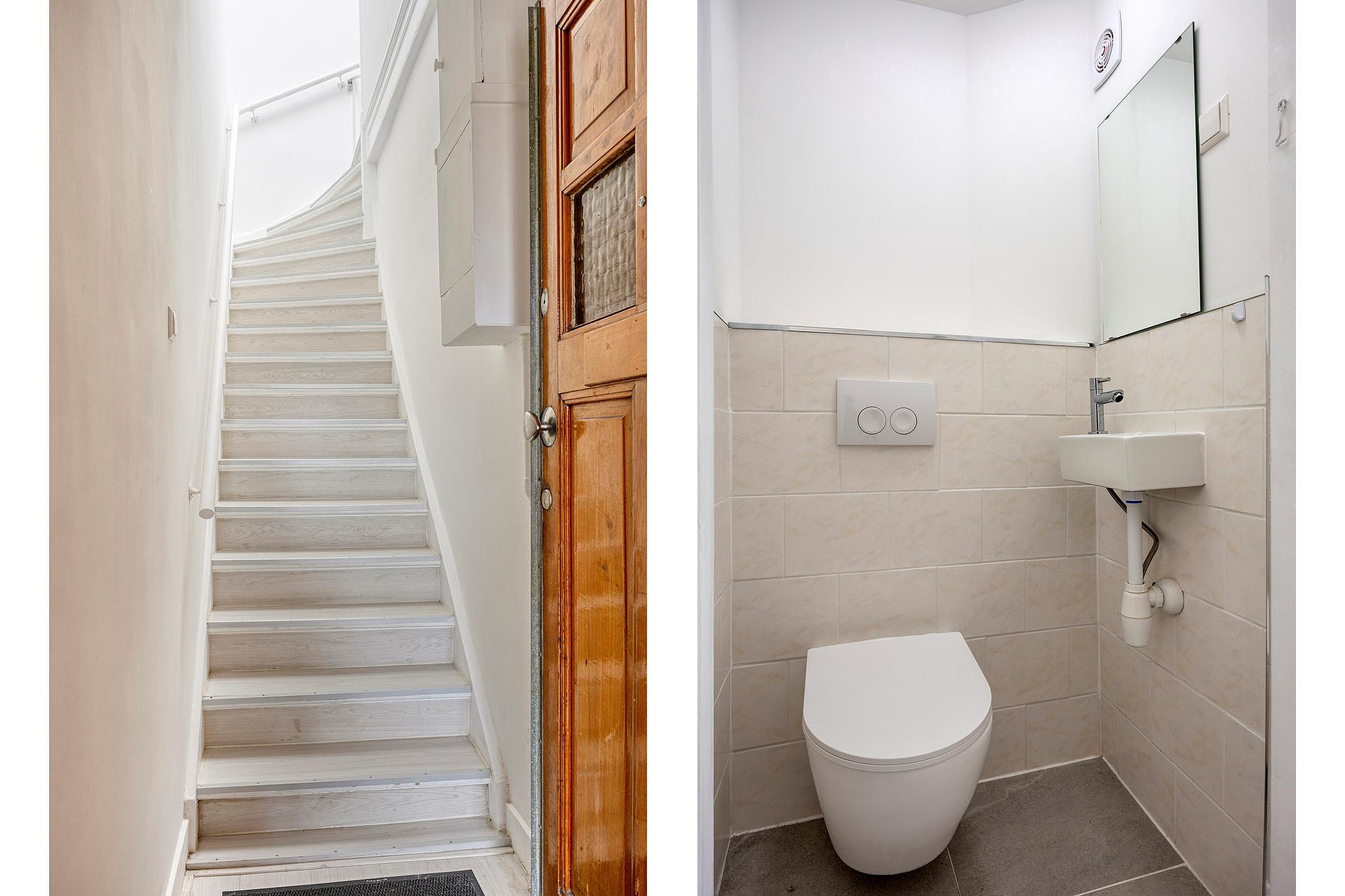 Via de entree en trapopgang kom je in de lichte hal. Links tref je de moderne open keuken: een heerlijke plek om te koken en samen te komen. Vanuit hier stap je direct het grote dakterras op, perfect om te genieten van een kop koffie in de ochtendzon of lange zomeravonden met vrienden. De berging op het terras zorgt voor extra gemak.