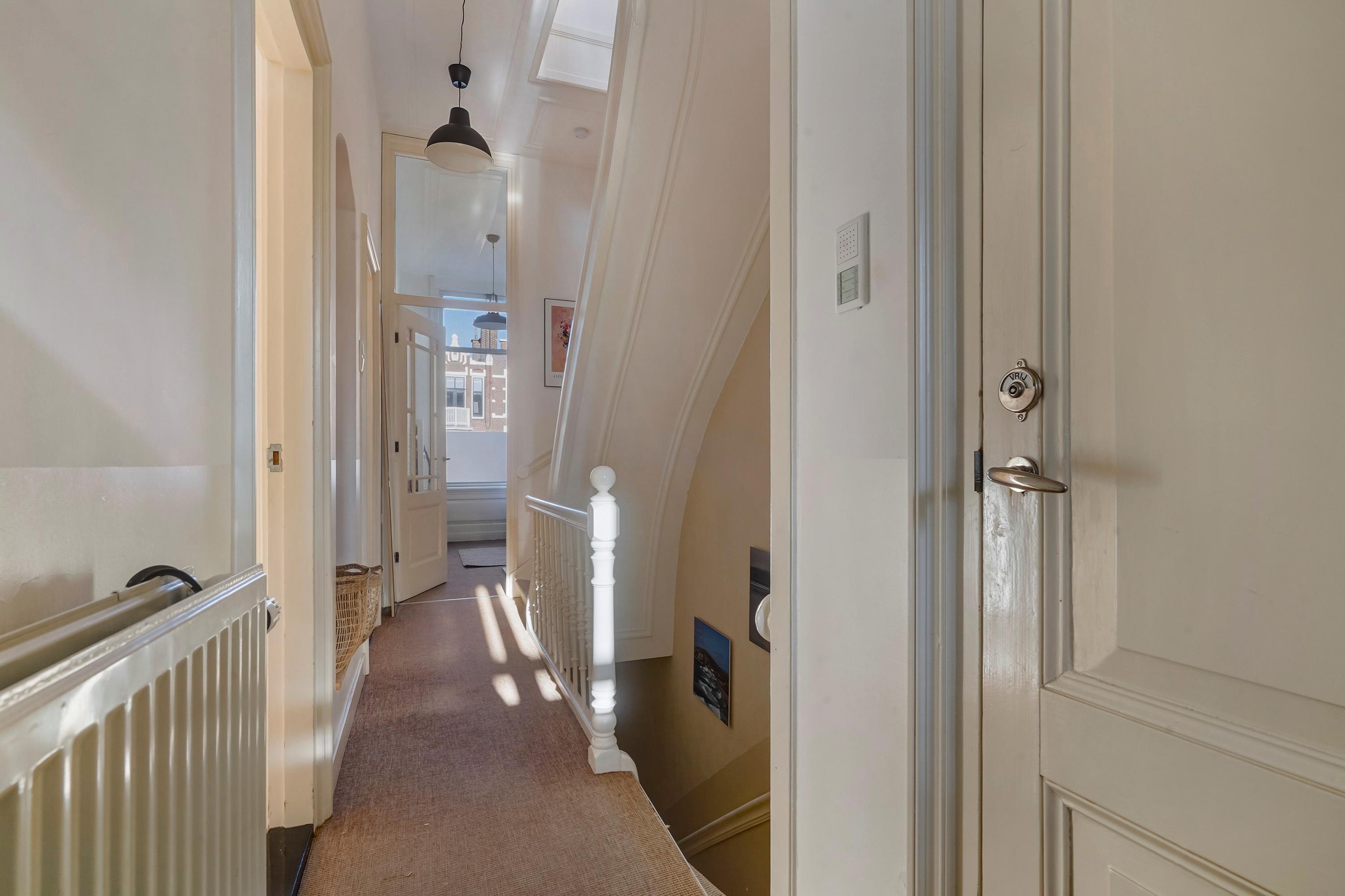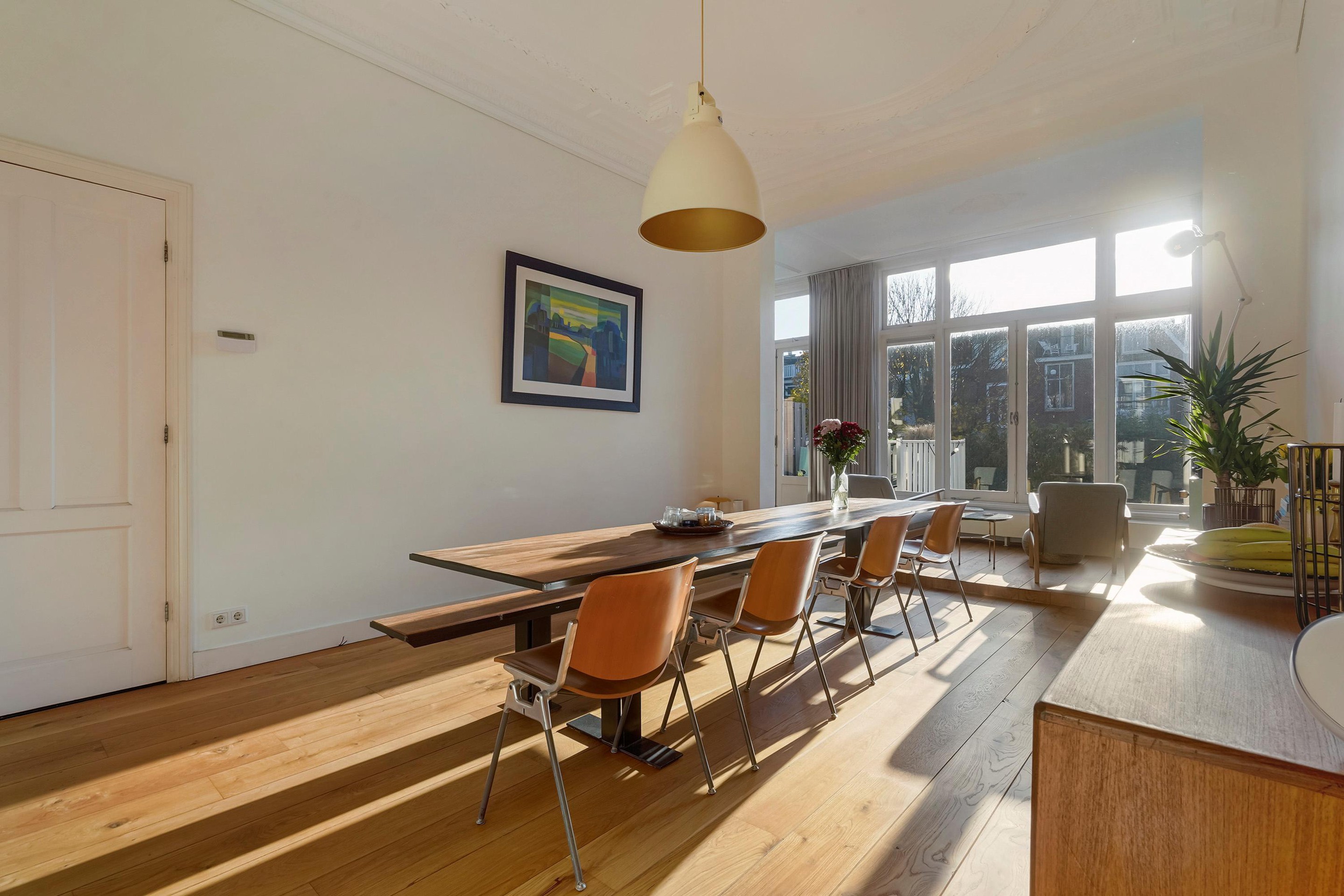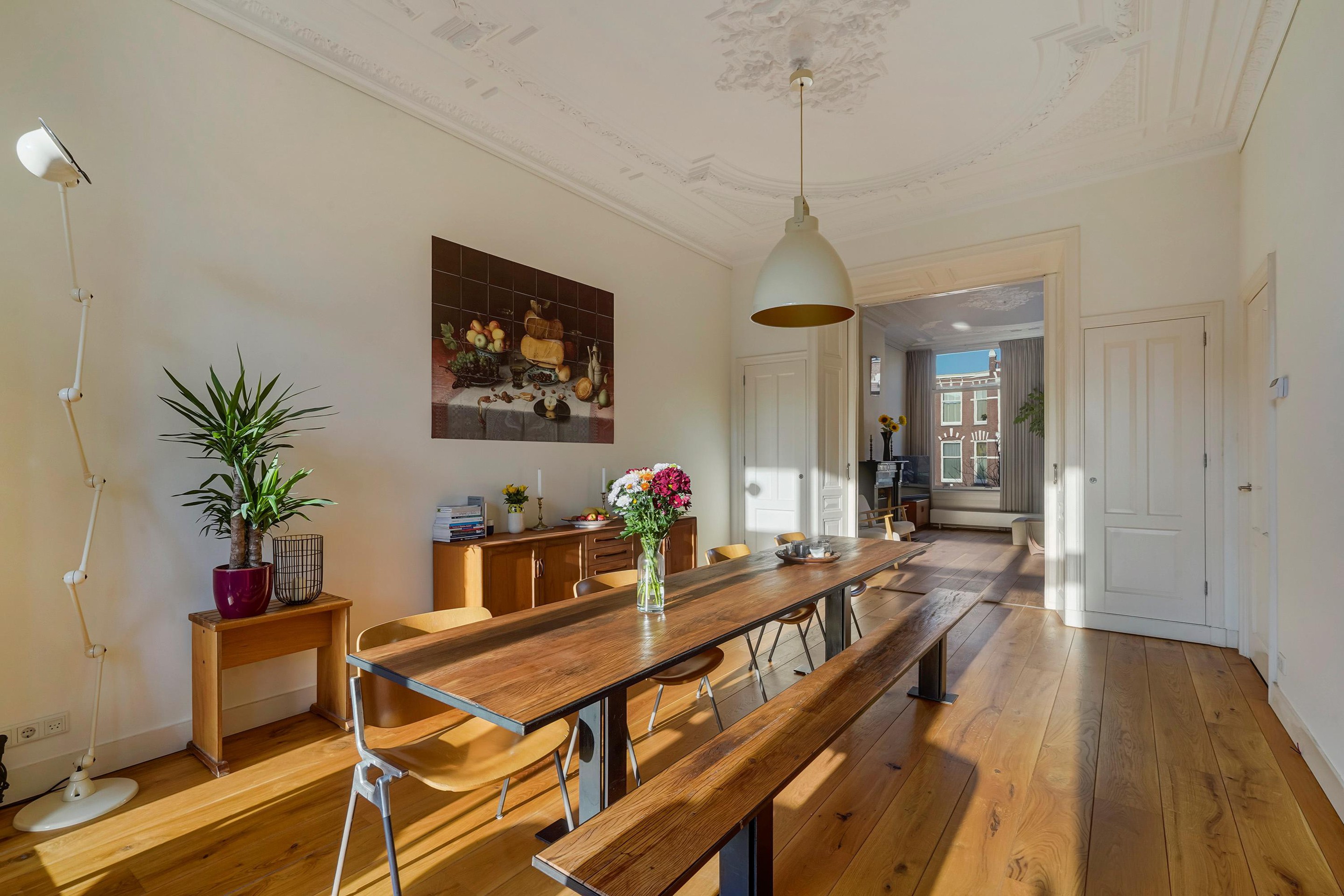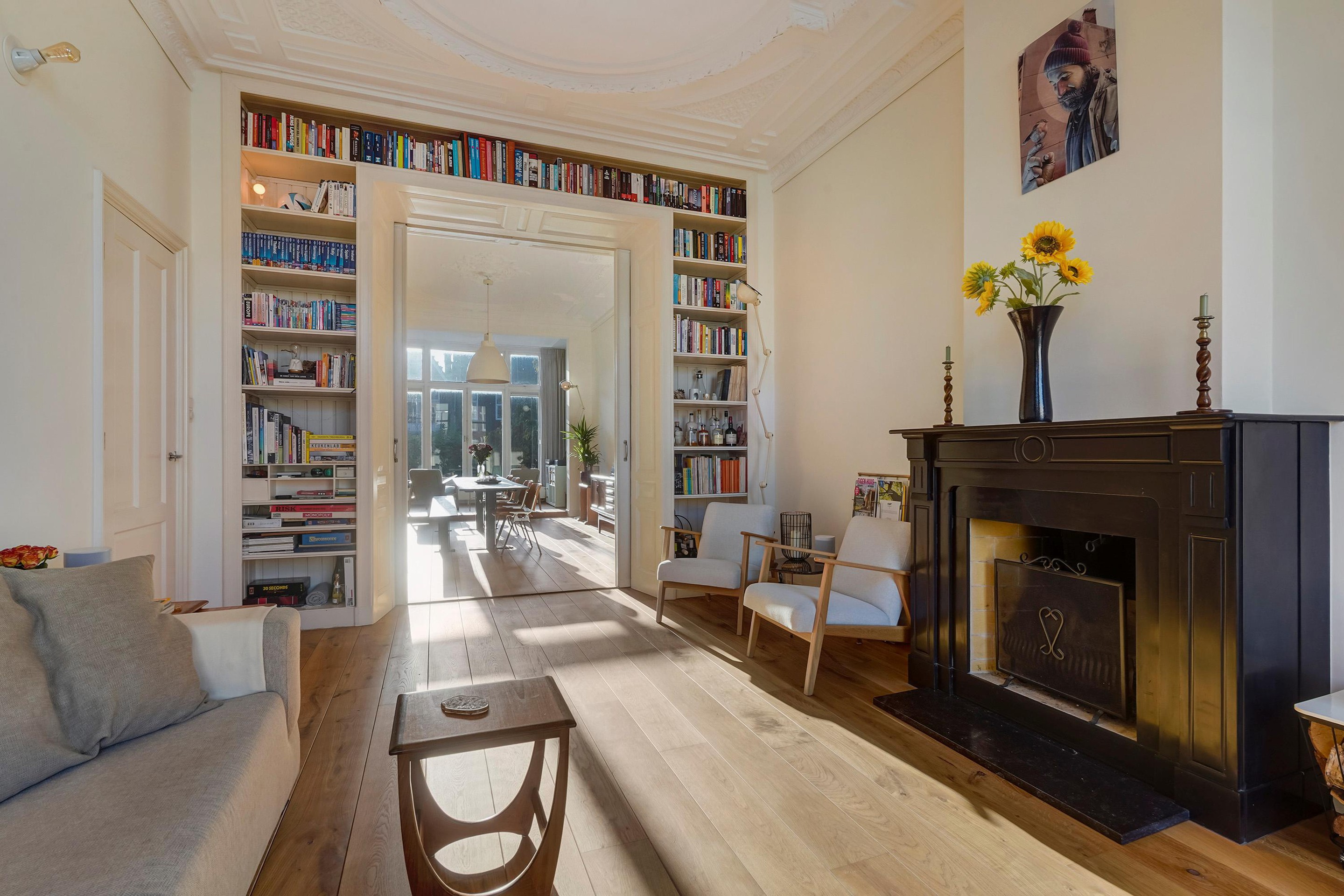 De woning is zeer riant opgezet en voorzien van diverse sfeervolle oude details waaronder de schuifseparatie, vaste kasten schouwen, paneel deuren en karakteristieke hoge plafonds met geweldige ornamenten.