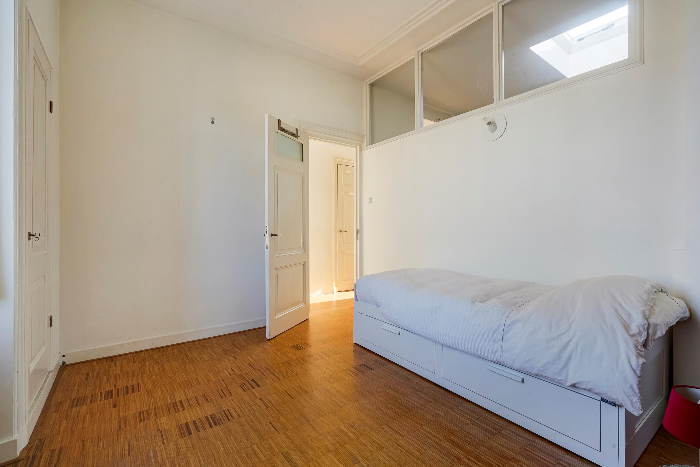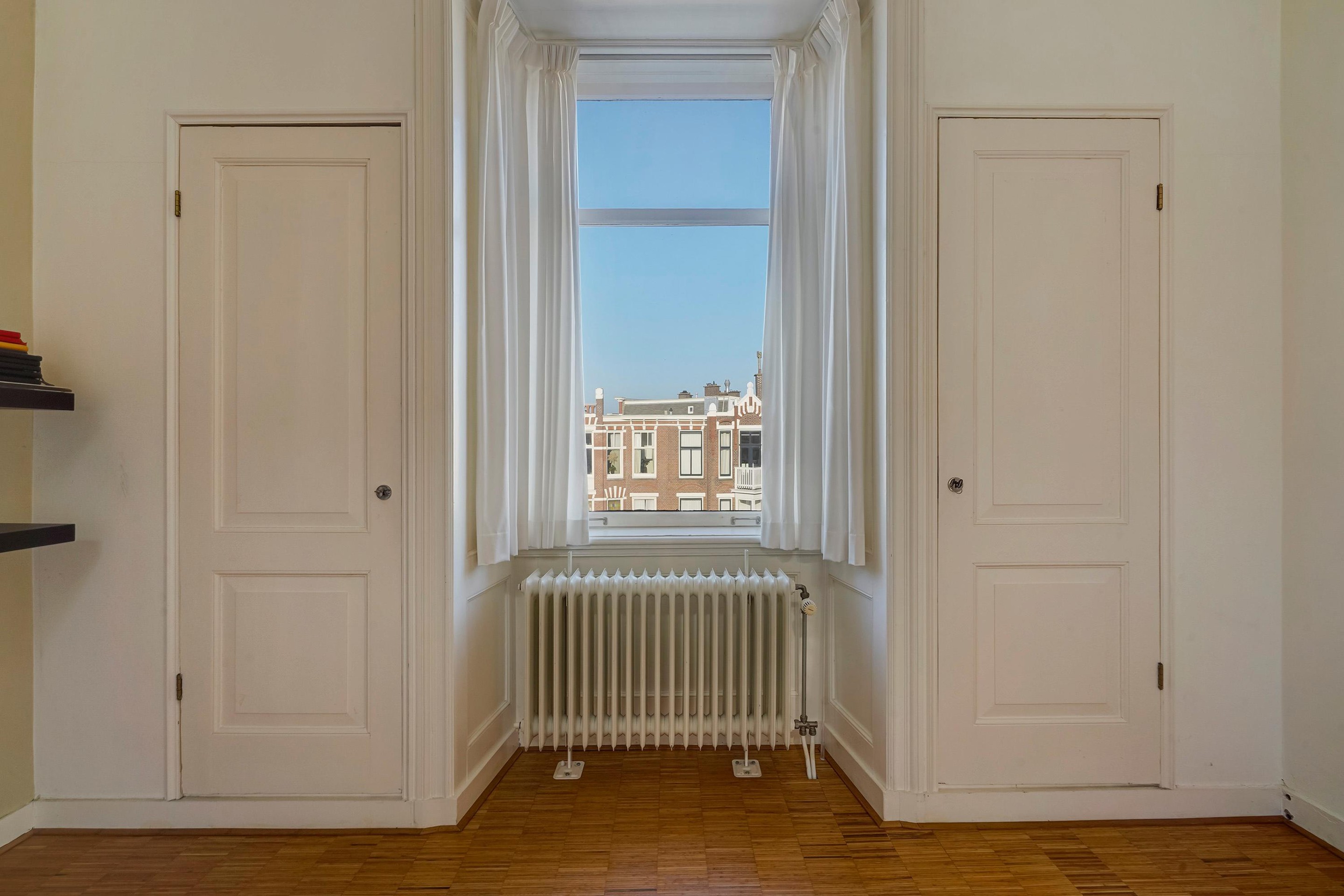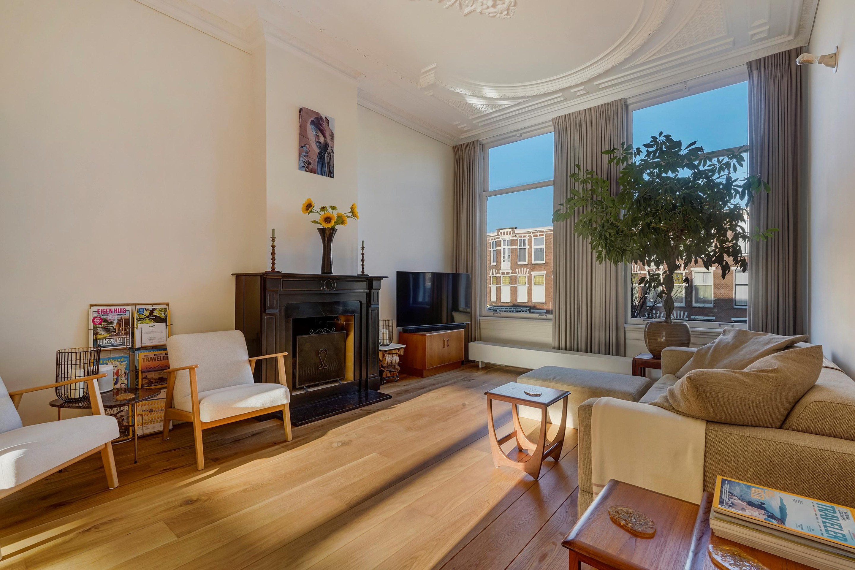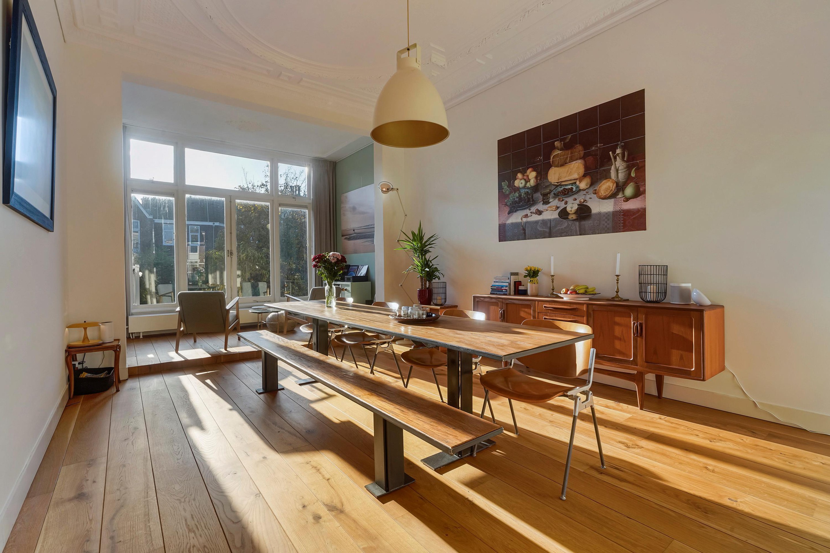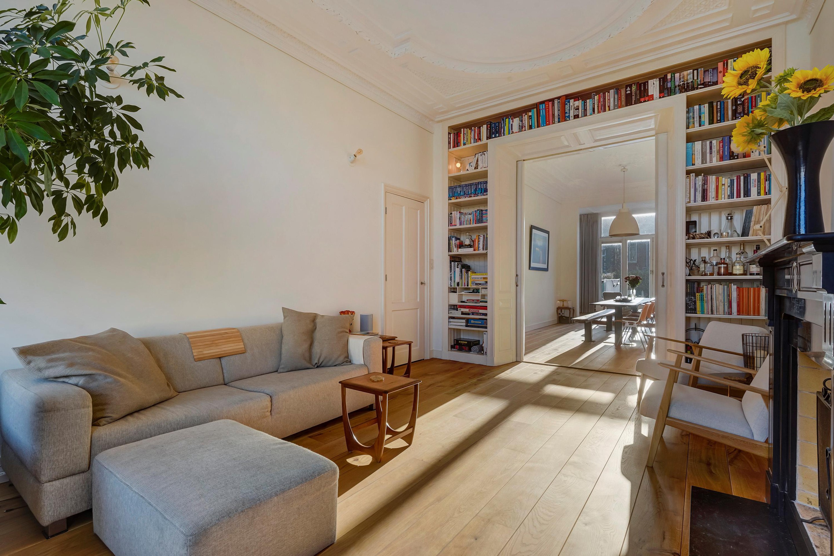 De woning is zeer riant opgezet en voorzien van diverse sfeervolle oude details waaronder de schuifseparatie, vaste kasten schouwen, paneel deuren en karakteristieke hoge plafonds met geweldige ornamenten.