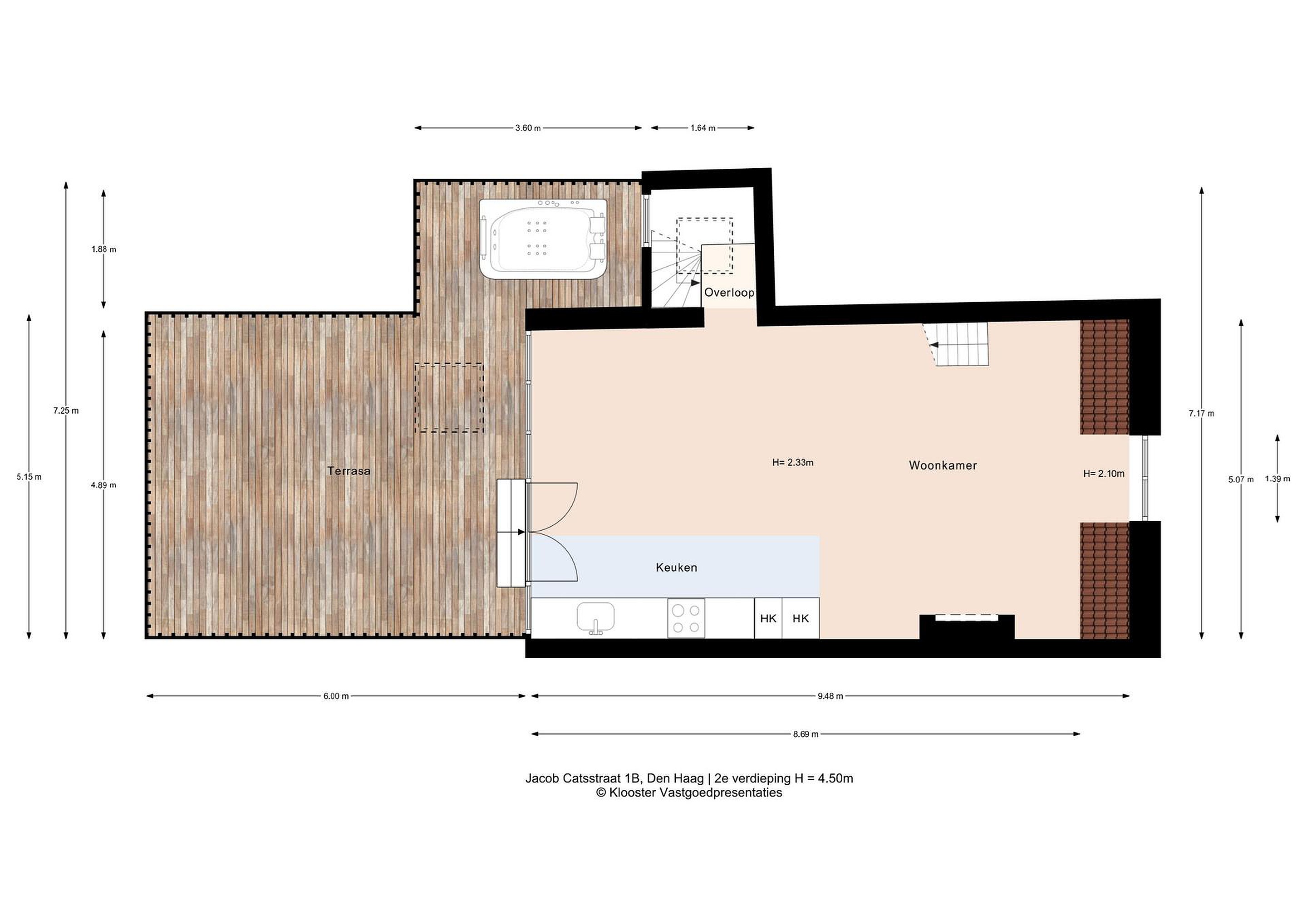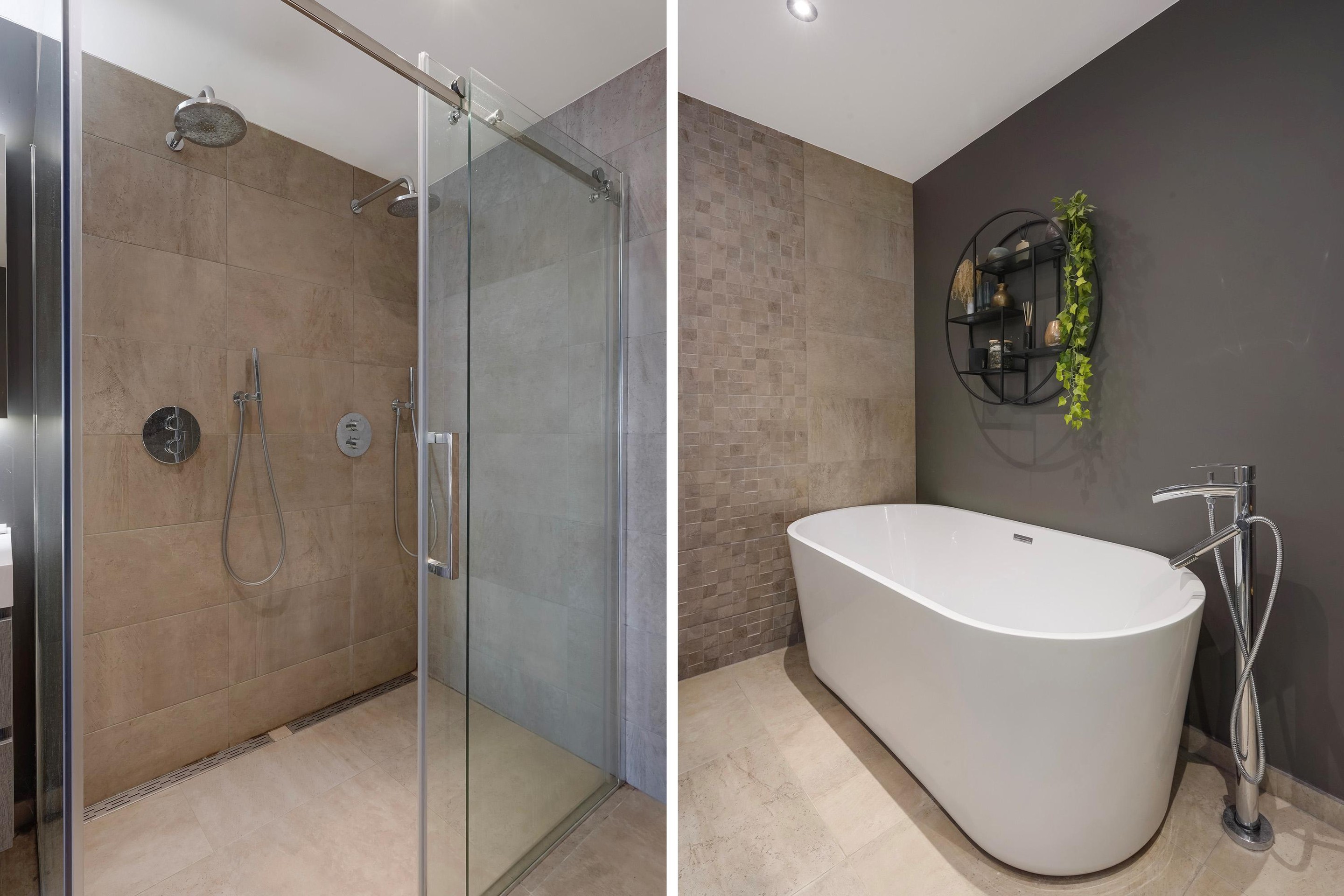 Begane grond De woning is toegankelijk via de begane grond, een hal met meterkast en een binnentrappenhuis naar de eerste verdieping. Op de overloop bevindt zich een ruime slaapkamer aan de voorzijde. De hoofdslaapkamer is aan de achterzijde gelegen en is zeer ruim, met veel opbergruimte, een inloopkast en een en-suite badkamer. De badkamer is voorzien van een dubbele douche, een ligbad, een dubbele wastafel en elektrische vloerverwarming. De aangrenzende kamer wordt momenteel gebruikt als studeerkamer/kantoor. De tweede badkamer is een absolute aanrader voor gasten en beschikt over een douche, wastafel, mechanische ventilatie, een aansluiting voor een wasmachine en een cv-ketel. Op de overloop bevindt zich een ruime inbouwkast. Een vaste trap leidt naar de tweede verdieping, die momenteel in gebruik is als woon-/eetkamer met een open keuken, toegang tot het ruime terras en de mezzanine. De woonkamer is ruim en de open keuken is uitgerust met een 4-pits inductiekookplaat, vaatwasser, oven en koelkast/vriezer. De woon-/eetkamer geeft ook toegang tot het ruime en zonnige terras, dat is voorzien van een nieuwe composietvloer en een jacuzzi. De mezzanine is een welkome extra ruimte.