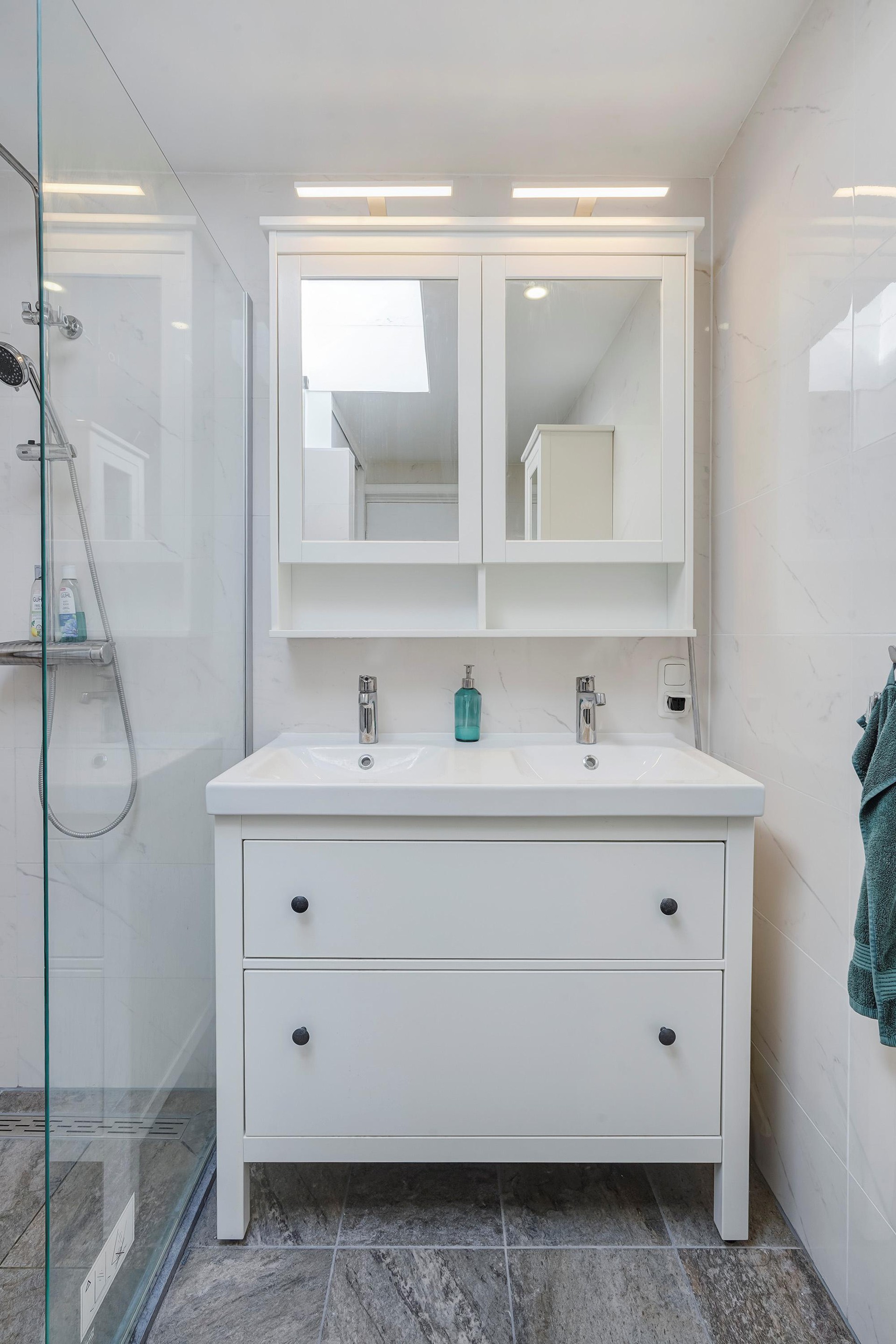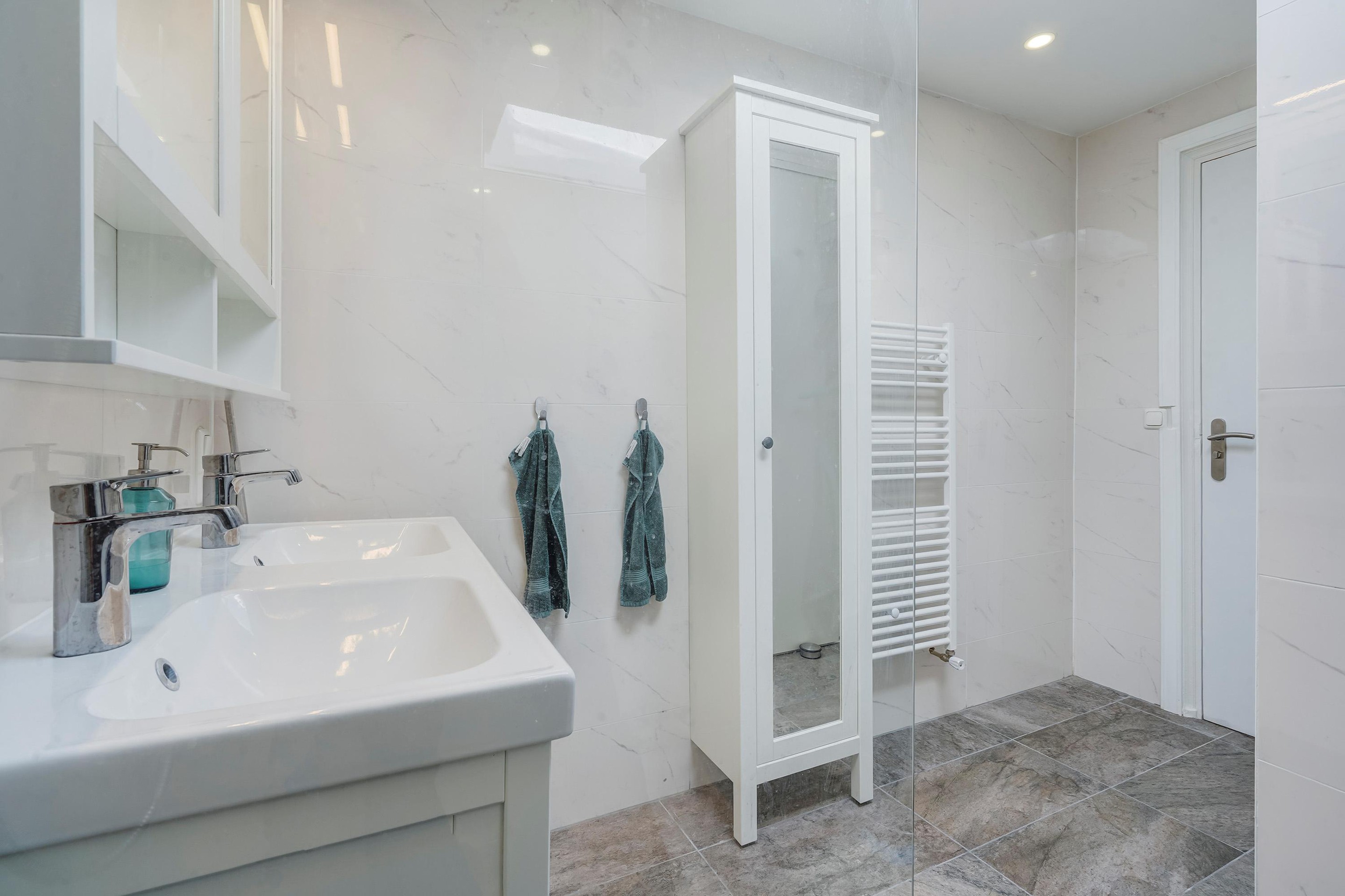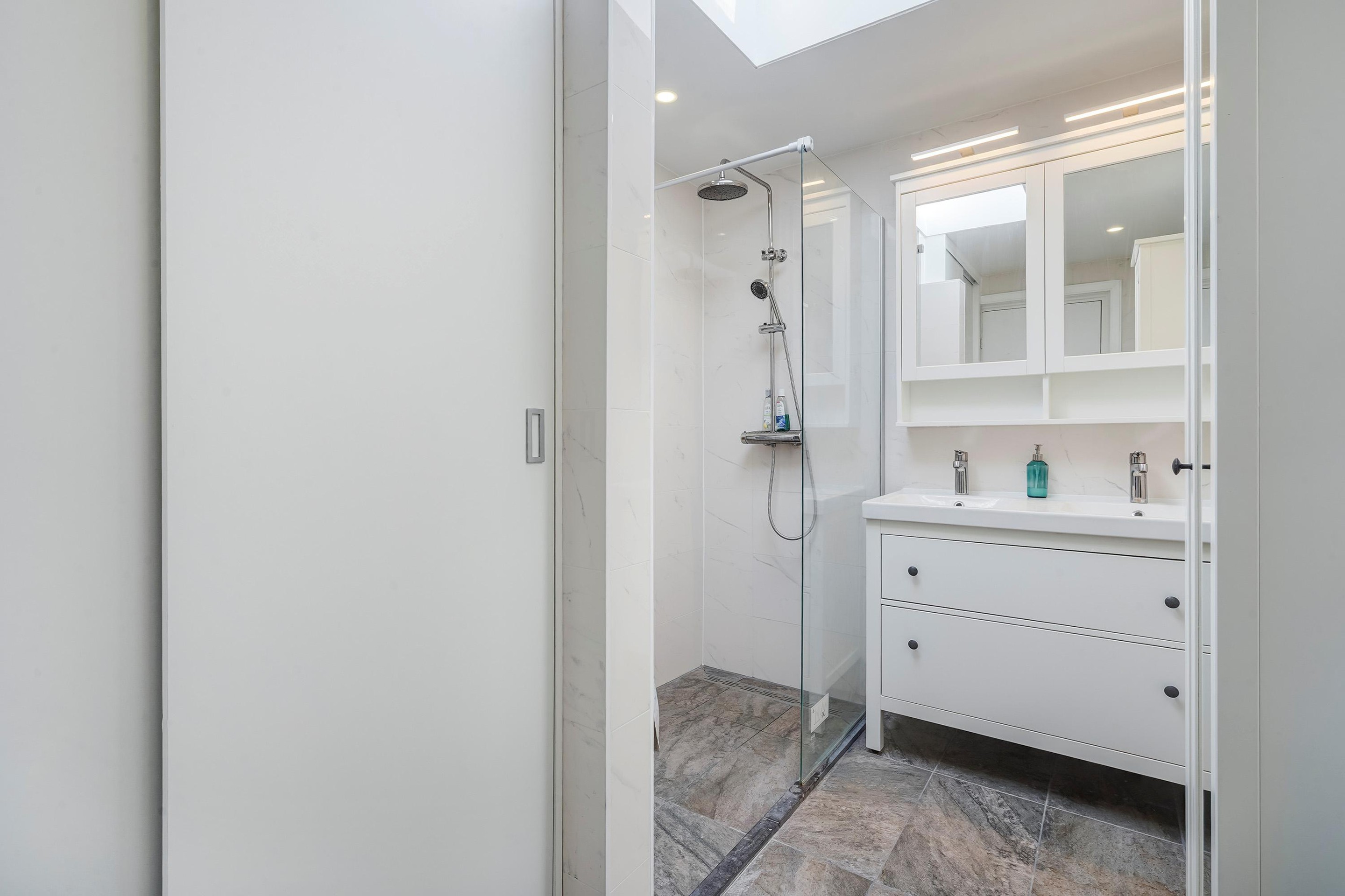 The bathroom is located between the two bedrooms. The bathroom also has a skylight. The bathroom has a walk-in shower, a double sink with cabinets, and a designer radiator. A neat cupboard has been built in the bathroom, where the washing machine and the central heating combi boiler are located.