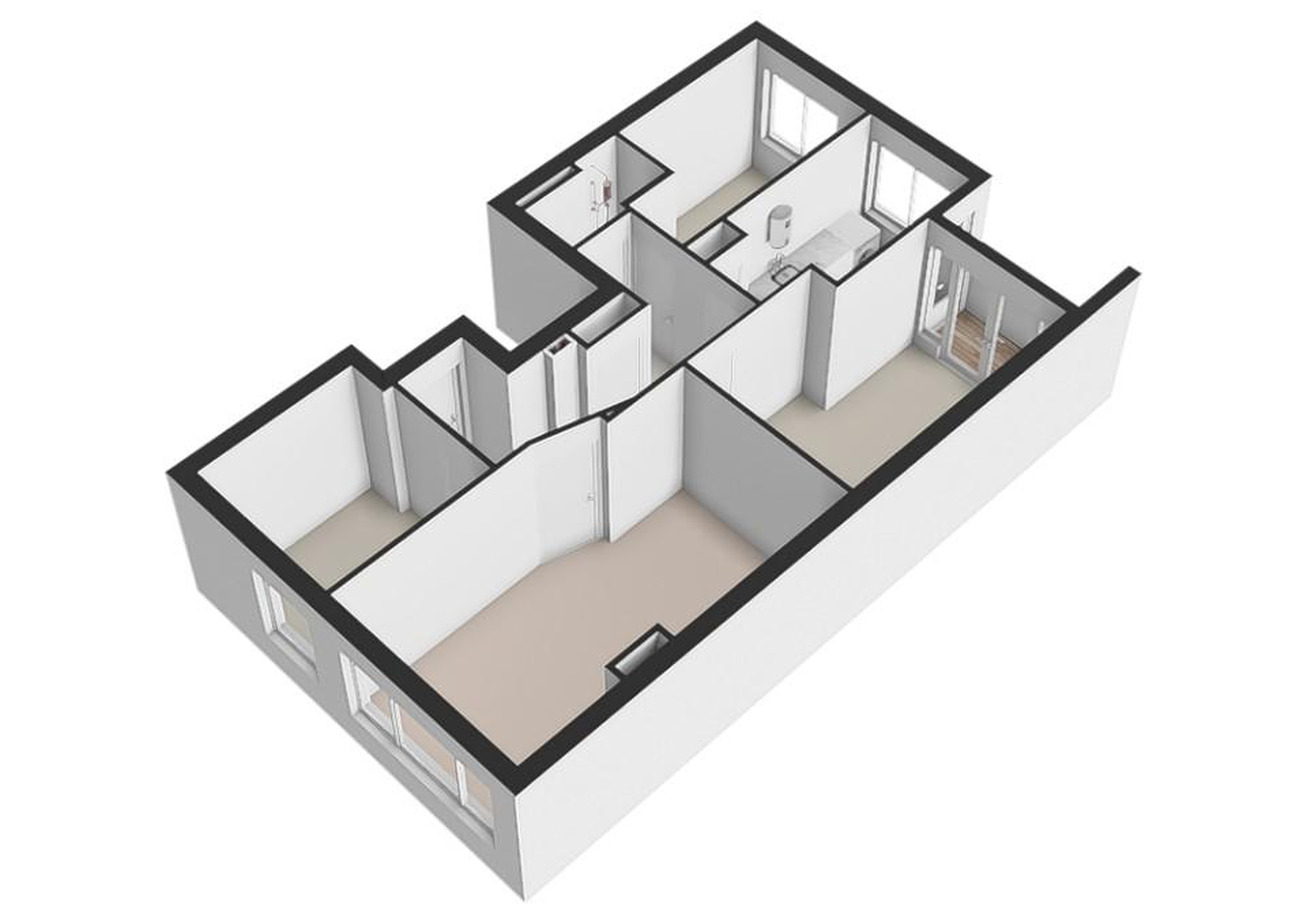 De tweede en derde slaapkamer grenzen aan de keuken en bieden veel flexibiliteit: gebruik ze als kinderkamer, werkruimte, logeerkamer of zelfs als hobbyruimte. De badkamer is eenvoudig en toe aan modernisering, maar biedt voldoende ruimte om een praktische, moderne badkamer te realiseren.