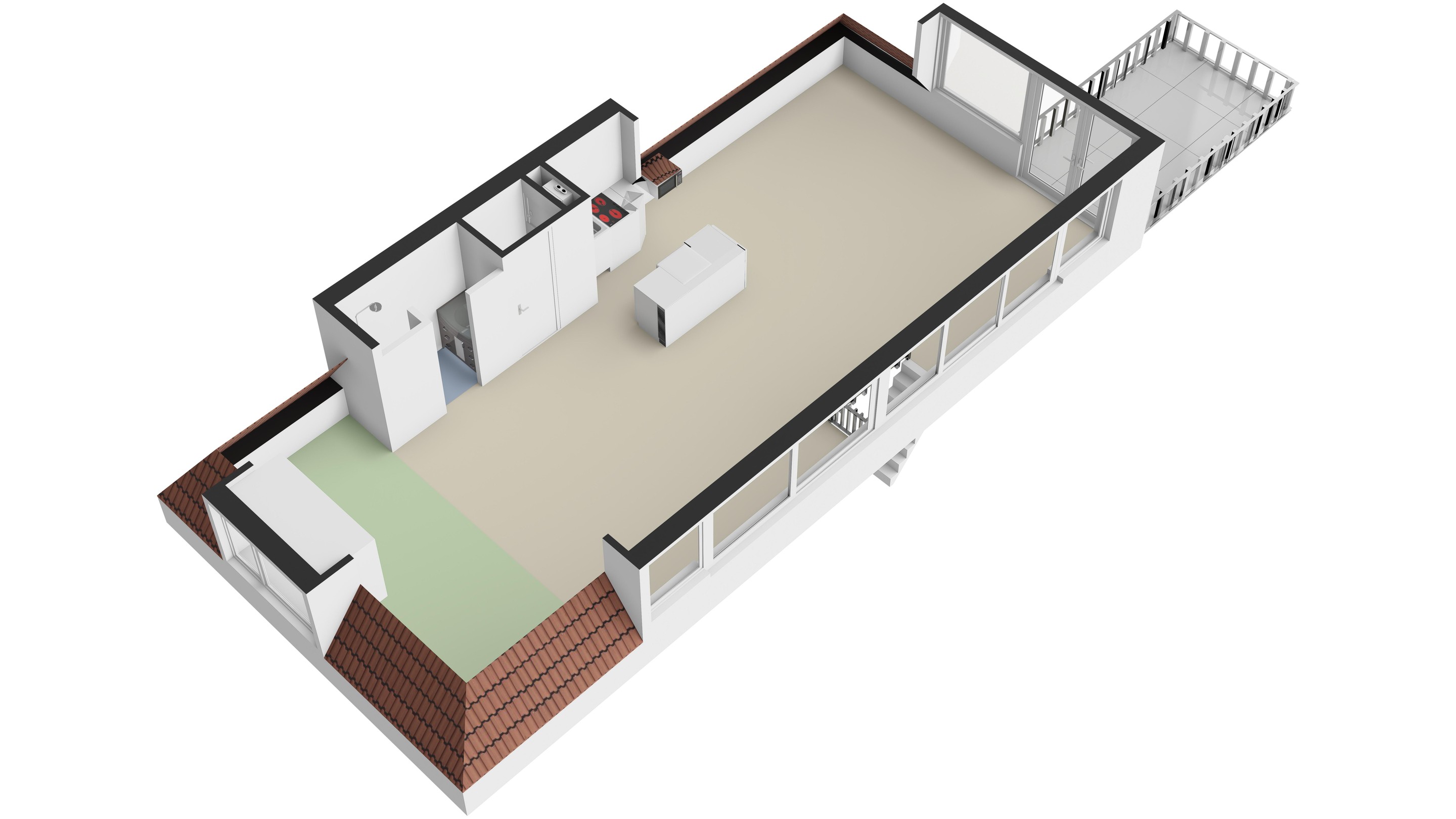 Eén grote ruimte, waarin de verschillende woonfuncties verenigd zijn: koken, eten, douchen, slapen en genieten buiten op het dakterras.