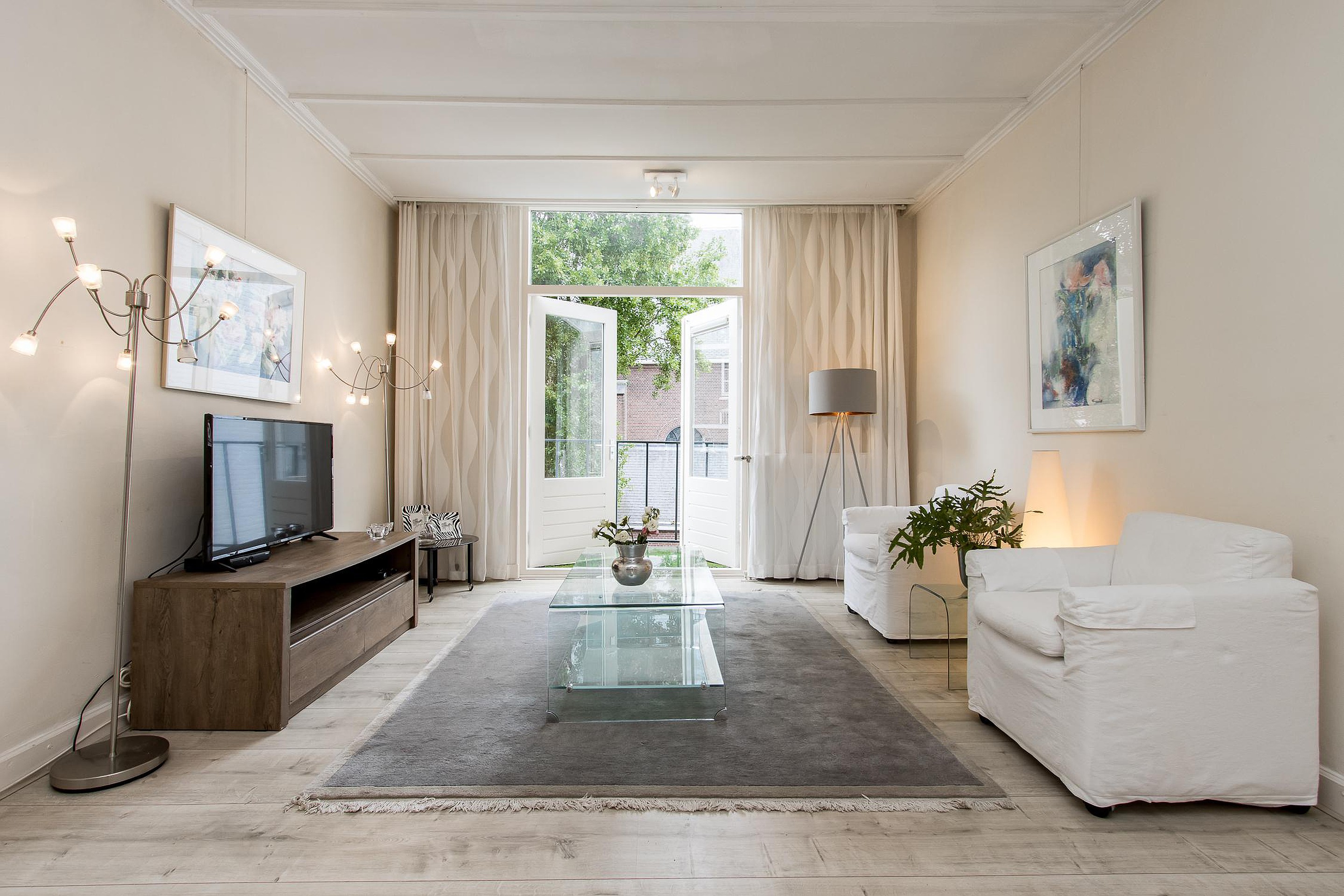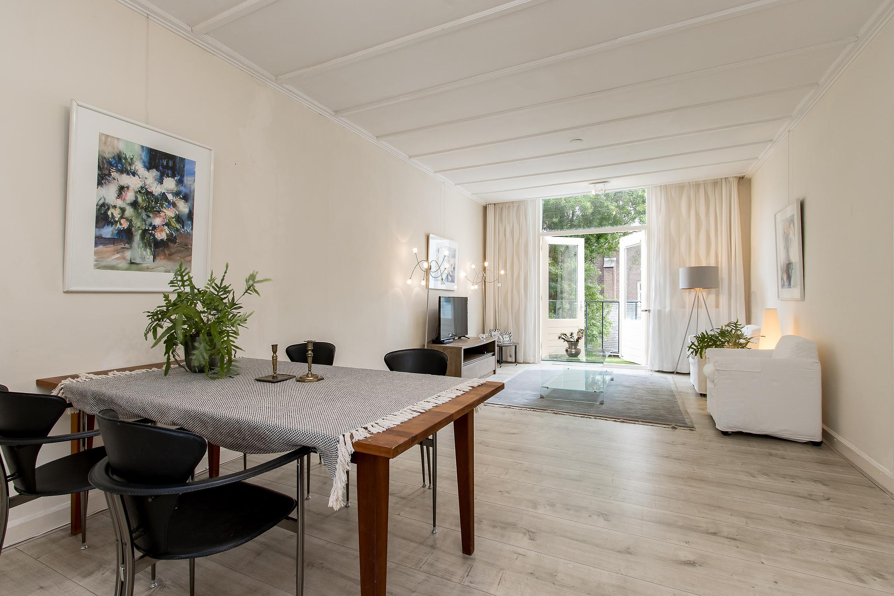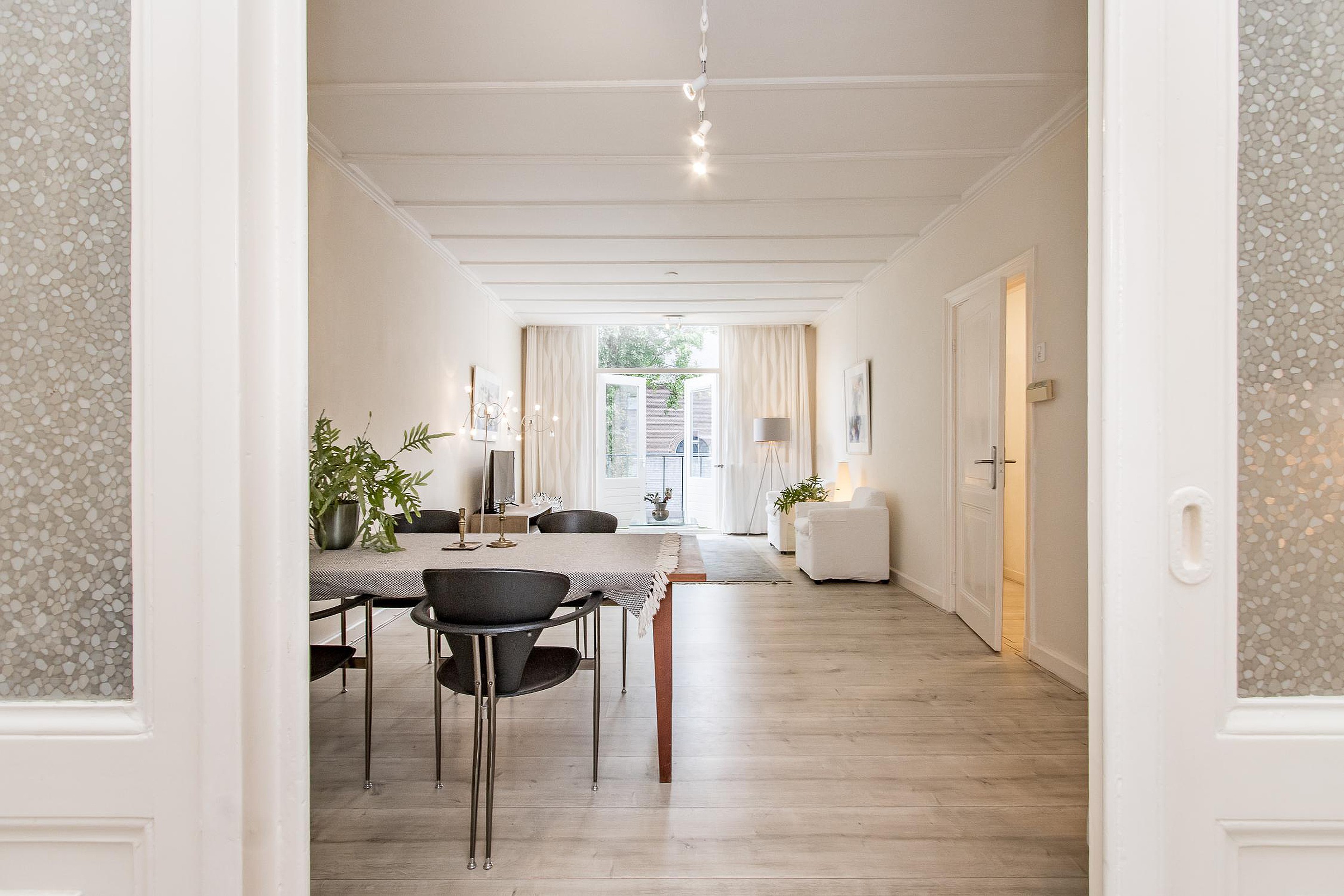 De woonkamer aan de voorkant met openslaande deuren naar Frans balkon en zicht op de straat.