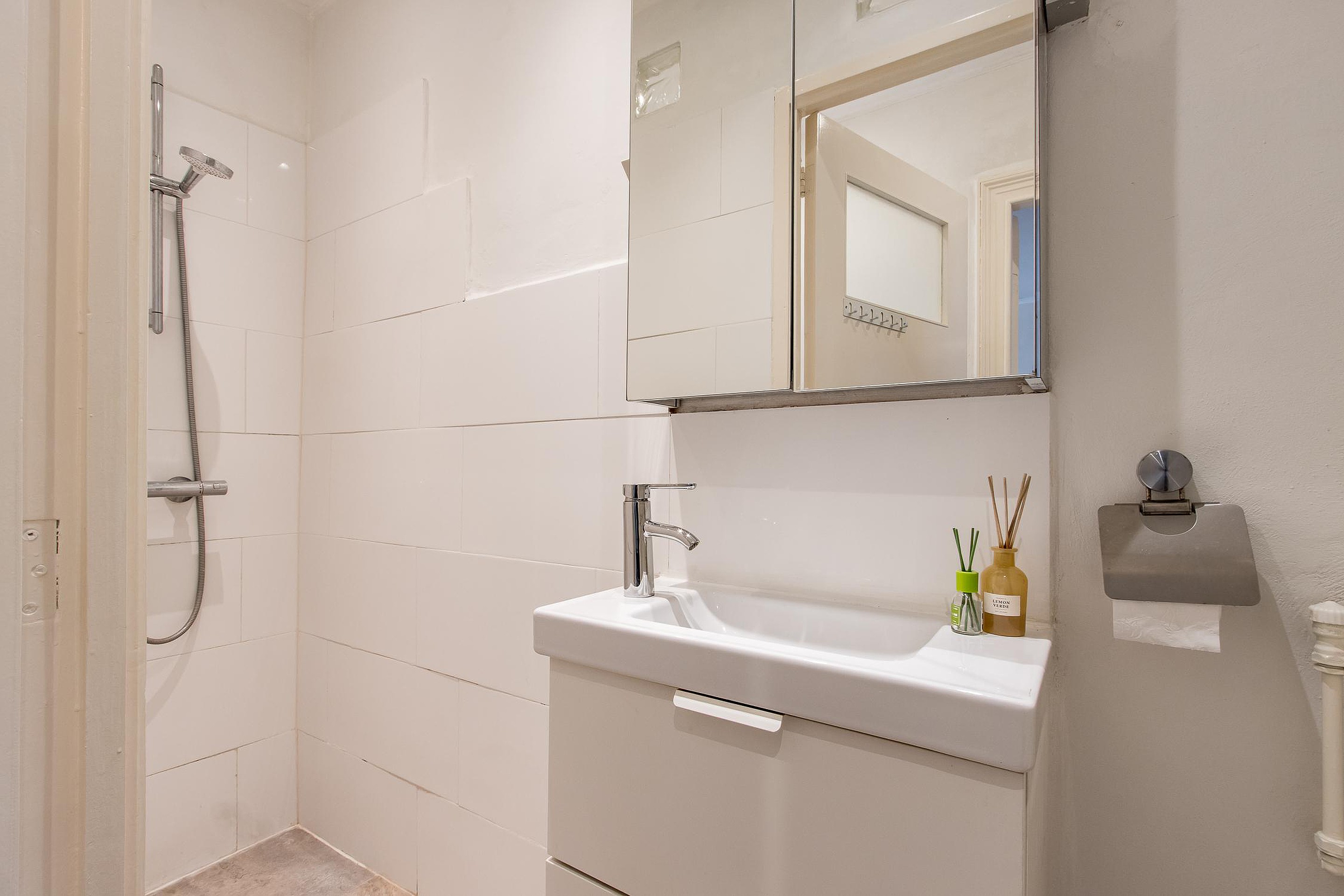 Badkamer met inloopdouche, wastafel, apart toilet .