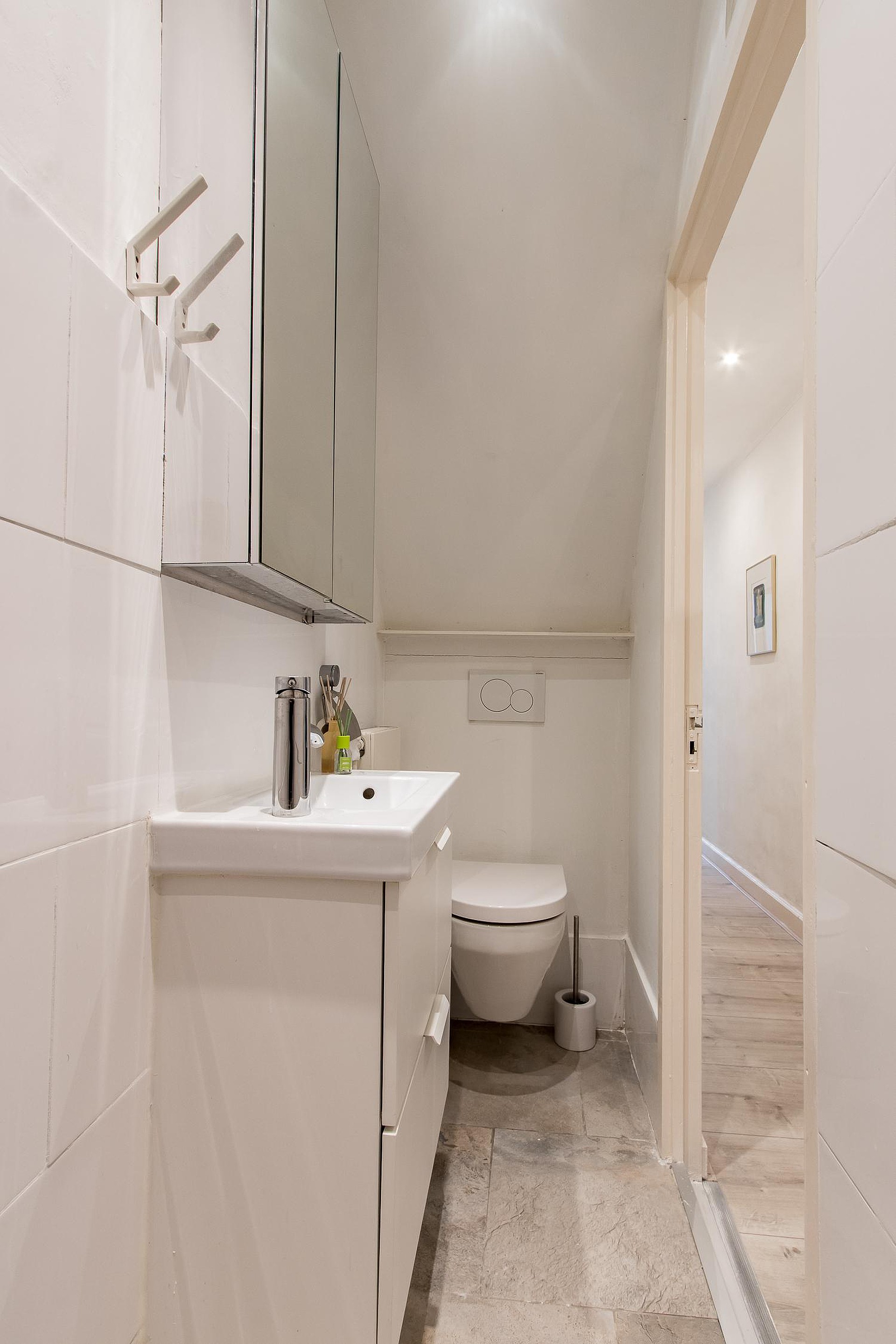 Badkamer, gerenoveerd met inloopdouche, badkamermeubel met wastafel en hangend toilet.
