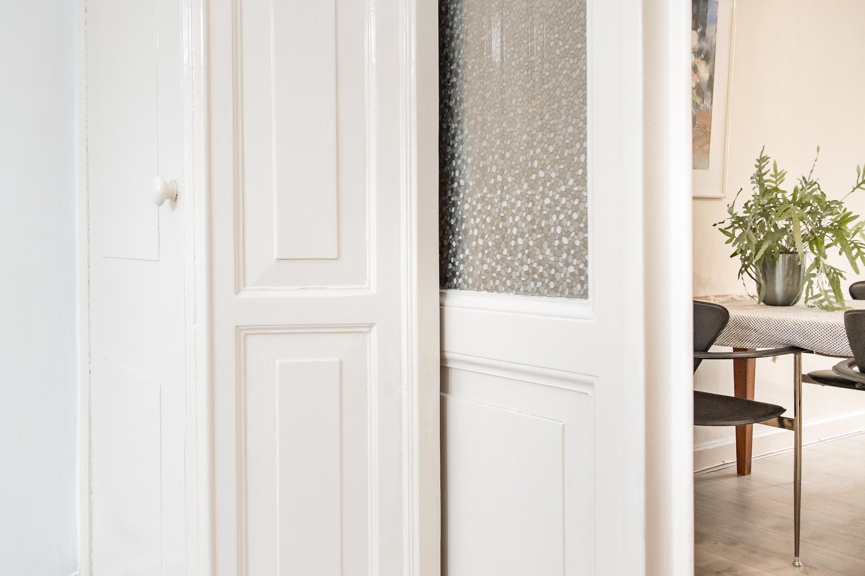 Twee grote woonkamers gescheiden door vaste kasten en originele schuifdeuren met glas in lood.