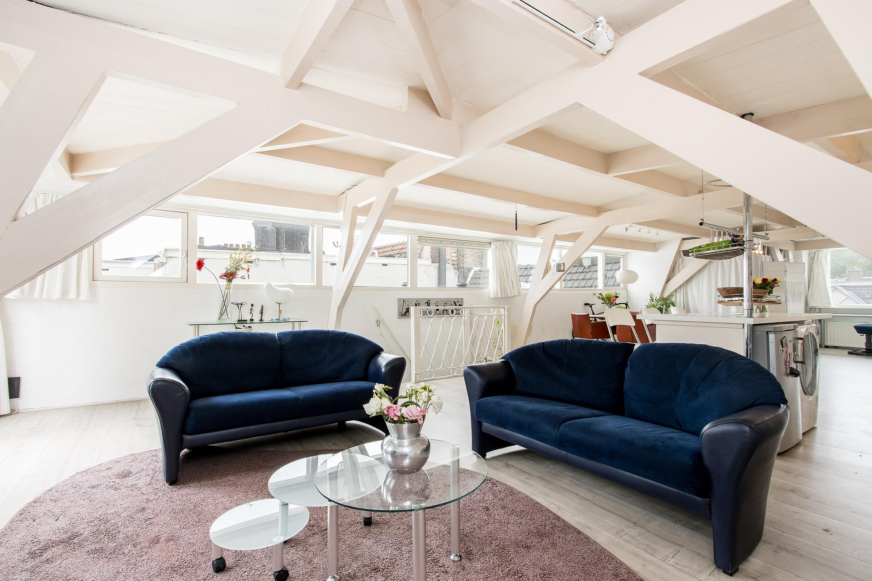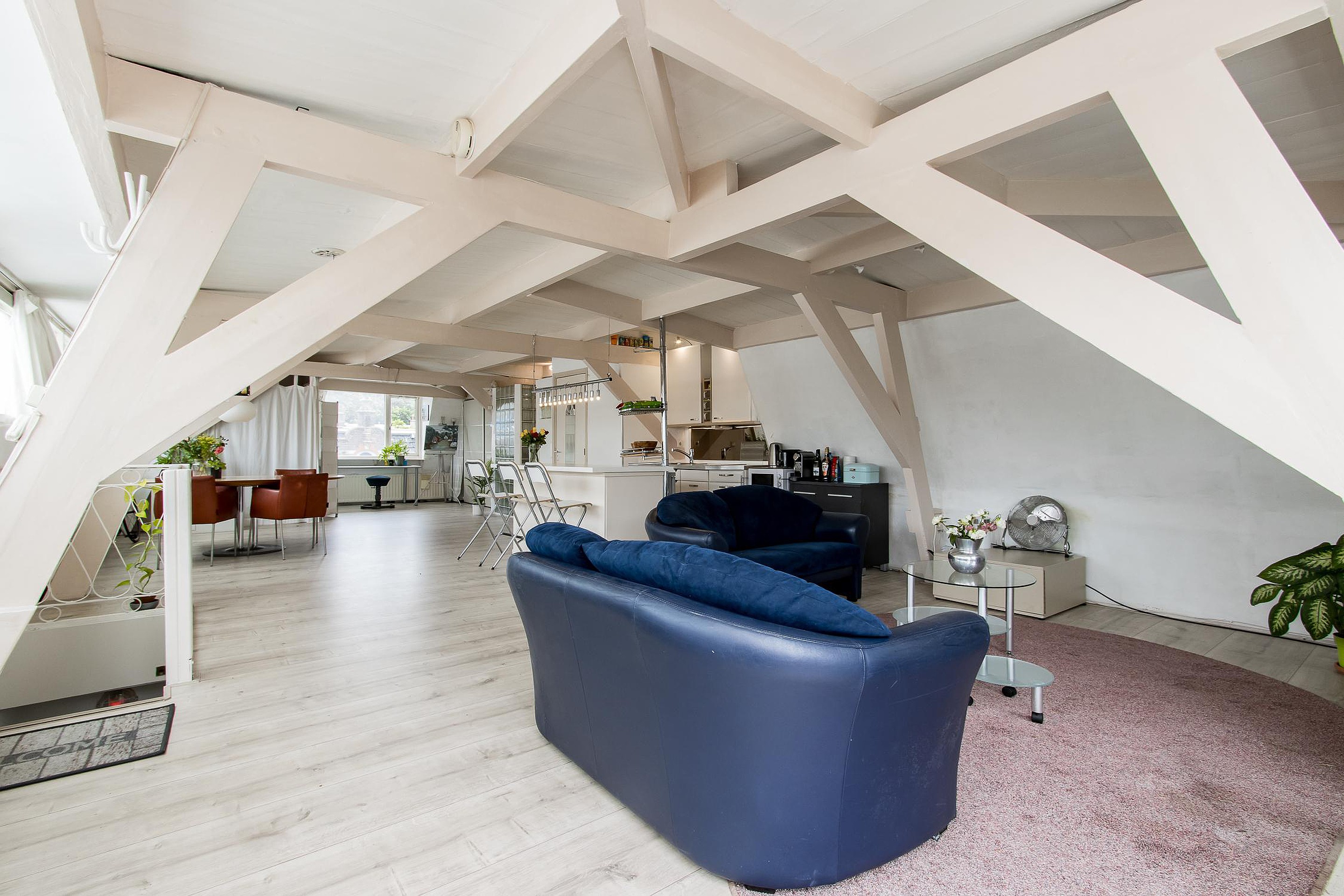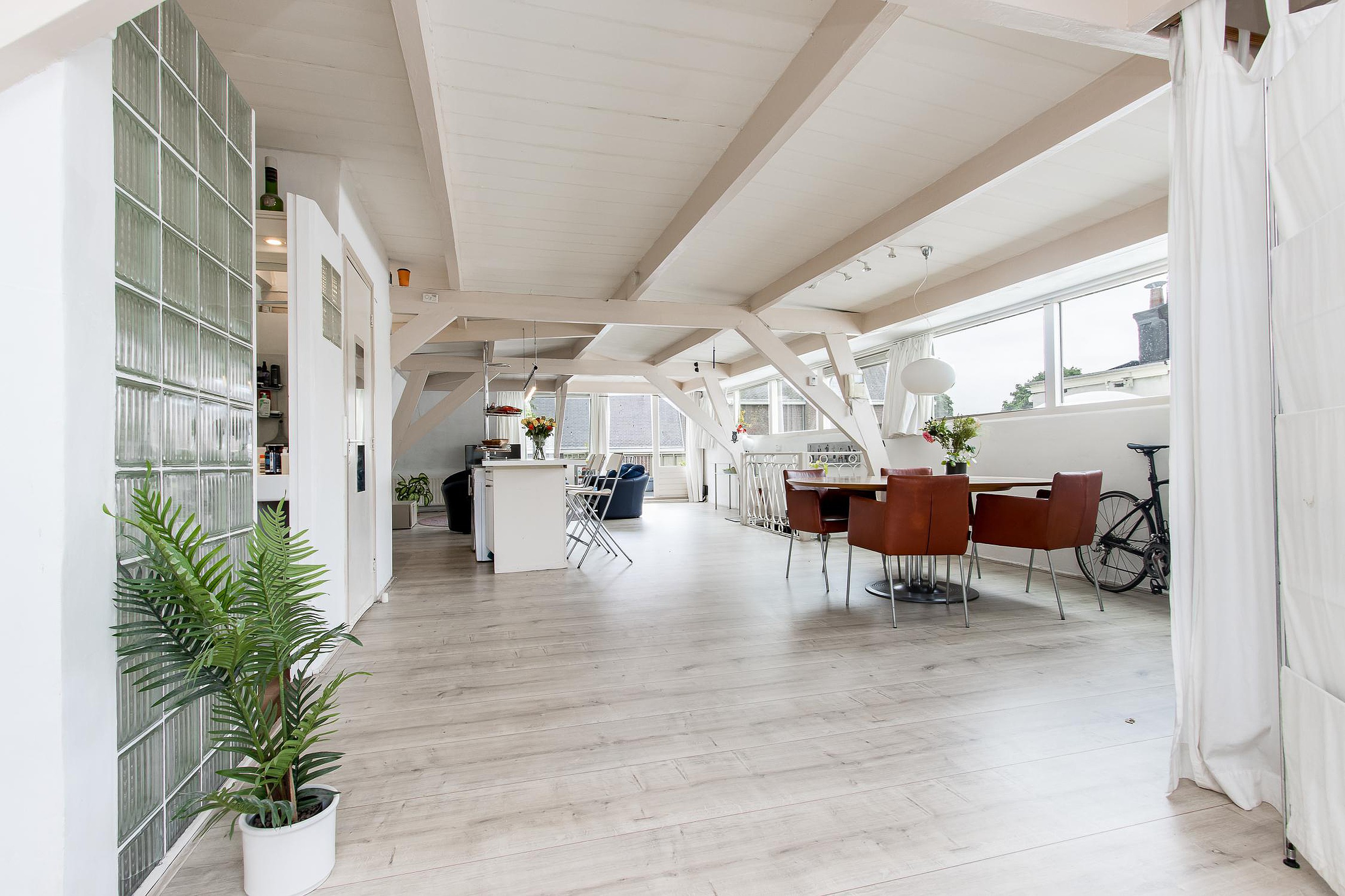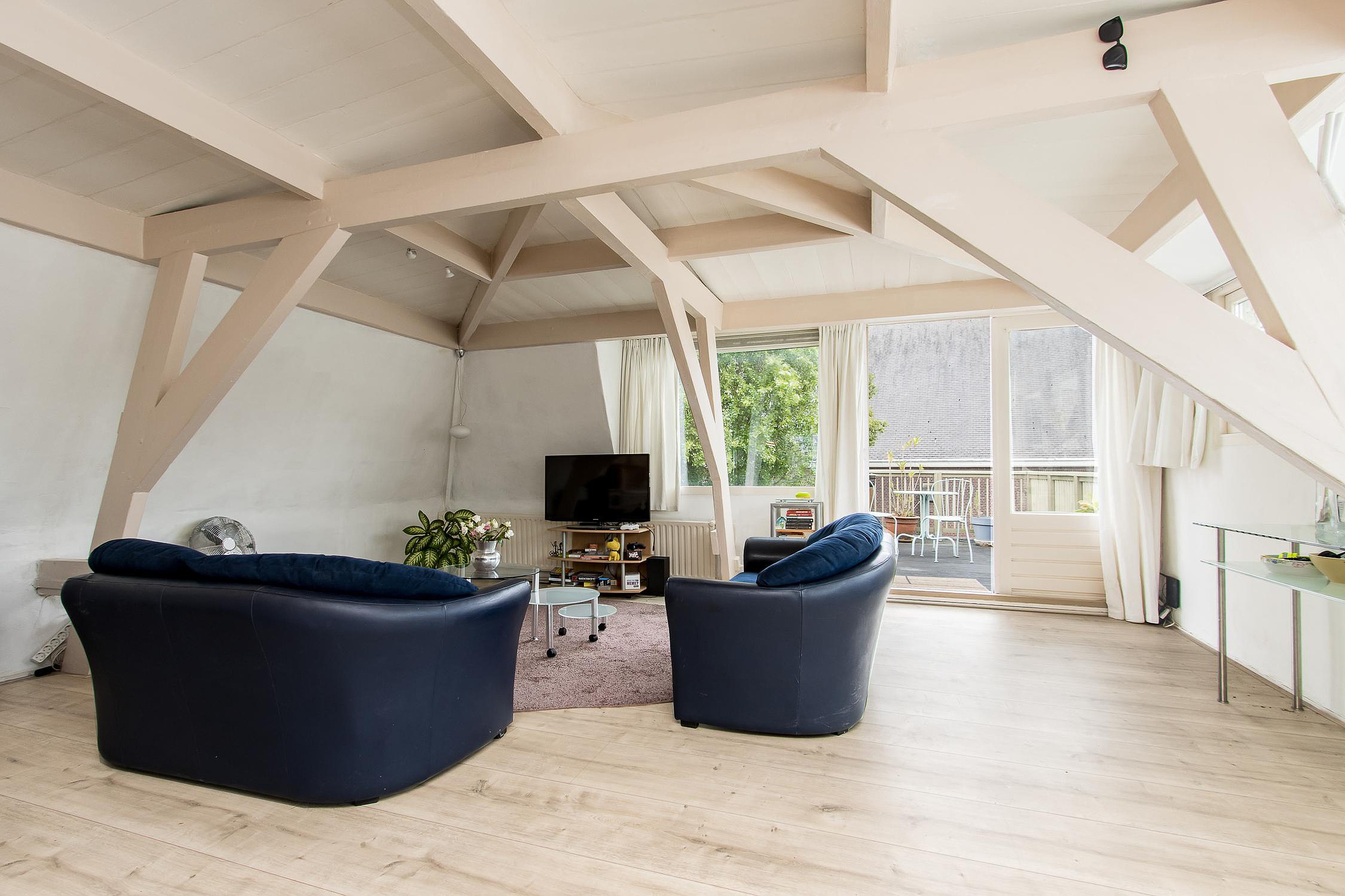 De originele balken en houten dakconstructie geven deze ruimte een uniek karakter en sfeer.