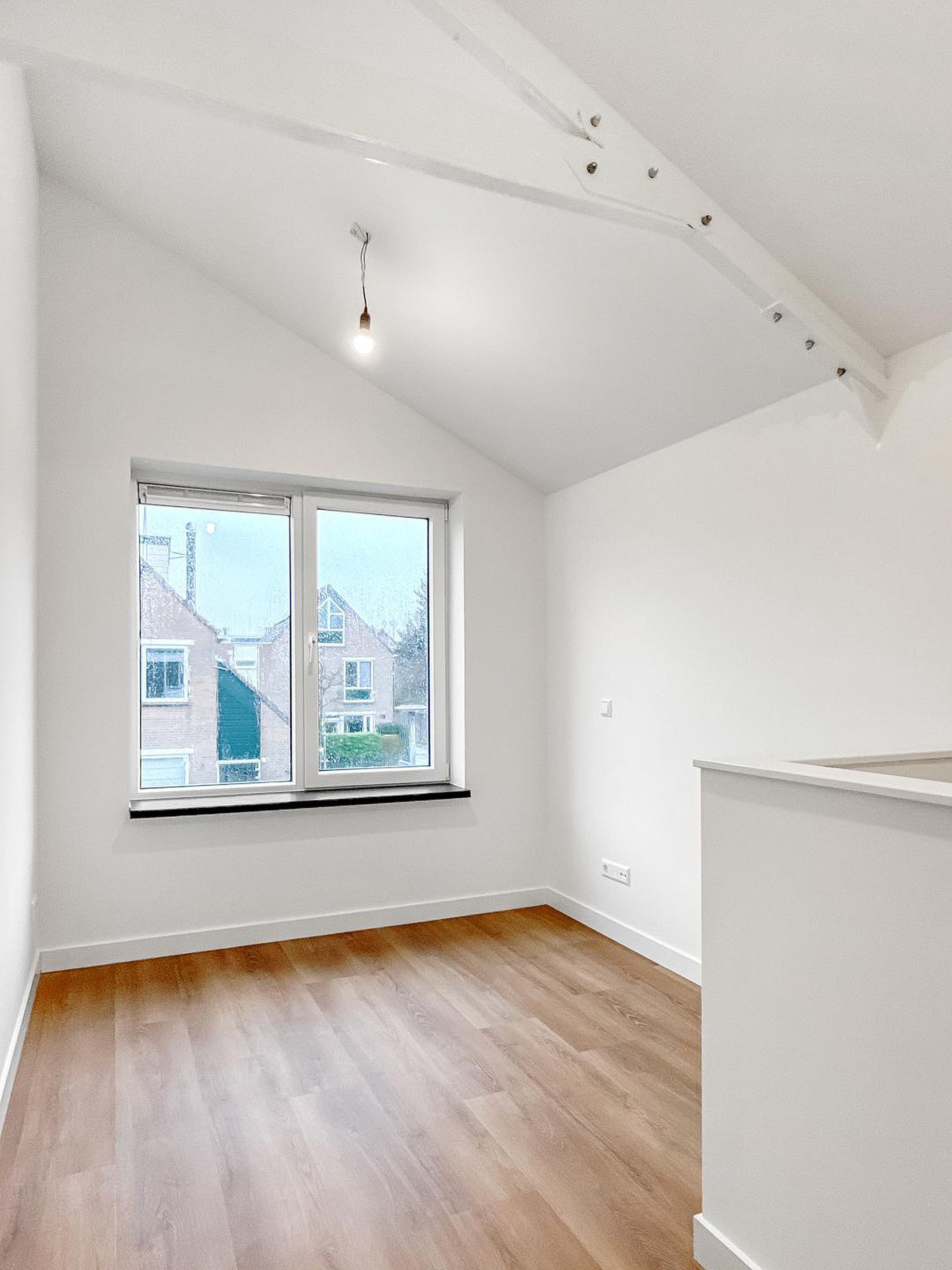 Wat bij het bovenkomen gelijk opvalt is de grote overloop/ werkruimte (of extra slaapvertrek) met raam.