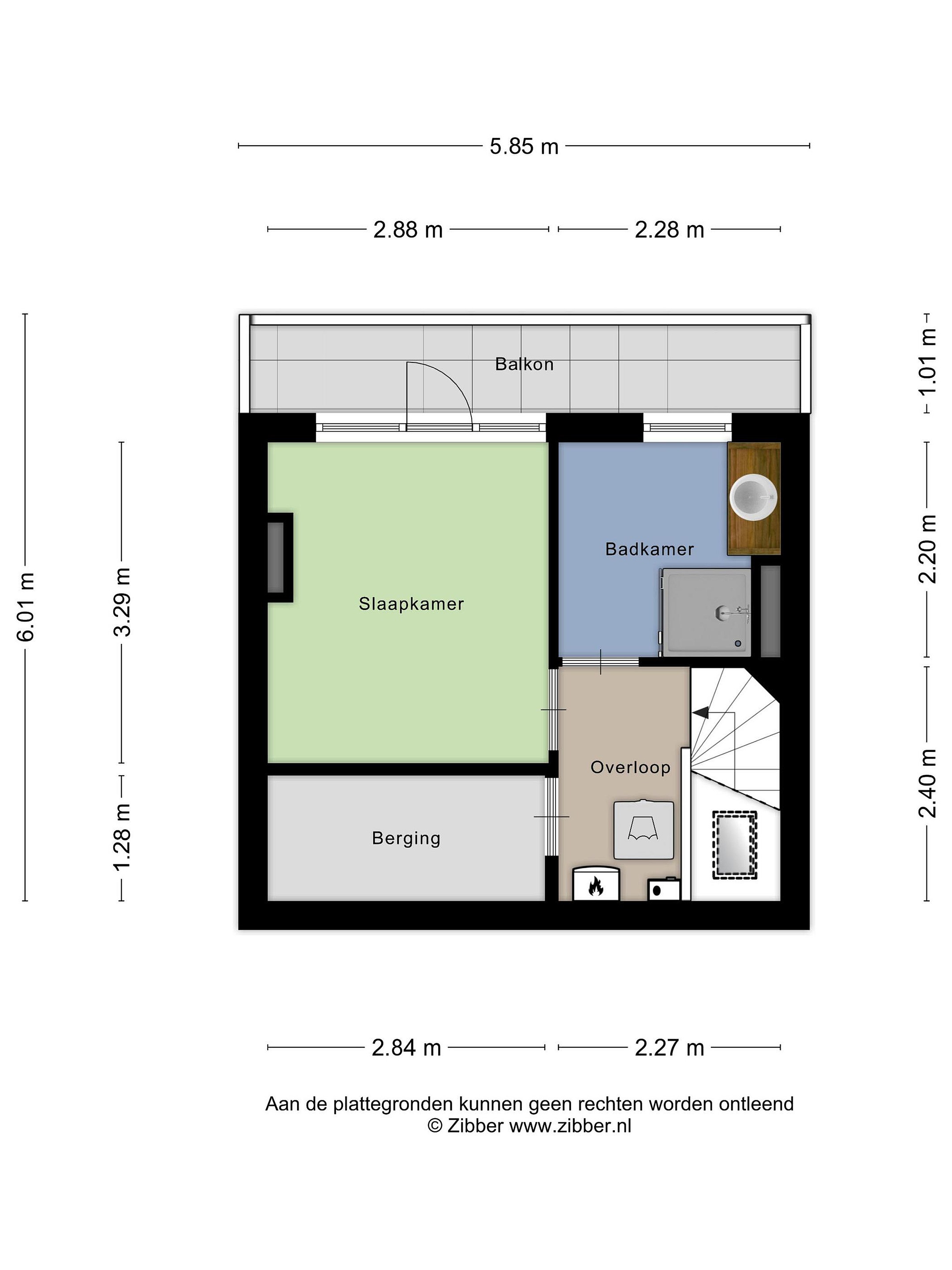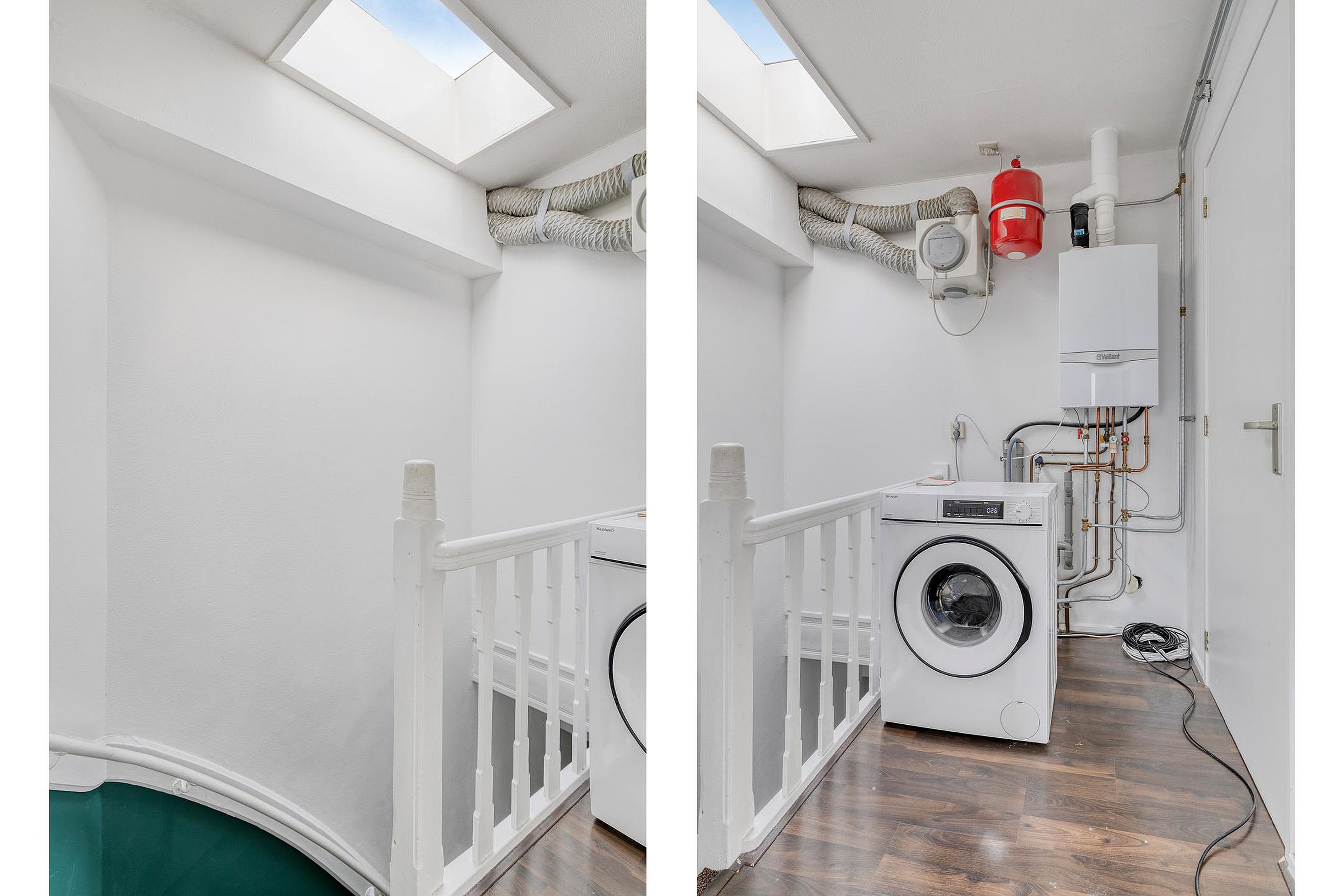 Hier vind je de overloop met dakraam, aansluiting voor de wasmachine, de CV installatie én toegang tot de tweede slaapkamer, de badkamer en een praktische berging. Deze slaapkamer geeft toegang tot het balkon. De badkamer is uitgerust met een douche en wastafel.
