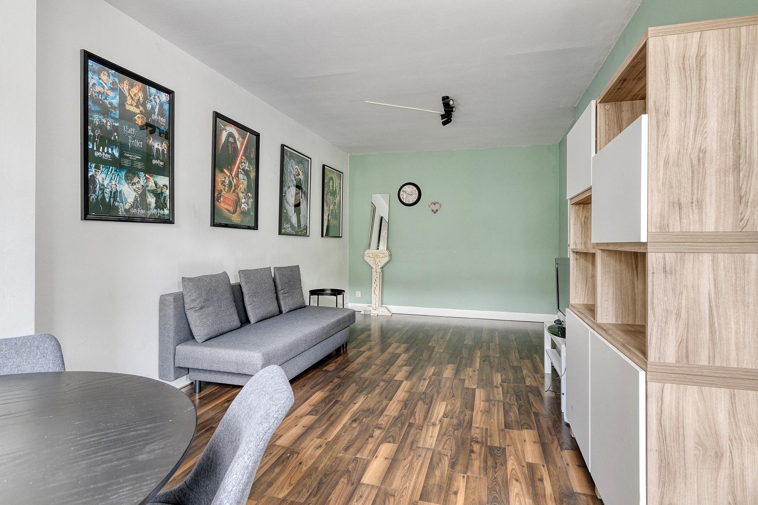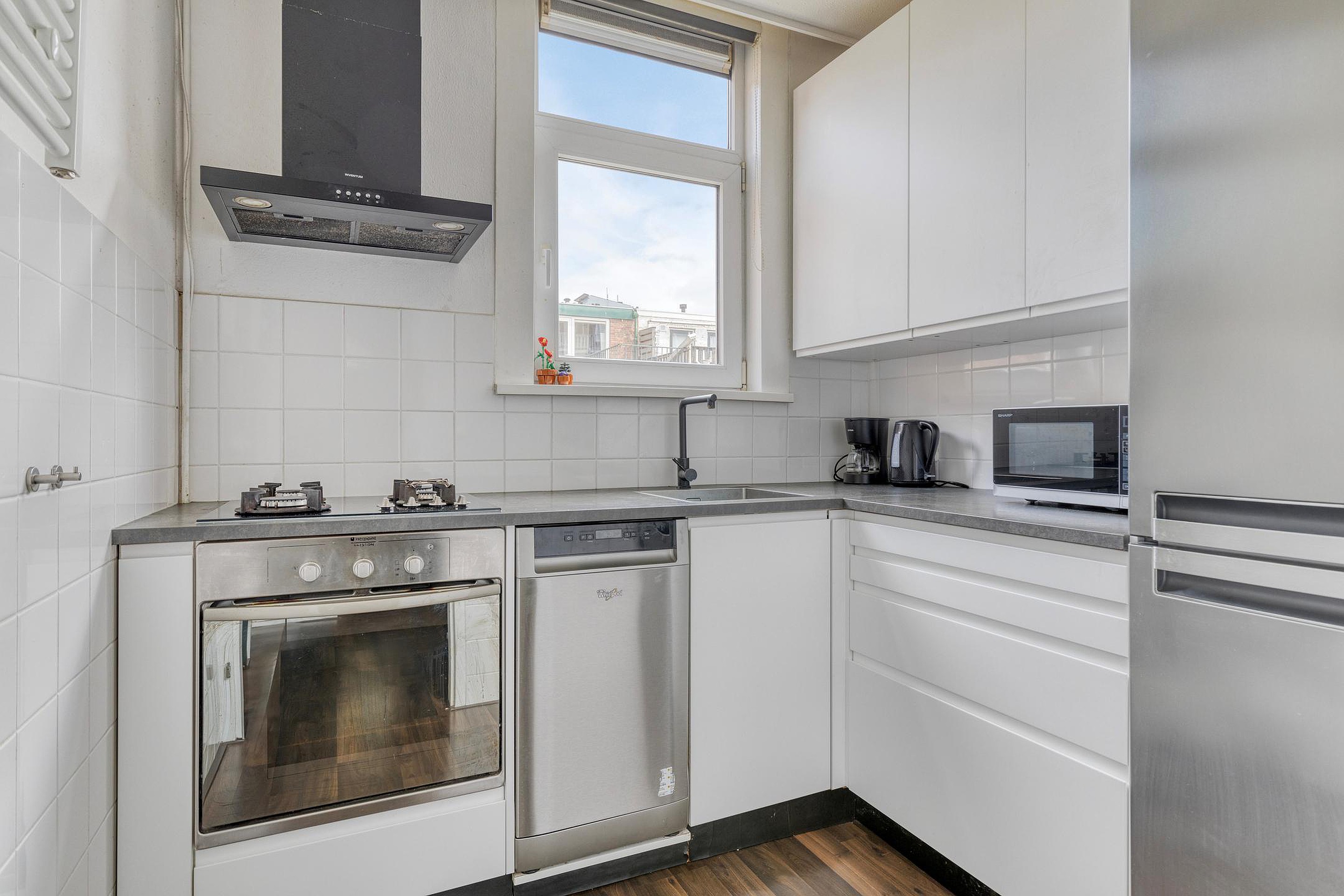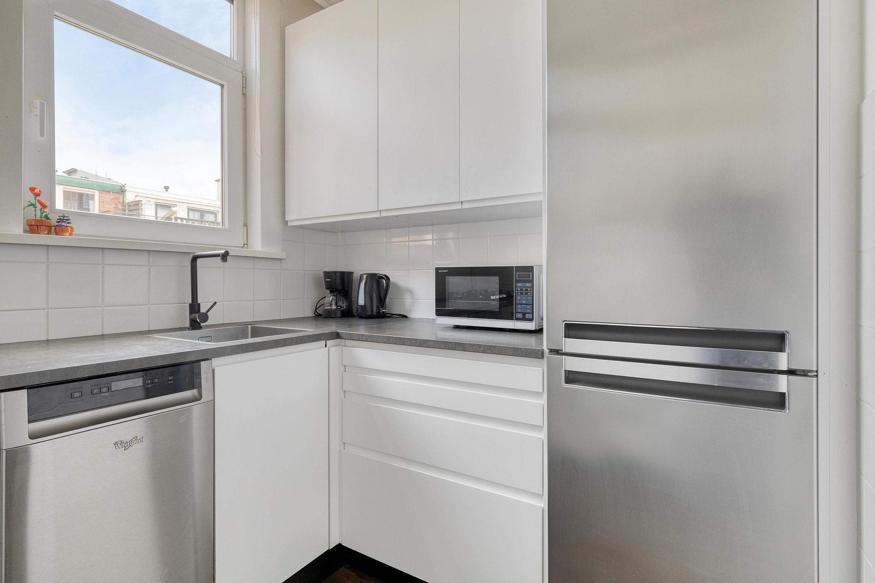 Overloop met toilet en bergruimte. De lichte, L-vormige woonkamer ligt aan de voorzijde en heeft twee grote ramen en een deur die zorgen voor veel daglicht plus een balkon over de hele breedte van de woning. Aan de achterzijde bevindt zich de eerste slaapkamer en de keuken. De keuken is voorzien van moderne keukeninrichting met inbouwapparatuur zoals een vaatwasser, koelkast/vriescombinatie, gaskookplaat, oven en afzuigkap.