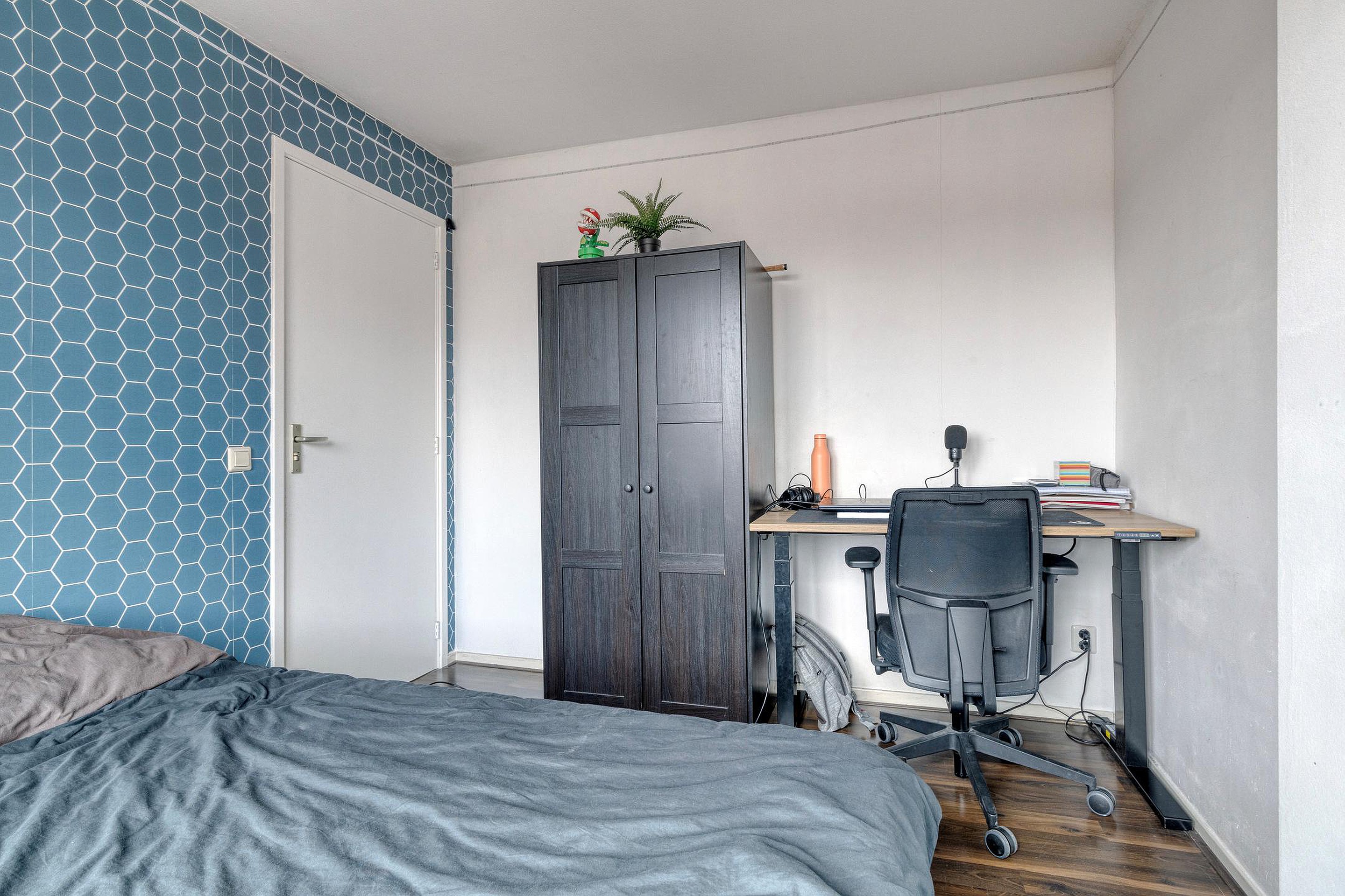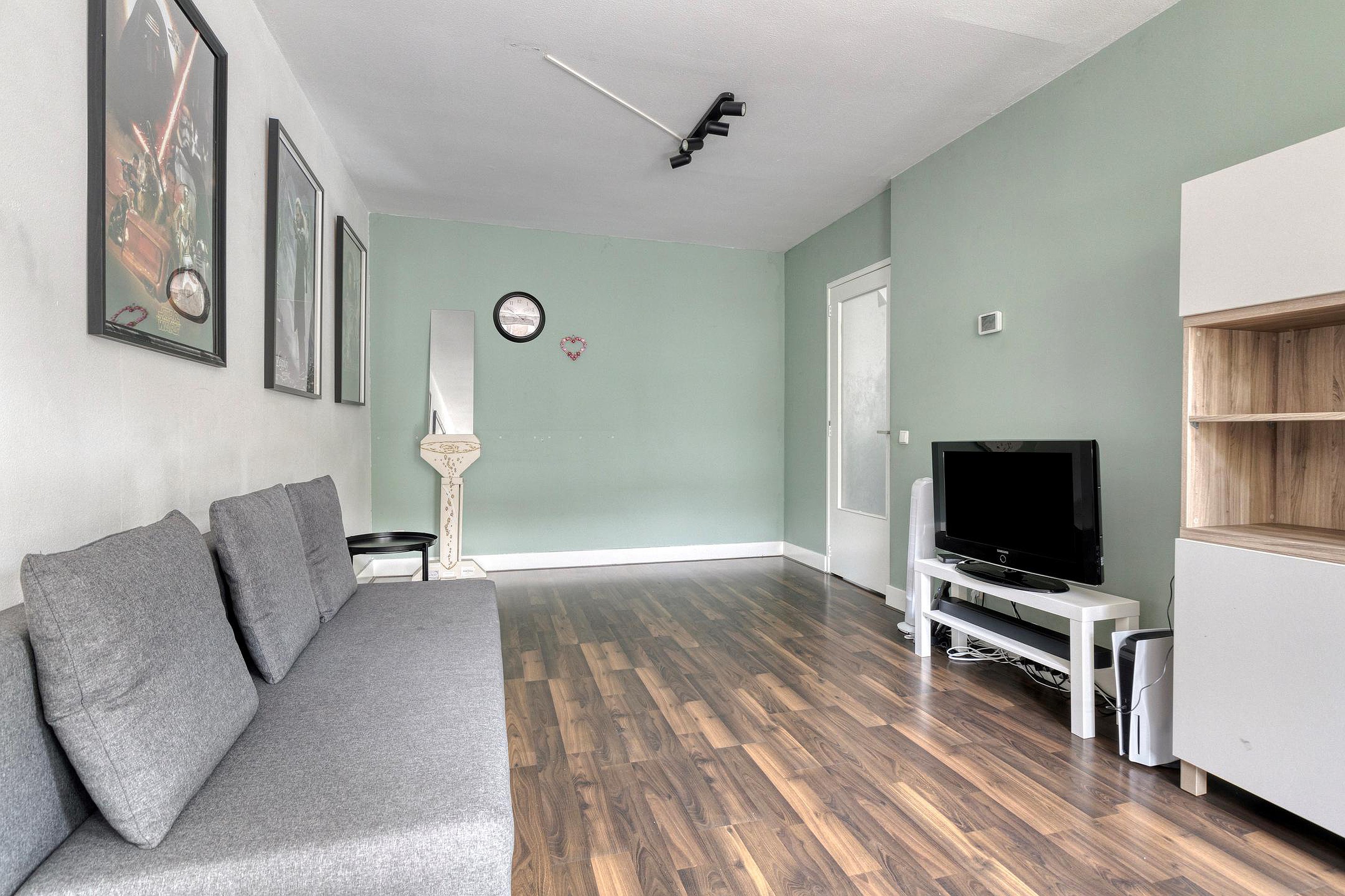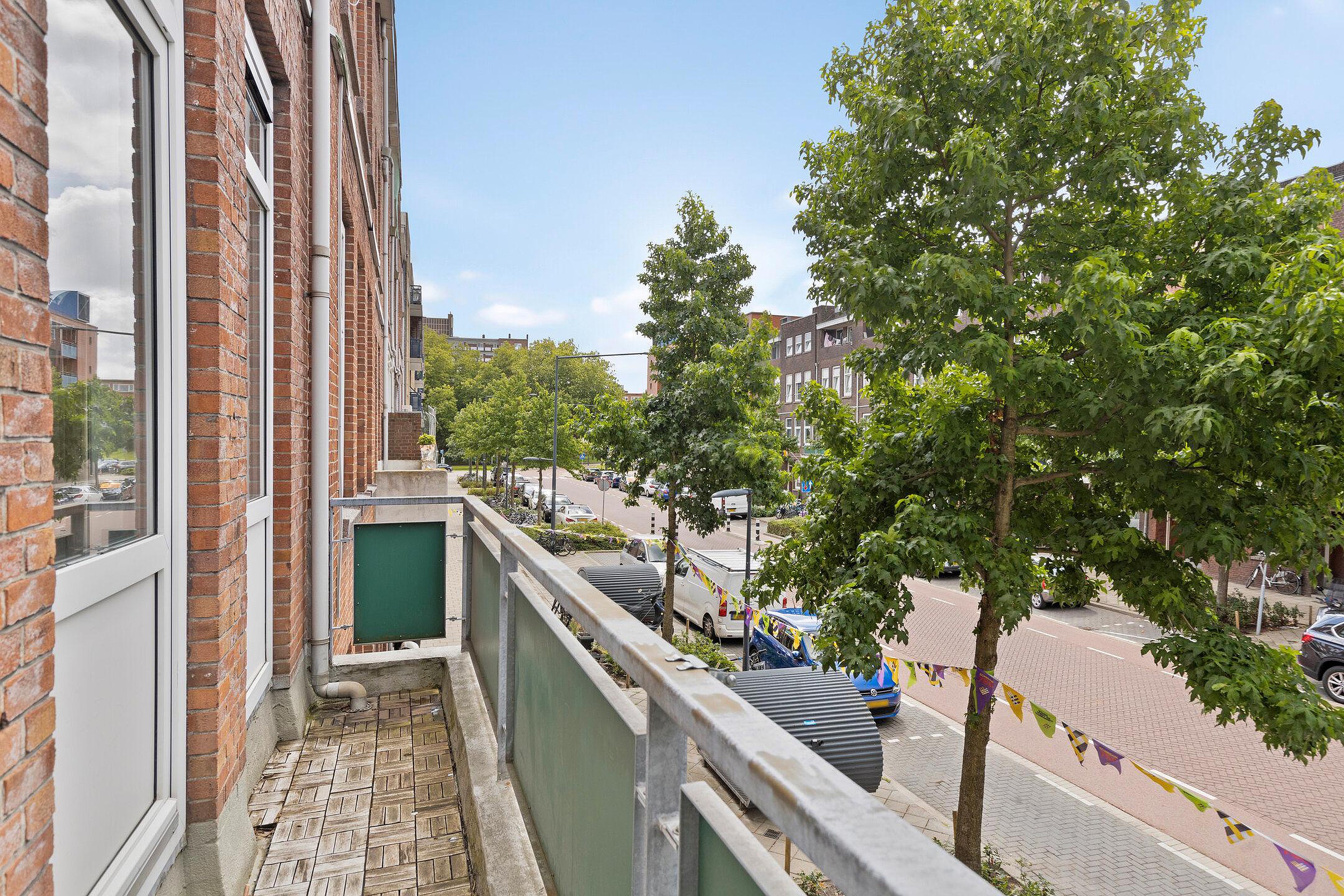 Overloop met toilet en bergruimte. De lichte, L-vormige woonkamer ligt aan de voorzijde en heeft twee grote ramen en een deur die zorgen voor veel daglicht plus een balkon over de hele breedte van de woning. Aan de achterzijde bevindt zich de eerste slaapkamer en de keuken. De keuken is voorzien van moderne keukeninrichting met inbouwapparatuur zoals een vaatwasser, koelkast/vriescombinatie, gaskookplaat, oven en afzuigkap.