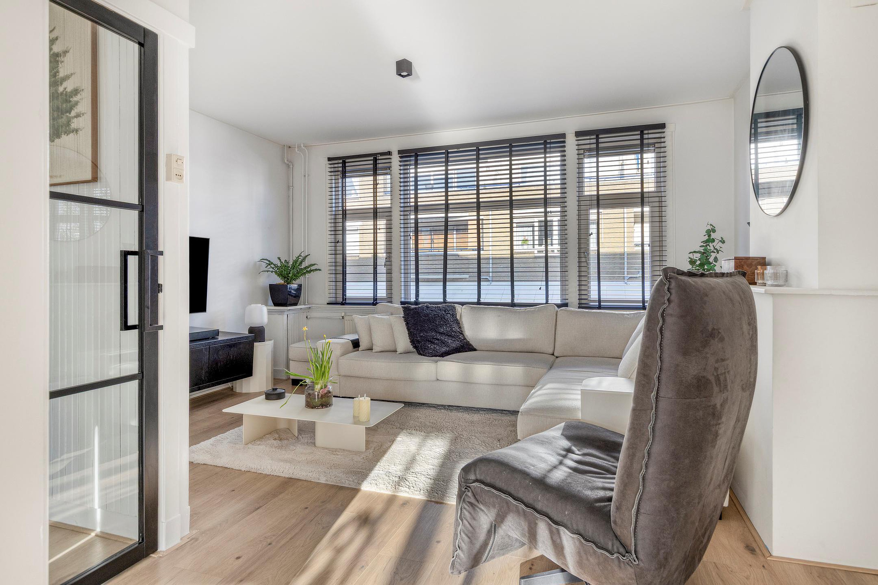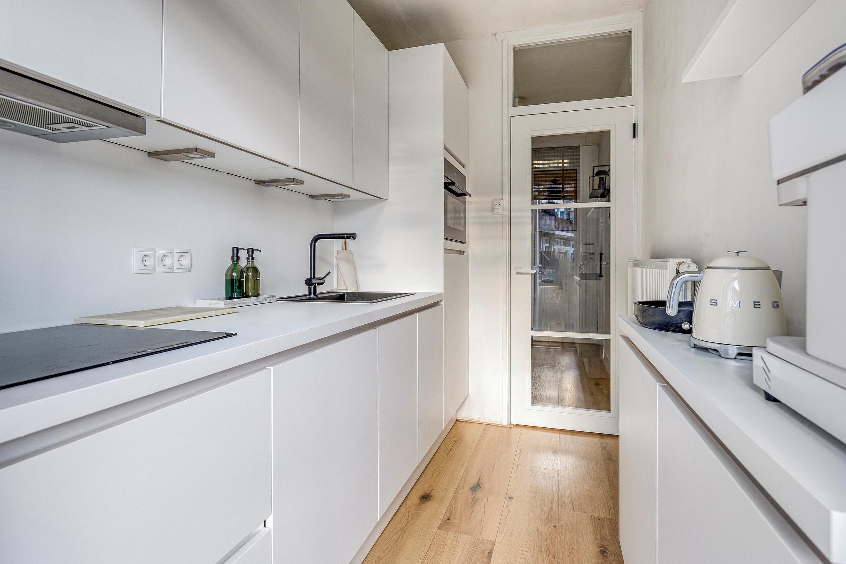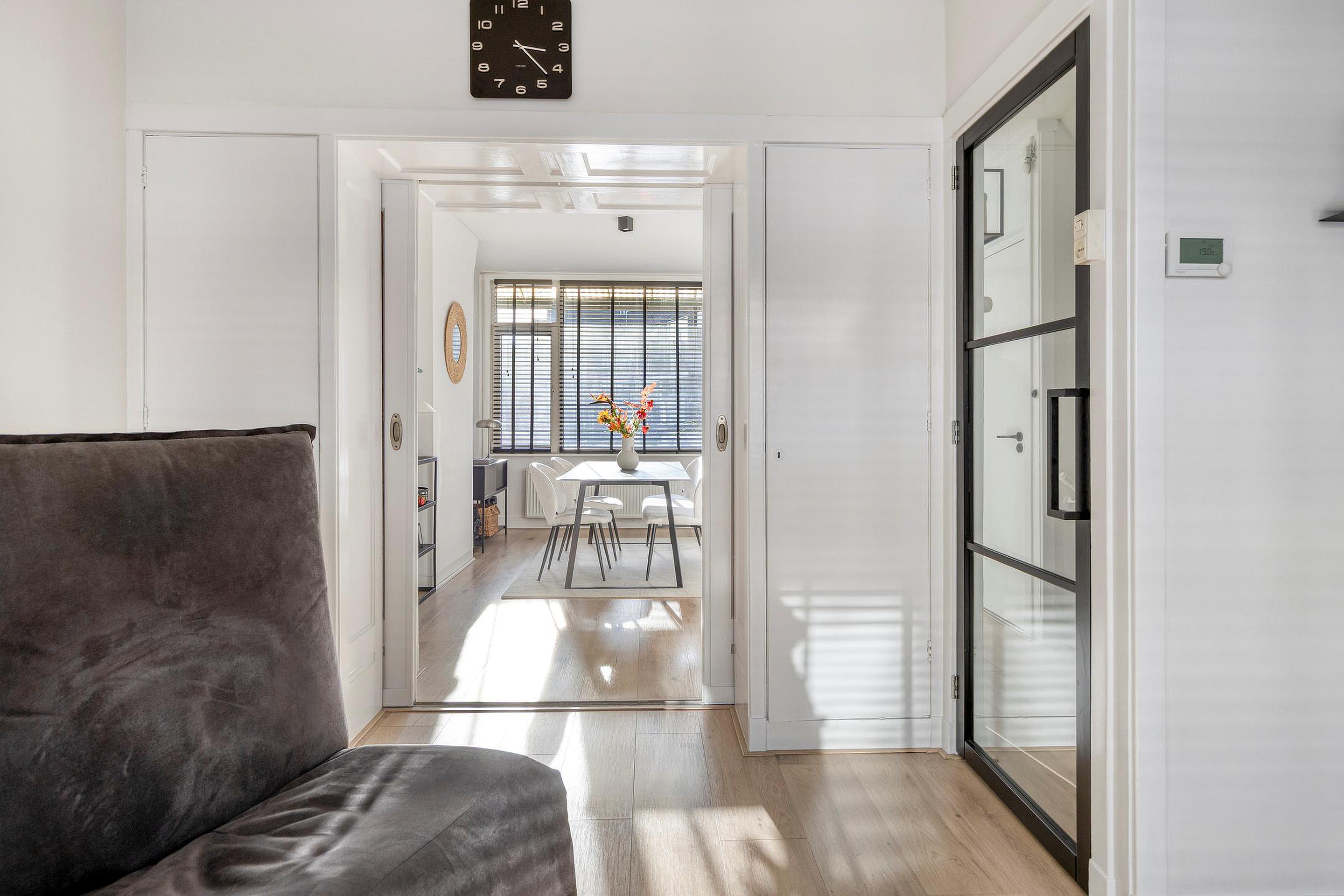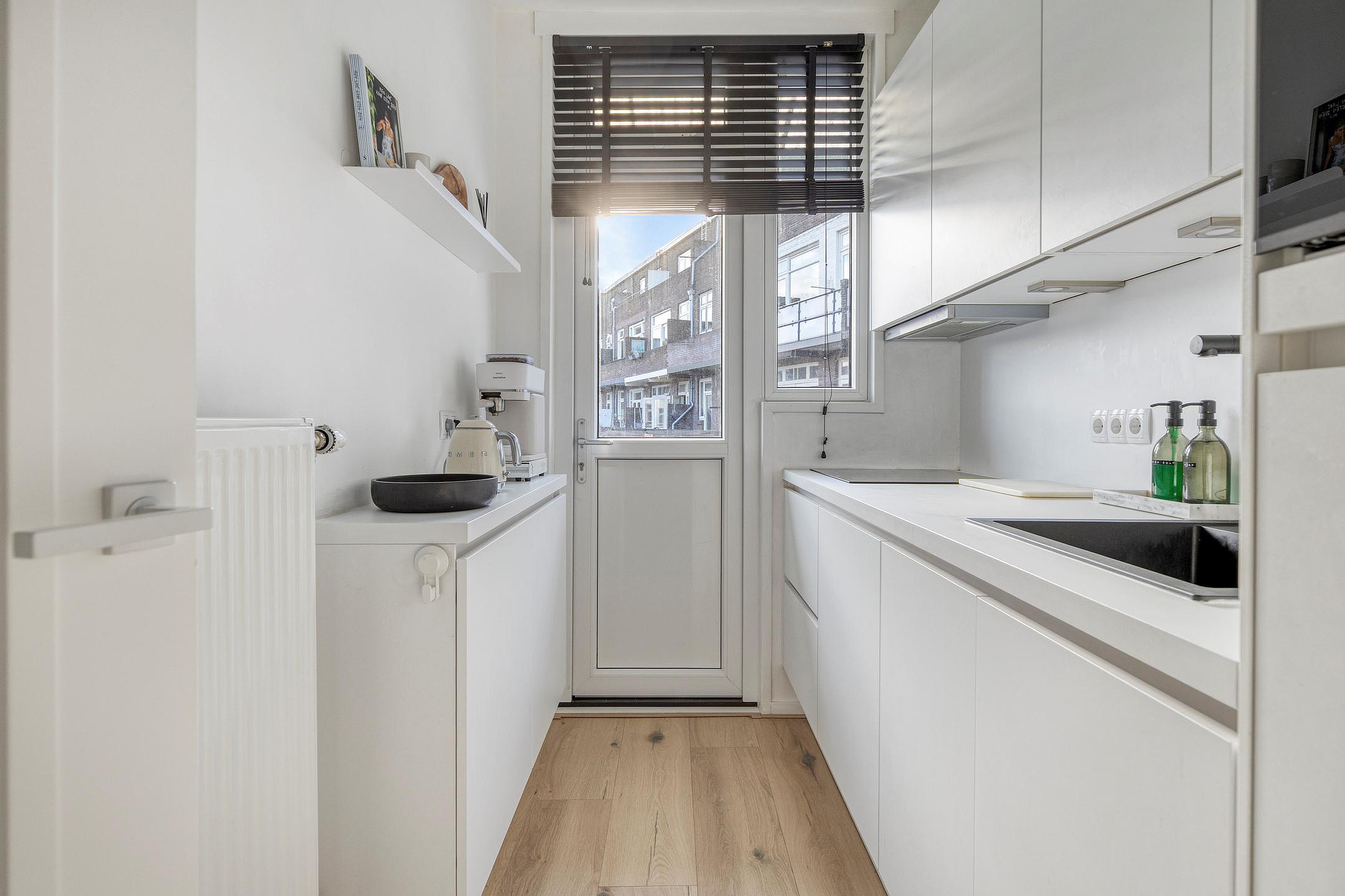 De woonkamer is voorzien van een laminaatvloer en wordt middels een en-suite met schuifdeuren verdeeld in een woon- en eetkamer. De keuken is gelegen aan de achterzijde van de woning en de keukeninrichting met inbouwapparatuur is in 2024 geplaatst, dus zo goed als nieuw. Vanuit de keuken kom je op het eerste balkon, heerlijk gelegen op het zuiden. Het toilet heeft een vrijhangend closet en een leuke nis en is in 2024 geplaatst.