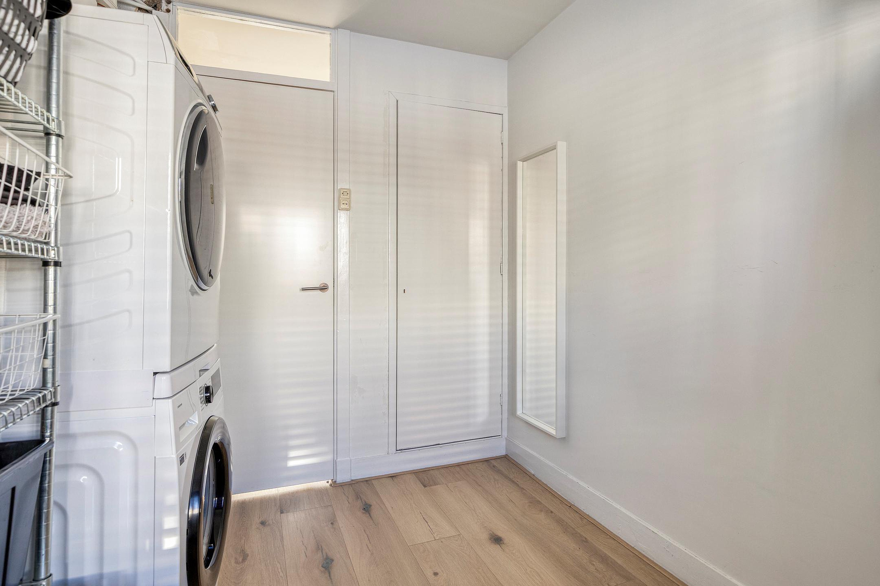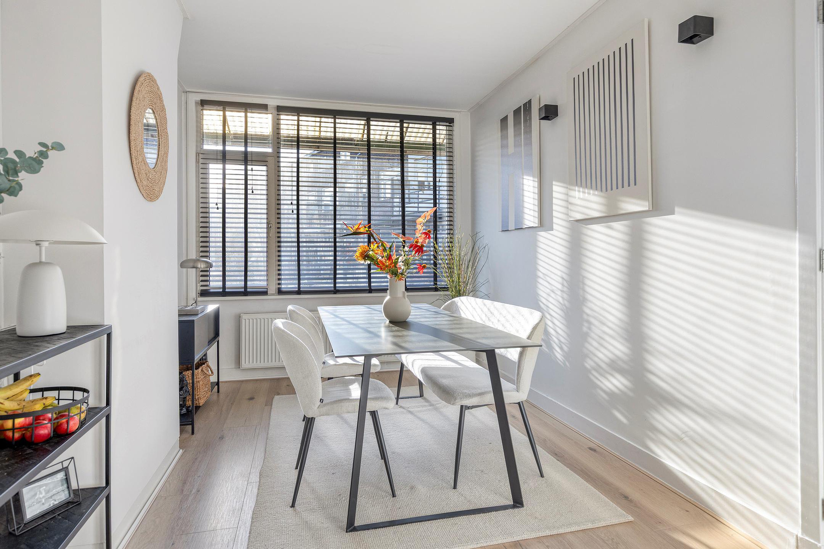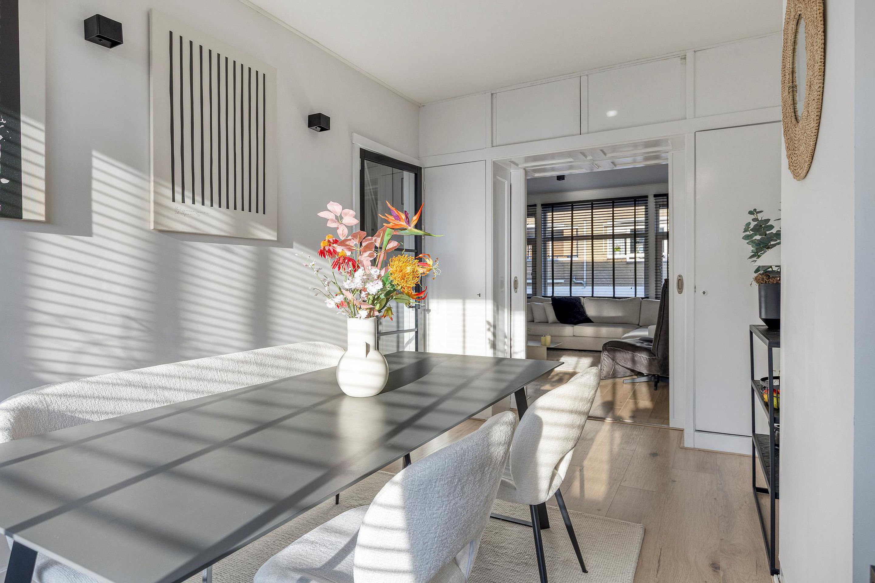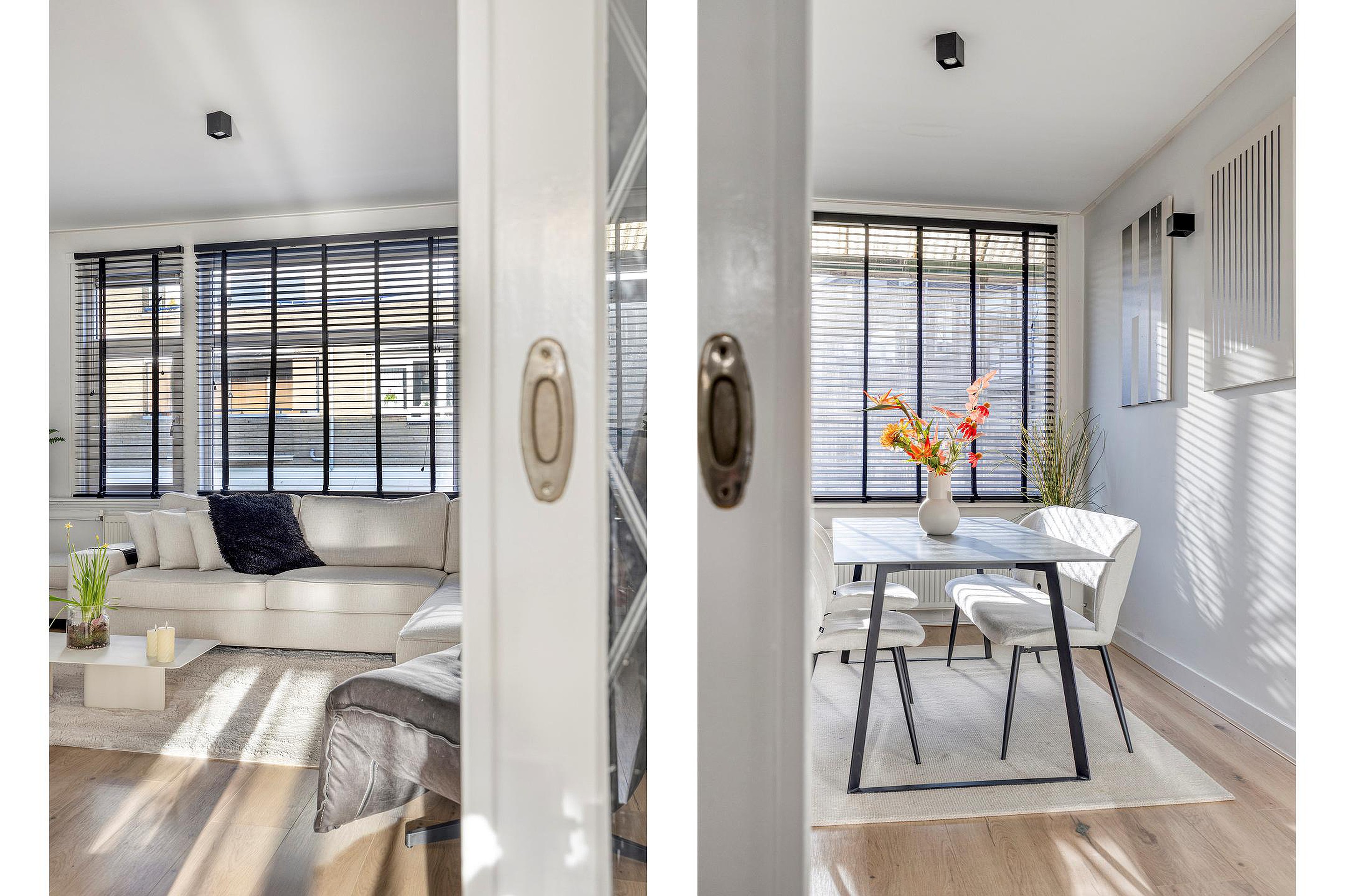De woonkamer is voorzien van een laminaatvloer en wordt middels een en-suite met schuifdeuren verdeeld in een woon- en eetkamer. De keuken is gelegen aan de achterzijde van de woning en de keukeninrichting met inbouwapparatuur is in 2024 geplaatst, dus zo goed als nieuw. Vanuit de keuken kom je op het eerste balkon, heerlijk gelegen op het zuiden. Het toilet heeft een vrijhangend closet en een leuke nis en is in 2024 geplaatst.