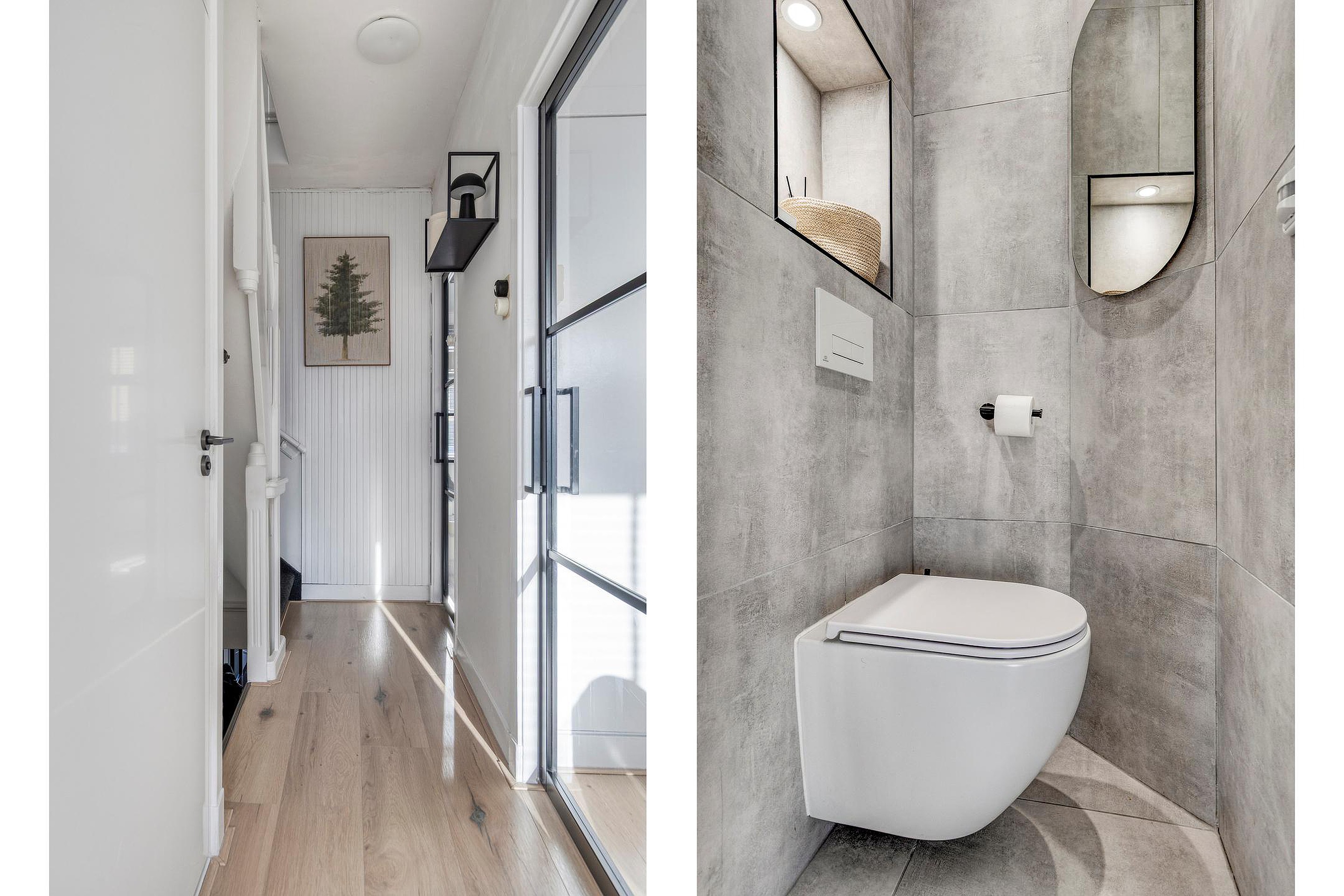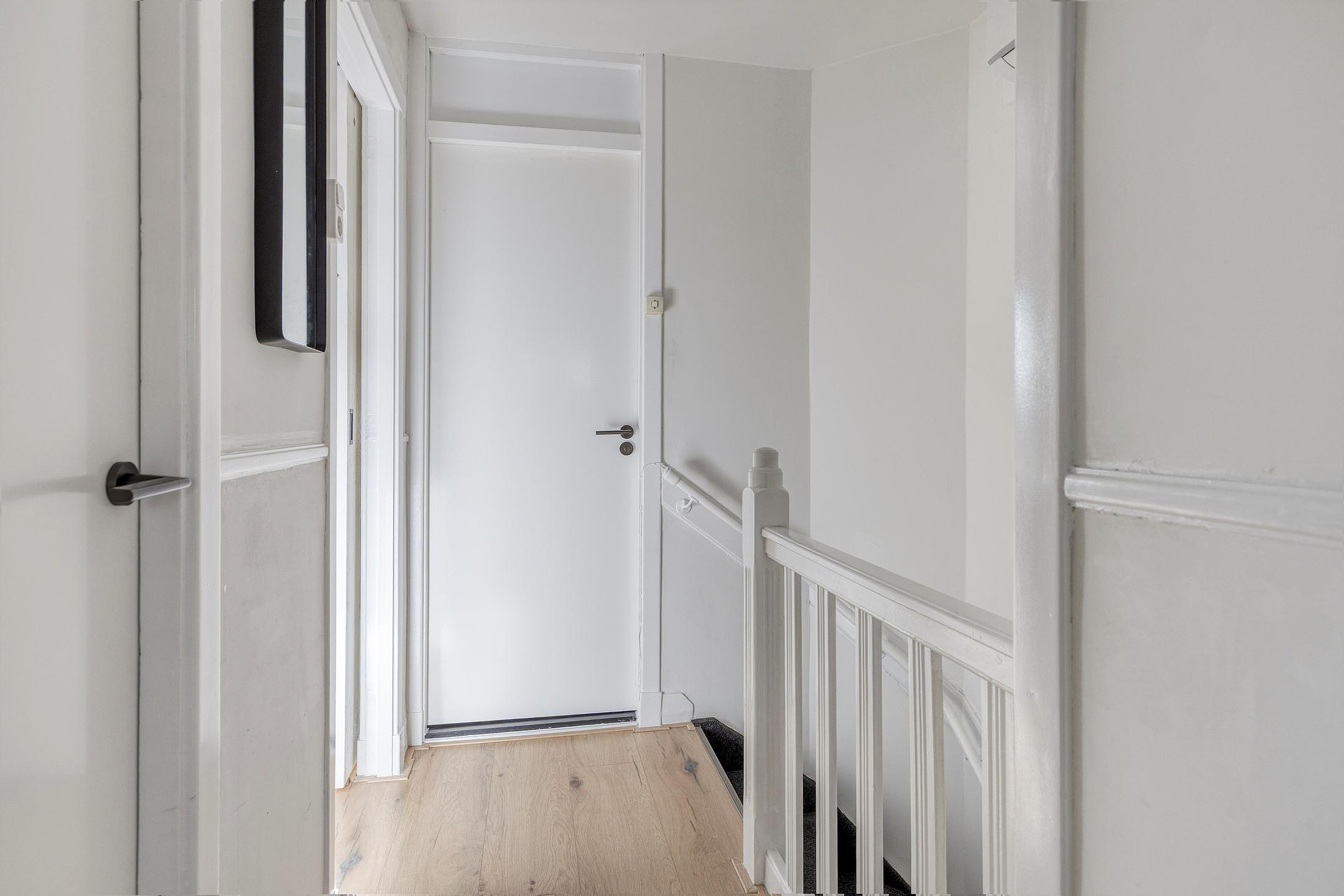 Overloop met toegang tot de woonkamer, keuken en toilet en trapopgang naar de 2e verdieping
