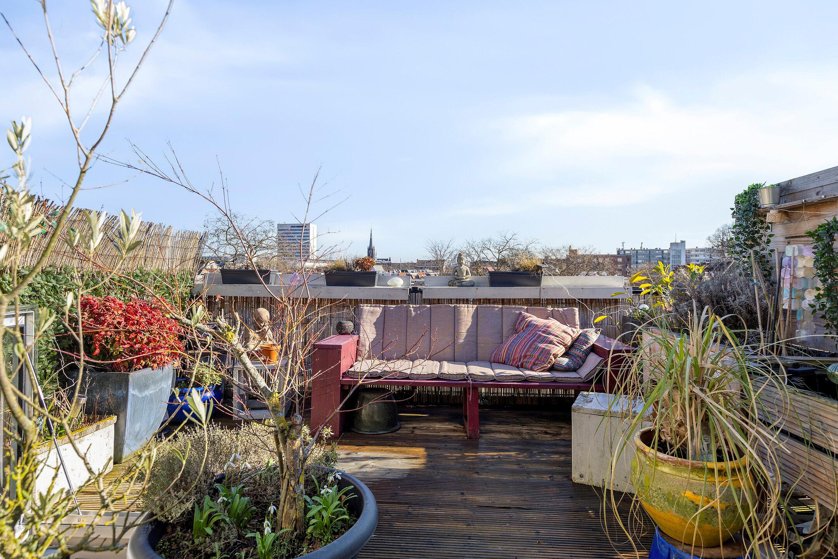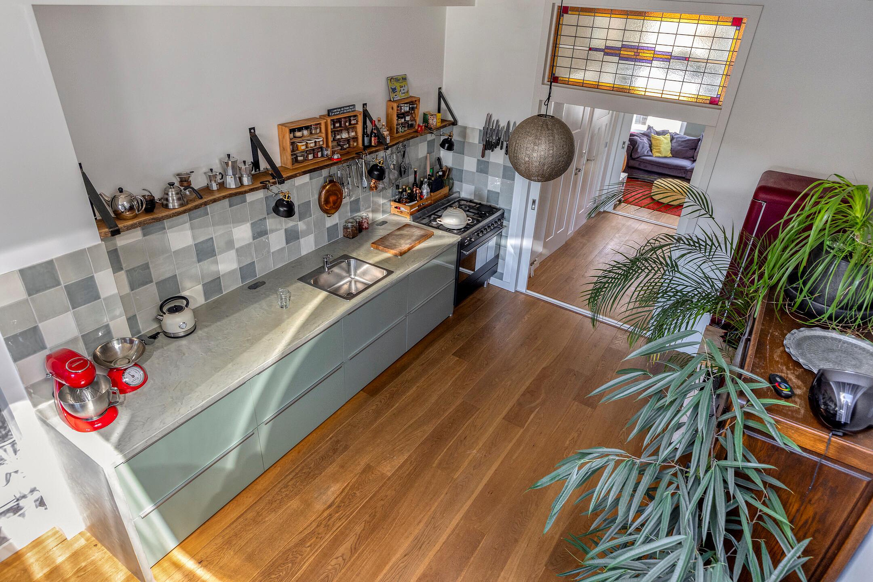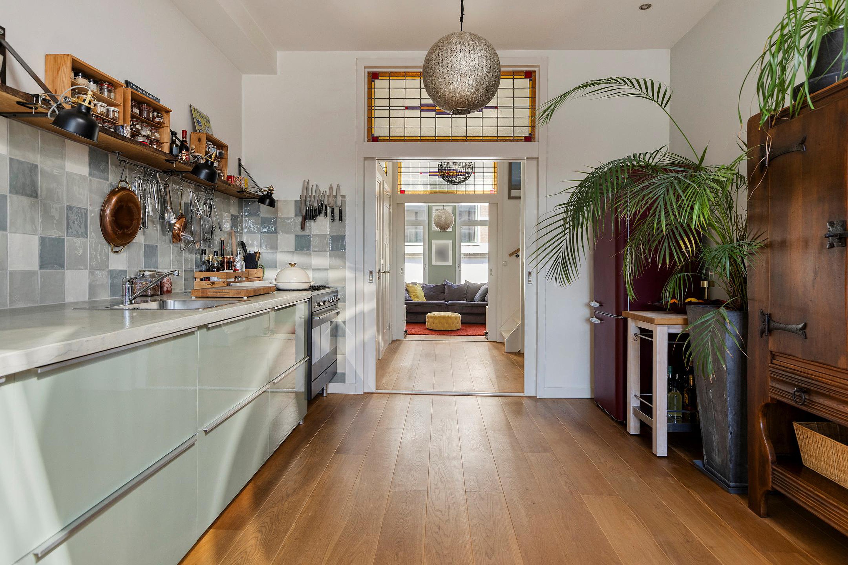 De eerste verdieping ademt licht en sfeer. Je komt boven op de royale overloop met toegang tot het toilet en 2 vaste kasten. Middels schuifdeuren is er toegang tot de voor- en achterkamer. Aan de voorzijde bevindt zich de gezellige woonkamer, aan de achterzijde de royale eetkamer met open keuken – een gezellige leefruimte waar koken en tafelen samenkomen. De keuken springt in het oog met zijn groene kleurstelling, extra diep werkblad van betonciree, royaal gasfornuis met oven en voldoende kastruimte. Vanuit de eetkamer leidt een houten trap – leuk weetje: gemaakt van oud spoormateriaal – naar het riante terras, de perfecte plek om te ontspannen of met vrienden te borrelen in de zon.