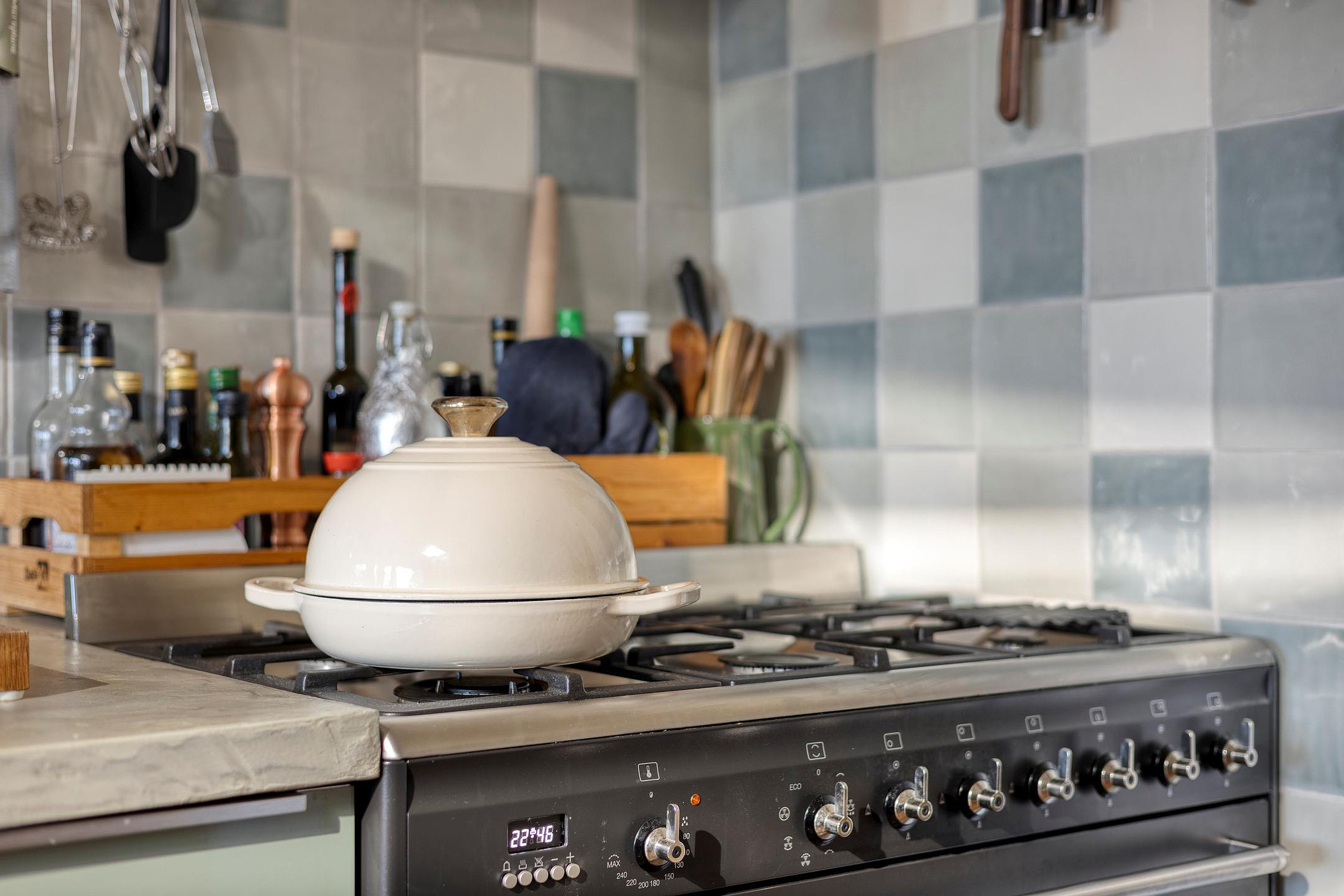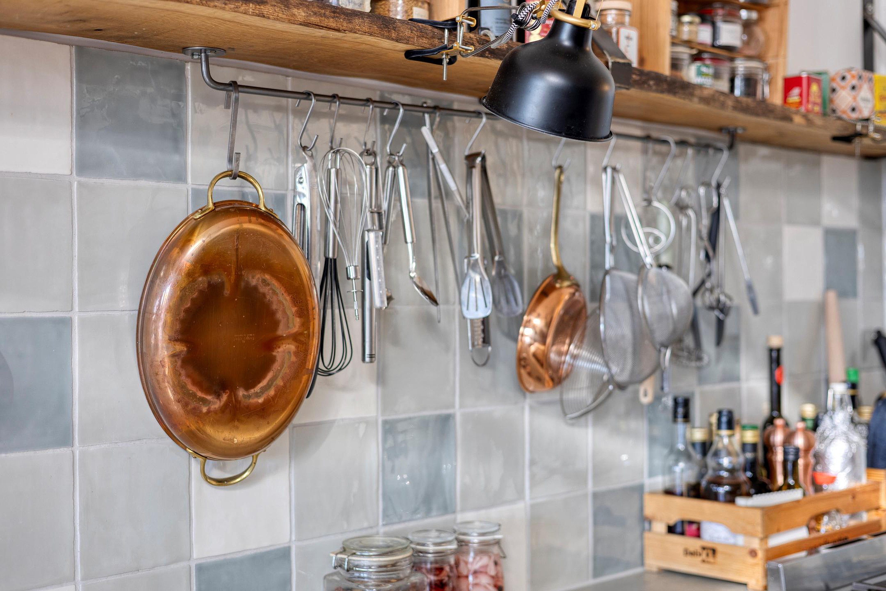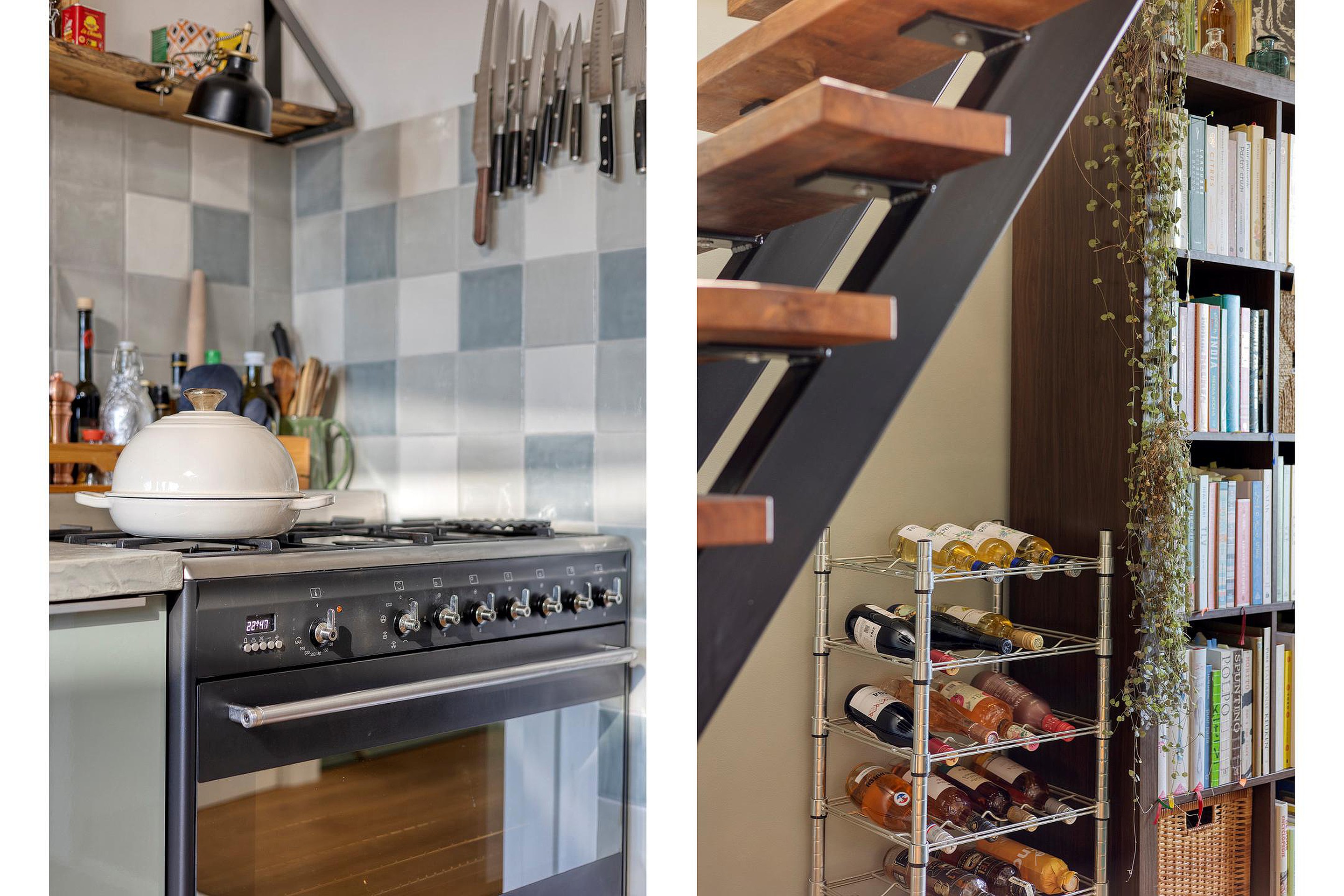 De eerste verdieping ademt licht en sfeer. Je komt boven op de royale overloop met toegang tot het toilet en 2 vaste kasten. Middels schuifdeuren is er toegang tot de voor- en achterkamer. Aan de voorzijde bevindt zich de gezellige woonkamer, aan de achterzijde de royale eetkamer met open keuken – een gezellige leefruimte waar koken en tafelen samenkomen. De keuken springt in het oog met zijn groene kleurstelling, extra diep werkblad van betonciree, royaal gasfornuis met oven en voldoende kastruimte. Vanuit de eetkamer leidt een houten trap – leuk weetje: gemaakt van oud spoormateriaal – naar het riante terras, de perfecte plek om te ontspannen of met vrienden te borrelen in de zon.