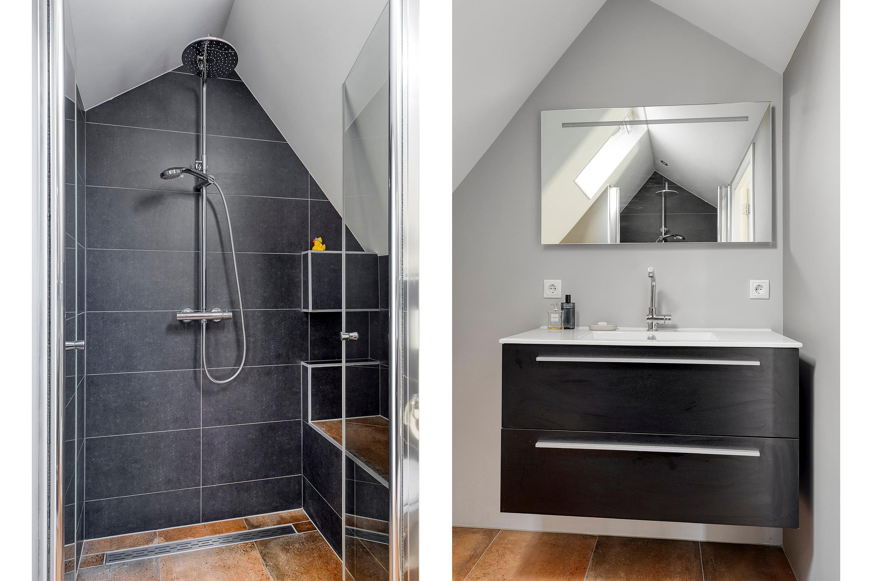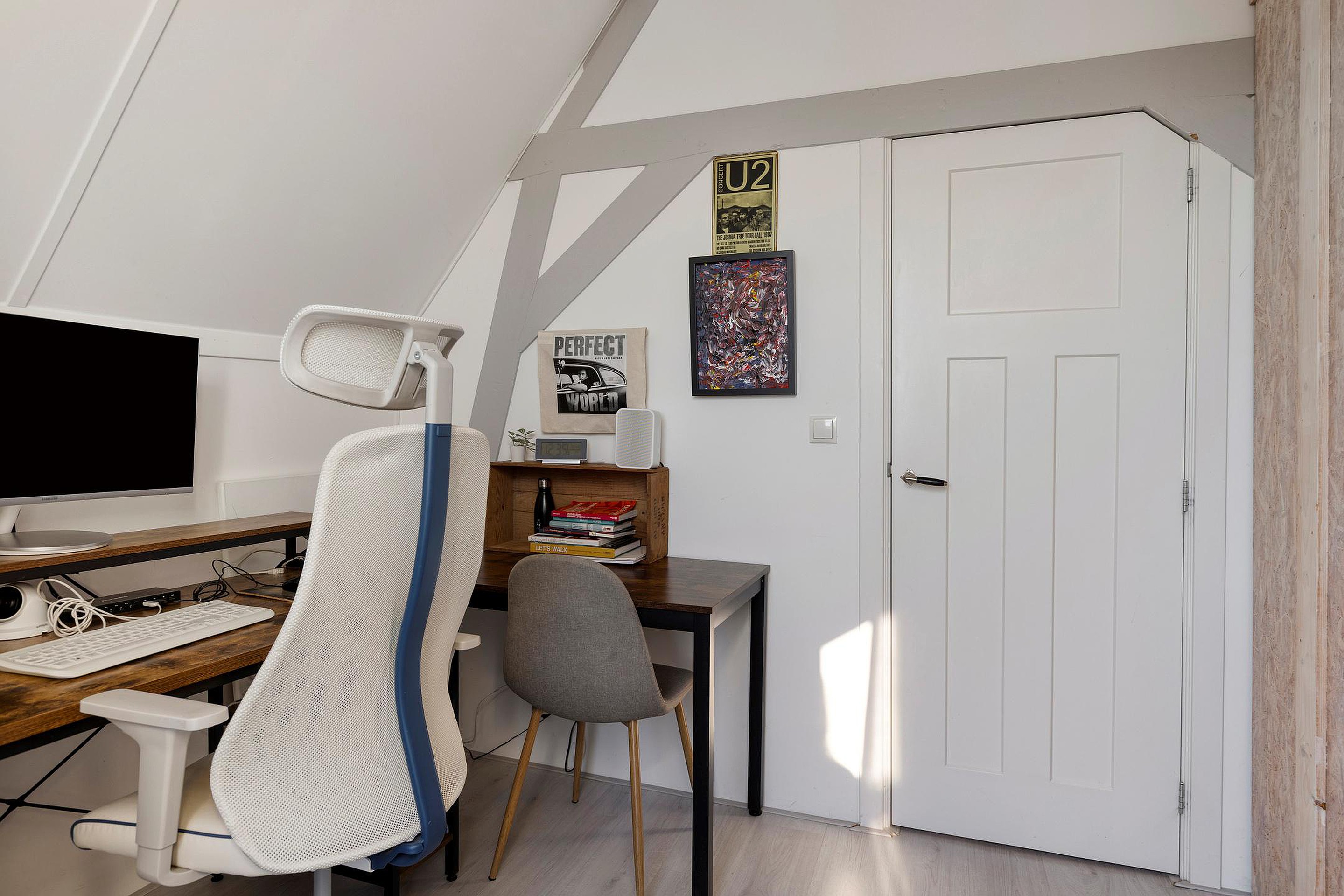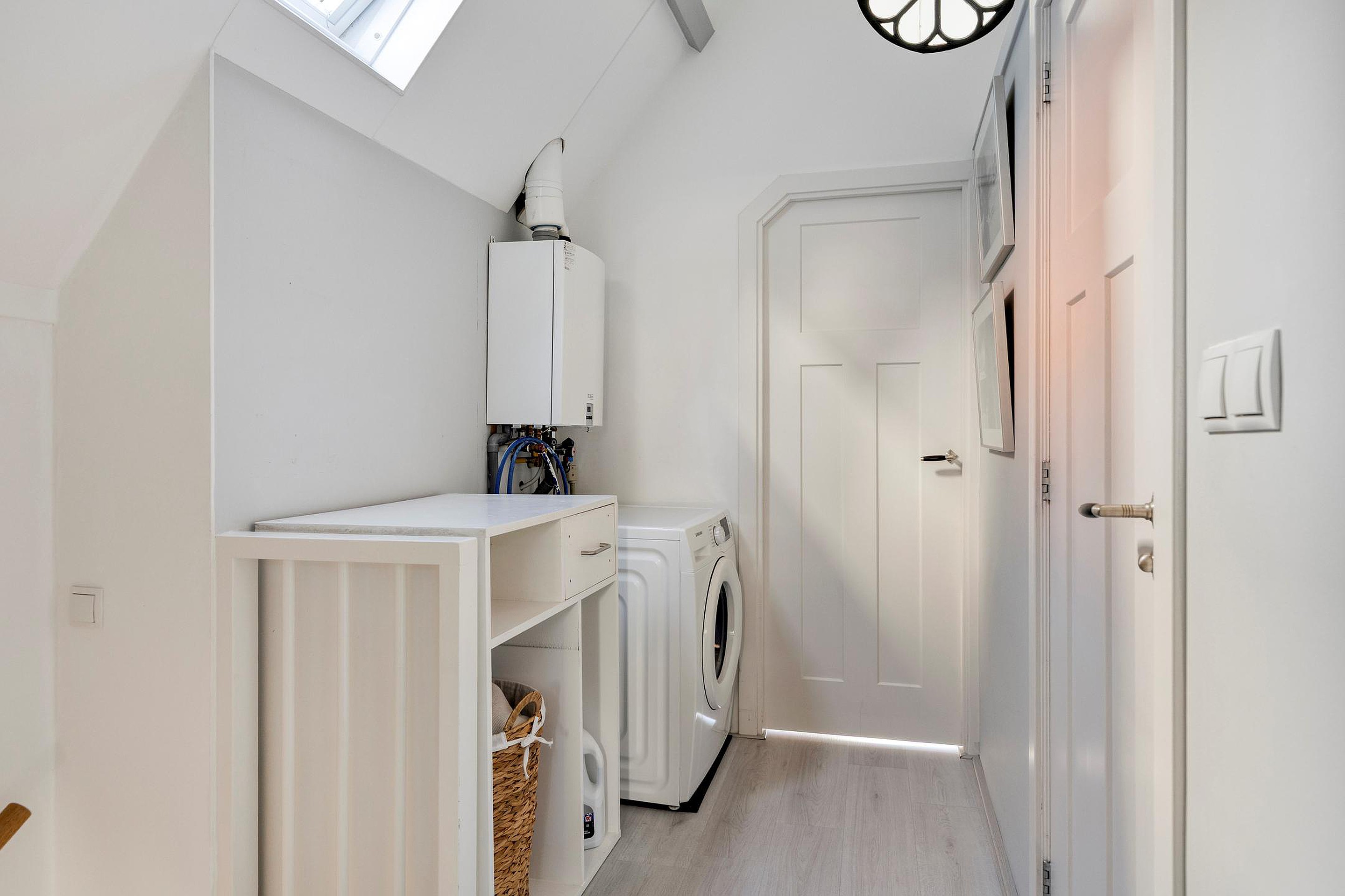 De tweede verdieping biedt twee slaapkamers: de ruime kamer aan de voorzijde met houten spanten in het zicht, en een tweede (werk)kamer aan de achterzijde met vaste kast en openslaande deuren naar het terras. De moderne badkamer beschikt over een inloopdouche, tweede toilet en wastafelmeubel. Op de overloop is ruimte voor de wasmachine en hangt de CV ketel. Twee sfeervolle rozetramen brengen mooi daglicht binnen en versterken het klassieke karakter, gecompleteerd door de paneeldeuren door het hele huis.