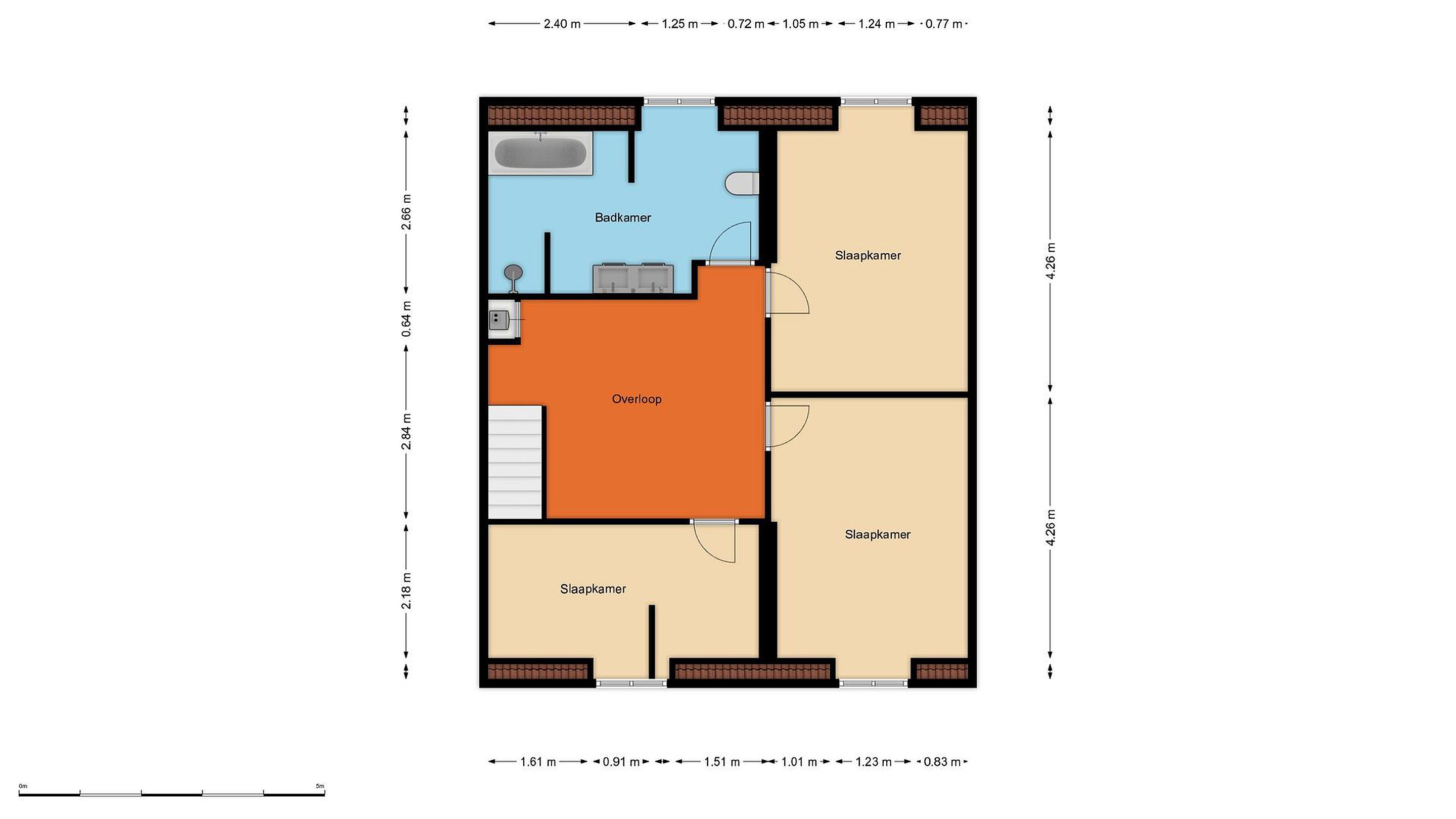 Ruime overloop, drie grote slaapkamers en badkamer.