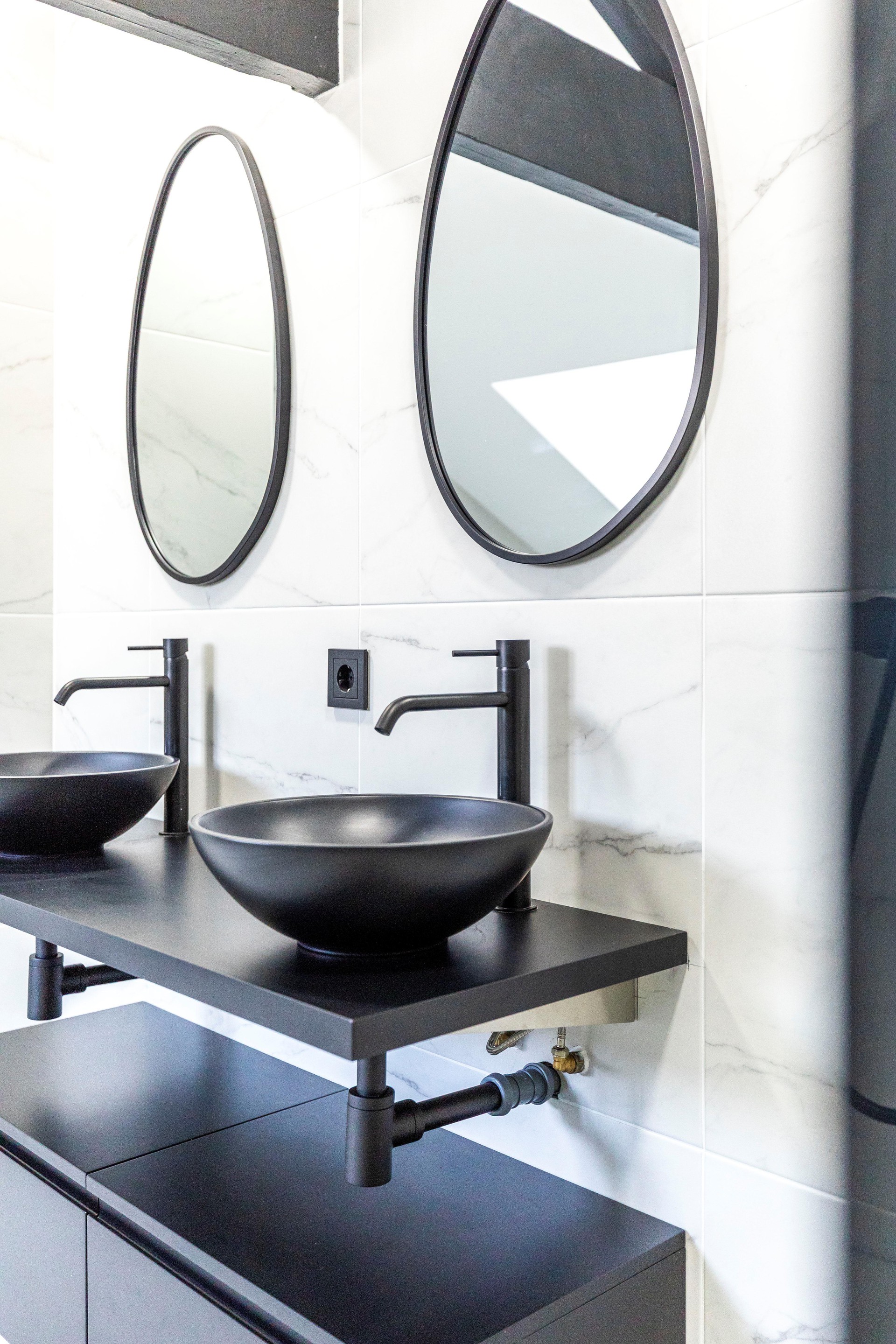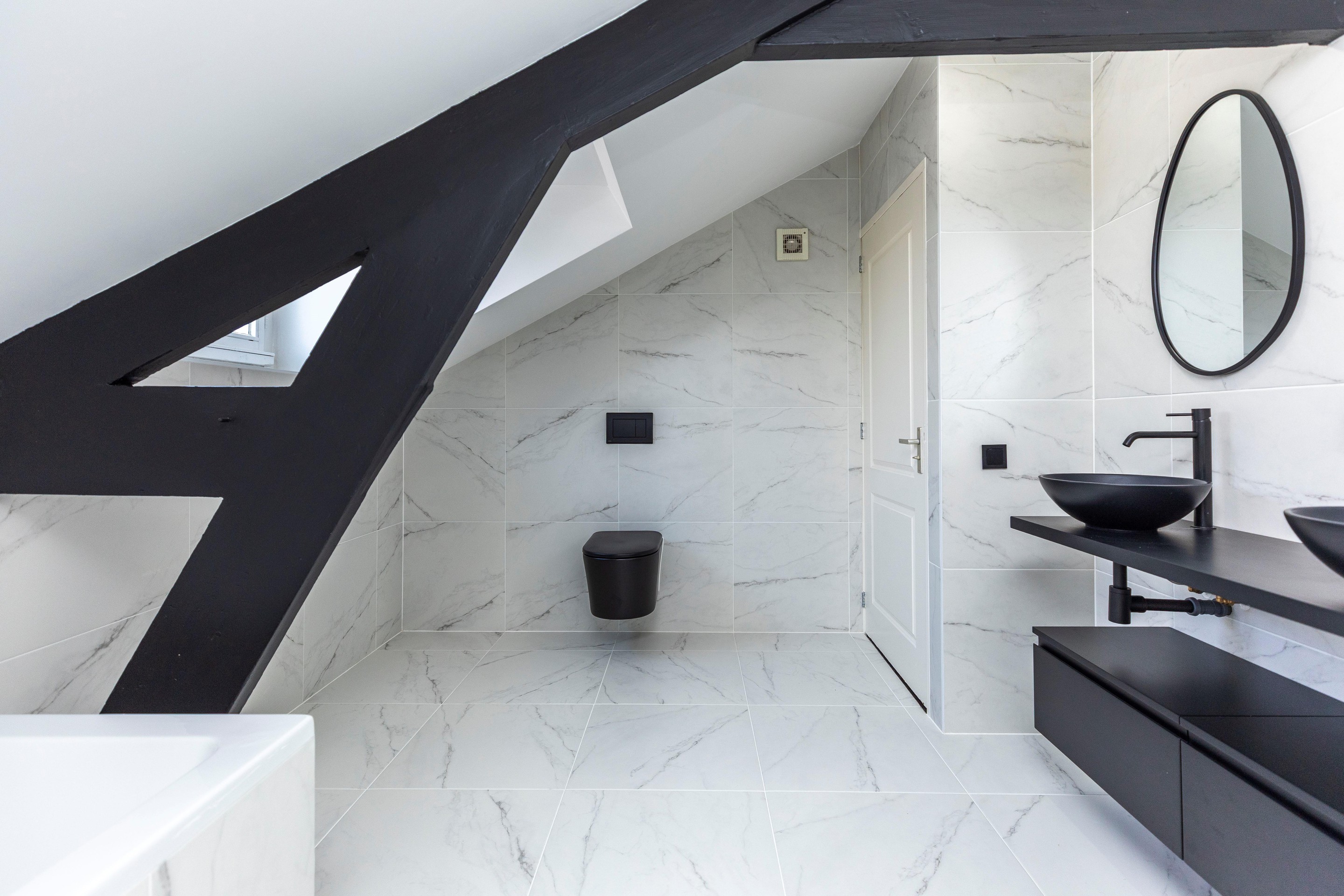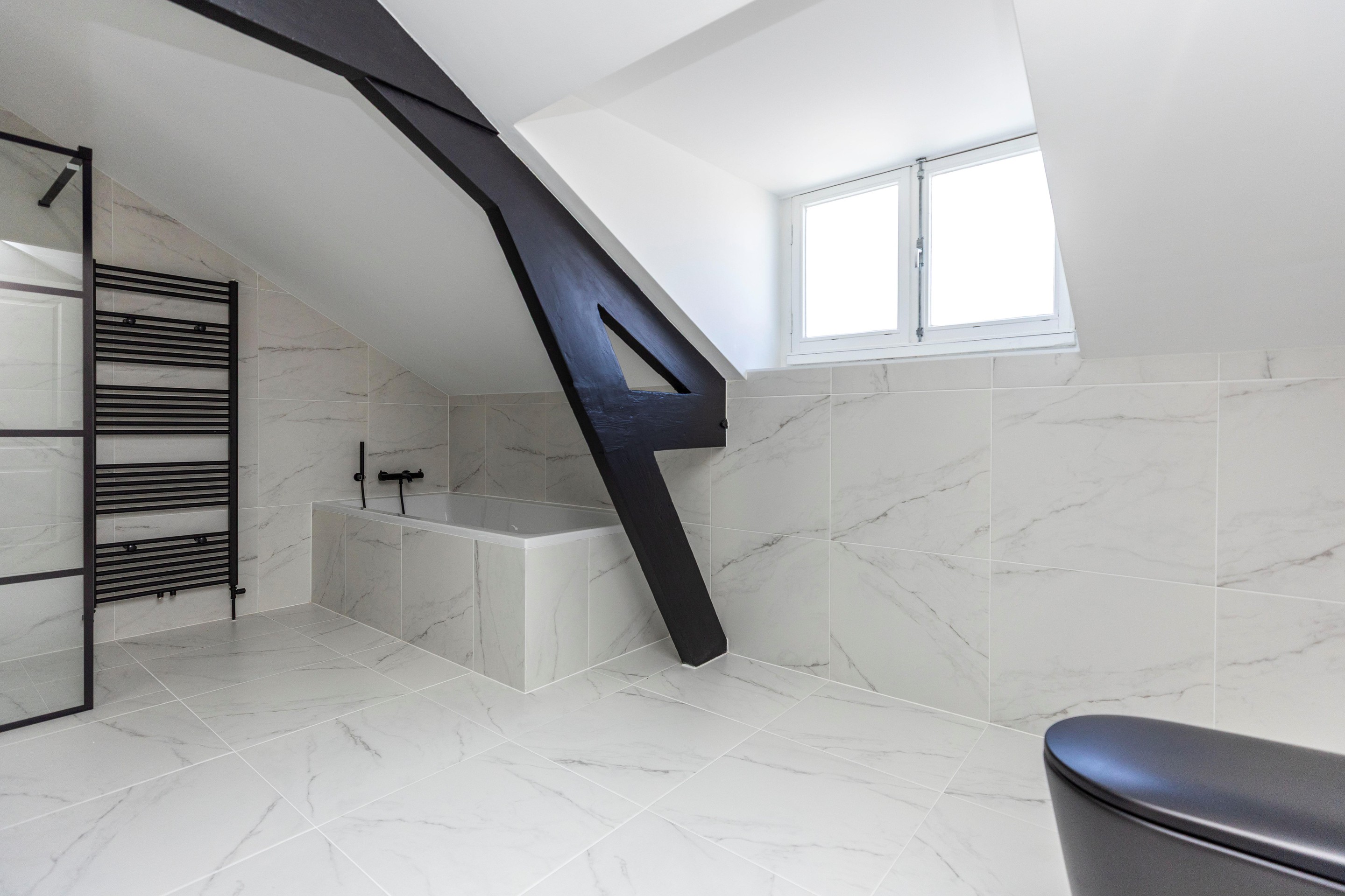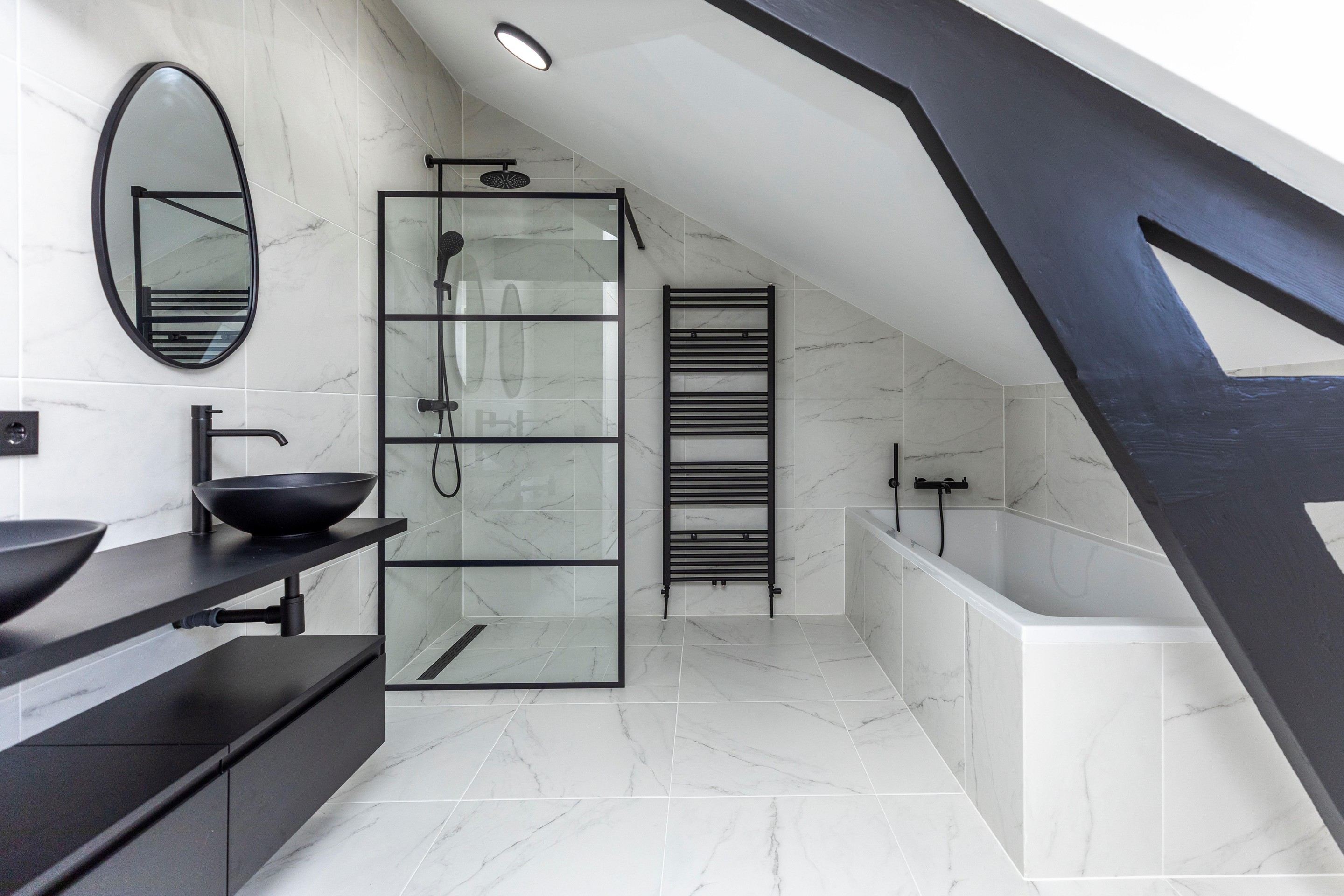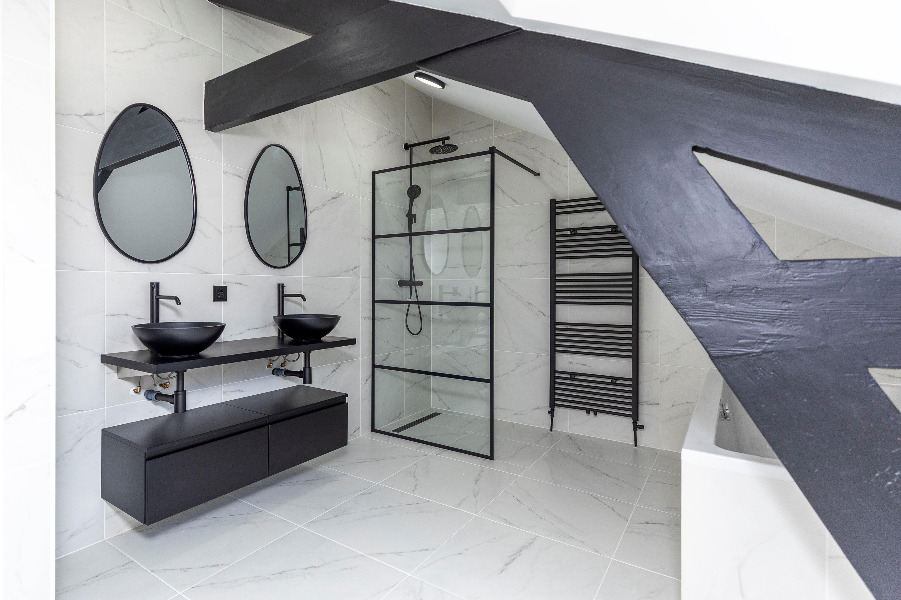 De badkamer is erg ruim en beschikt over een ruim inloopdouche met hand- en stortdouche, thermostaatkraan, ligbad, handdoekenradiator, dubbele wastafels en meubel. Er is netjes gestukt en betegeld. De slaapkamers zijn ruim van opzet en hebben enkele authentieke details zoals de originele houten spanten.