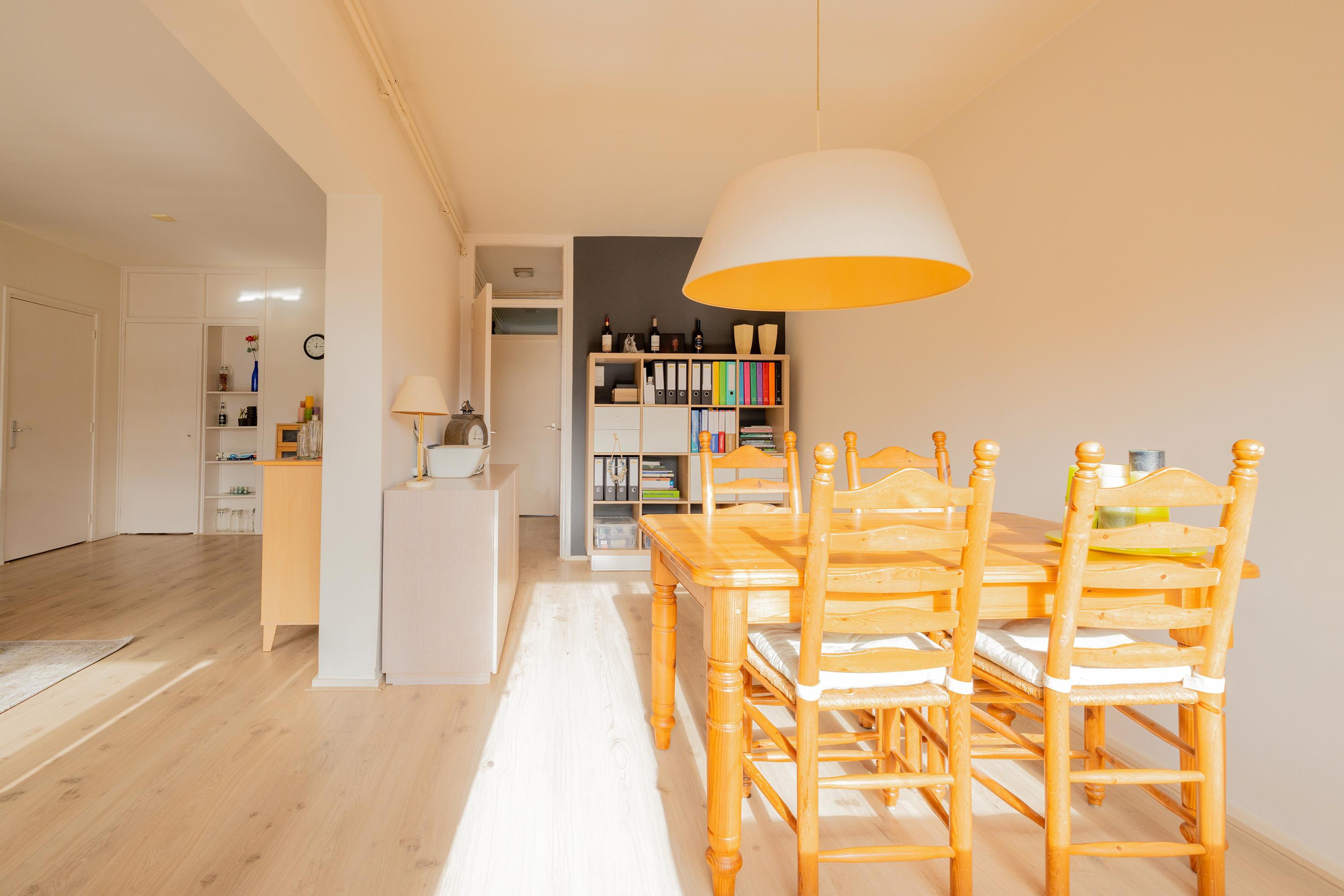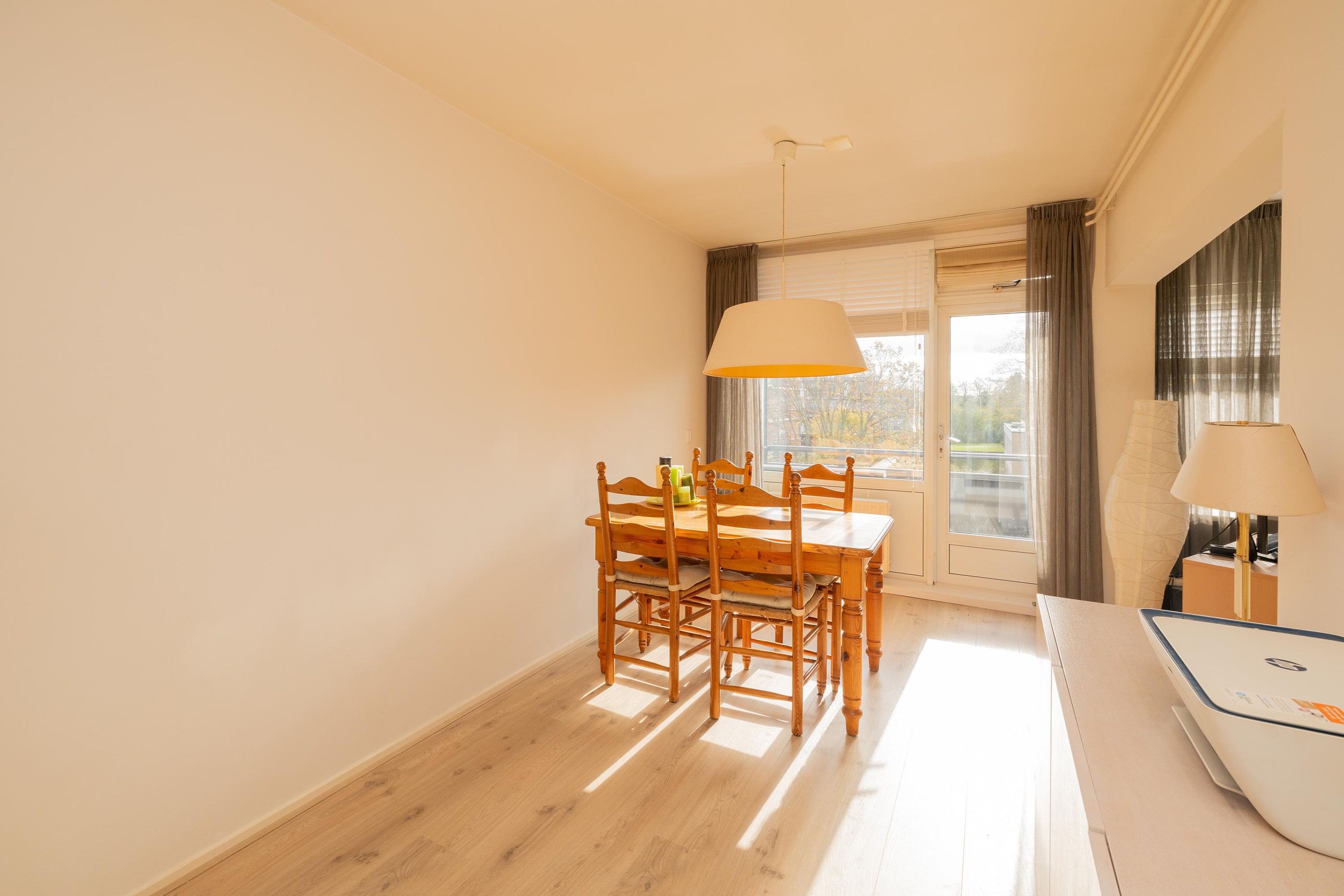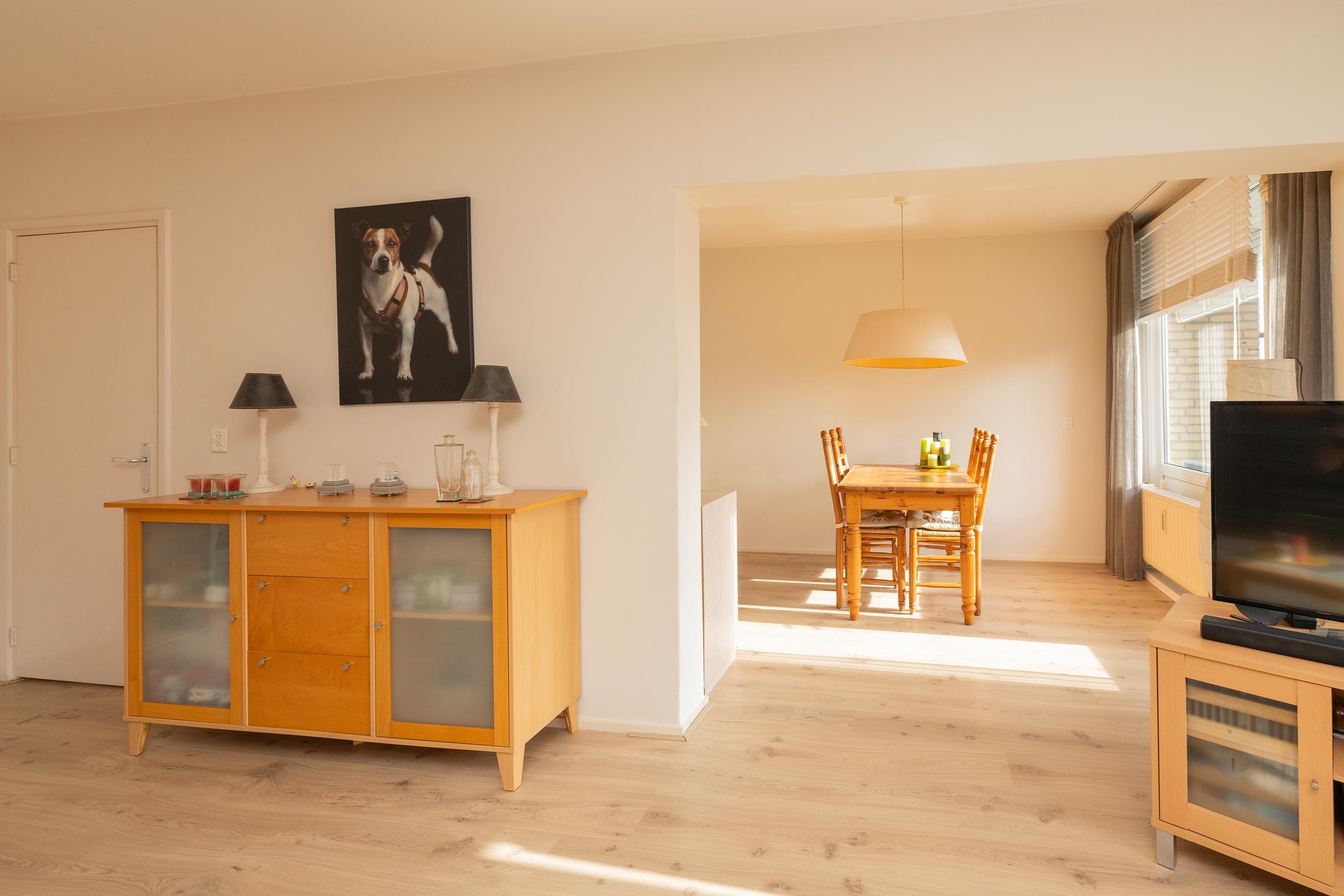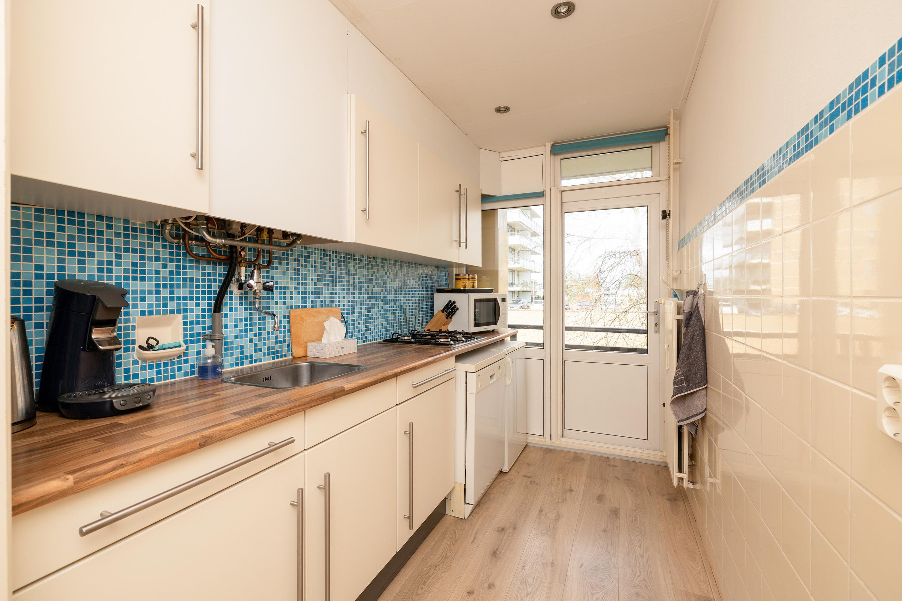 Begane grond Je komt binnen in de hal, waar de meterkast zich bevindt, rechtdoor is de deur naar de keuken maar eerst gaan we naar rechts, de deur naar de woonkamer en de aangrenzende open eetkamer. De keurige laminaatvloer loopt drempelloos door het gehele appartement. De woonkamer is een heerlijke lichte ruimte met grote ramen aan de voorzijde, op het Zuiden. Links in de woonkamer is de deur naar het eerste balkon, waar je al vroeg kunt genieten van het zonnetje. Van hieruit kijk je tussen de huizen door naar nog meer water en groen. Wat een uitzicht. Prima plek voor een buitenontbijtje, een boek of ’s avonds met een drankje en een zak chips op schoot. Heerlijk toch? Gaan we nu naar de keuken, deze ligt aan de achterzijde en vandaaruit kom je op het tweede balkon. Lekker als het ´s zomers een beetje te warm wordt. De keuken is netjes en heeft een gaskookplaat en door de bovenkastjes over de gehele lengte is er genoeg ruimte voor alle potten, pannen en voorraden.