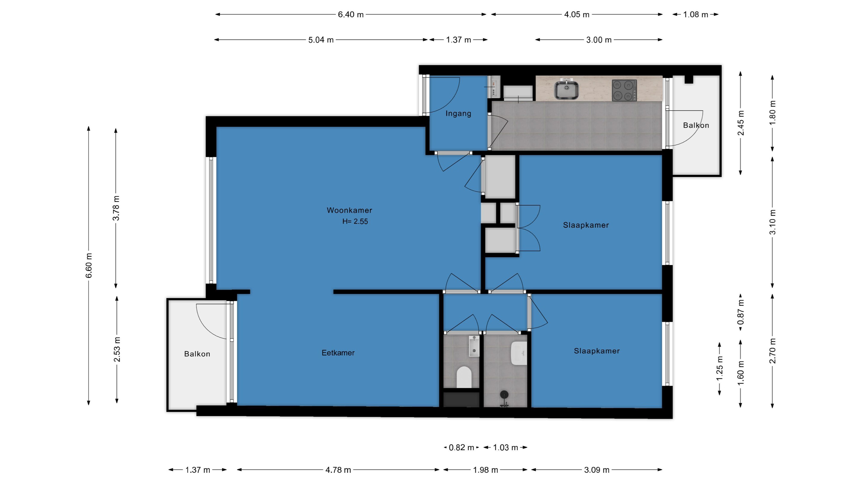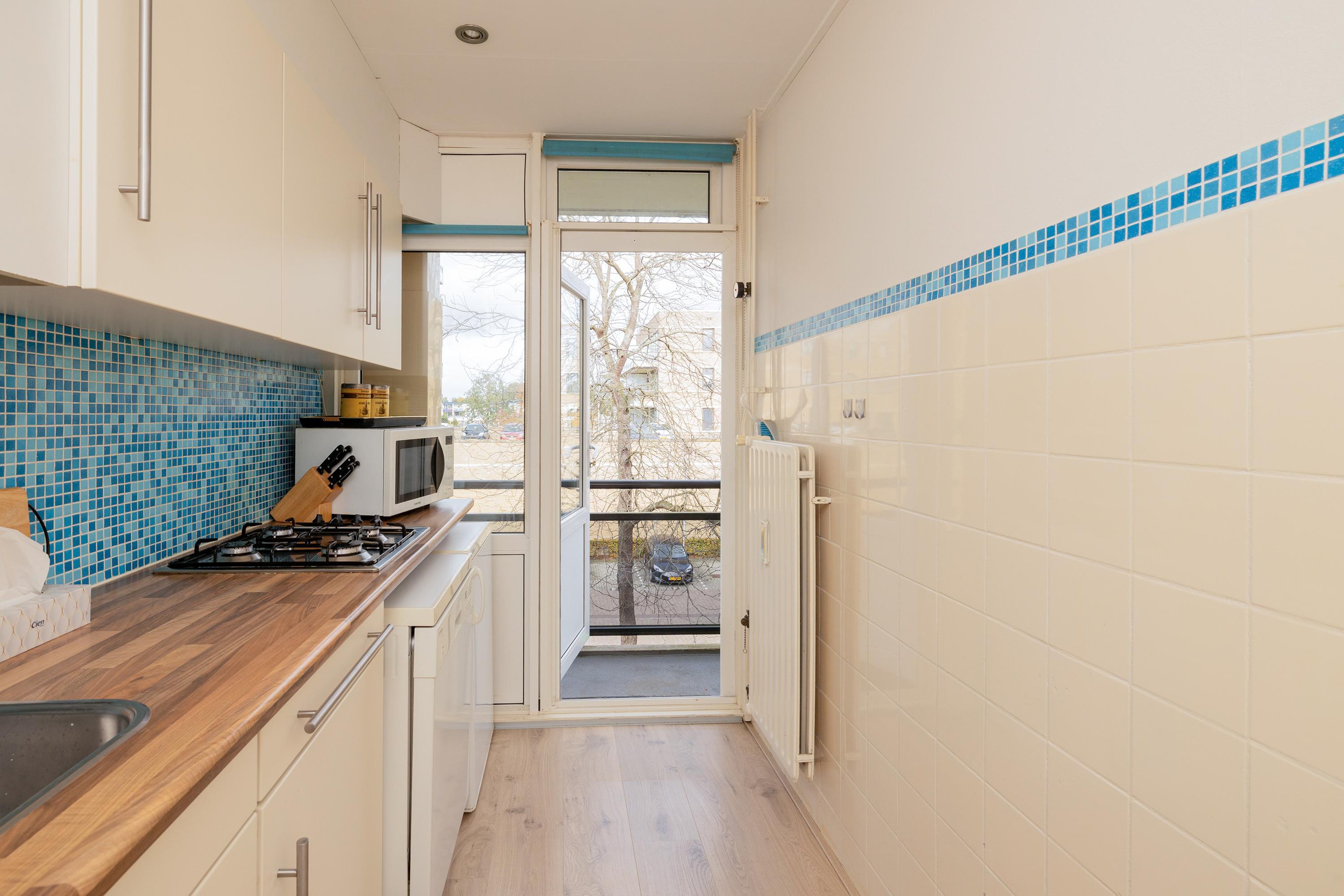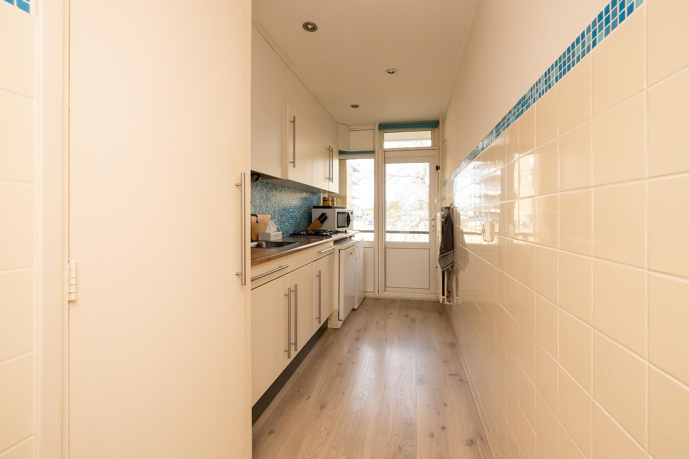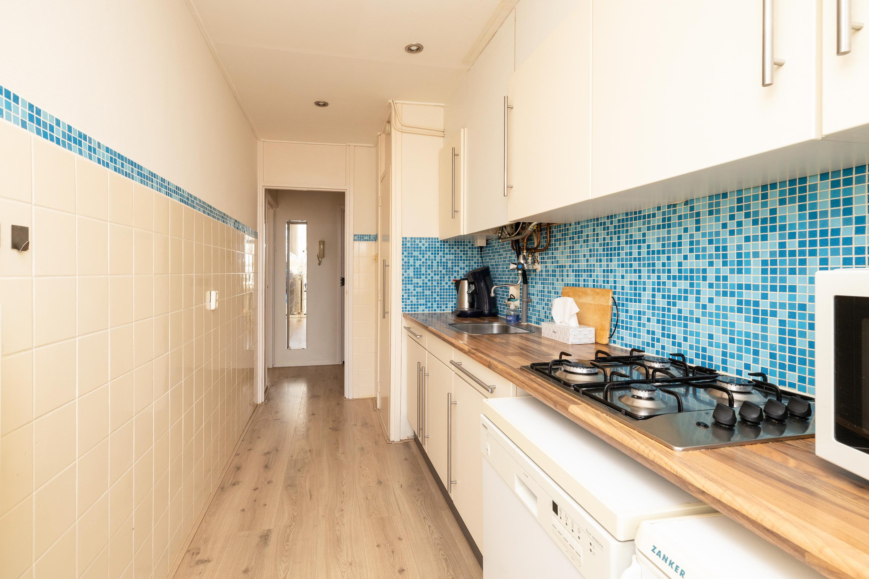 Begane grond Je komt binnen in de hal, waar de meterkast zich bevindt, rechtdoor is de deur naar de keuken maar eerst gaan we naar rechts, de deur naar de woonkamer en de aangrenzende open eetkamer. De keurige laminaatvloer loopt drempelloos door het gehele appartement. De woonkamer is een heerlijke lichte ruimte met grote ramen aan de voorzijde, op het Zuiden. Links in de woonkamer is de deur naar het eerste balkon, waar je al vroeg kunt genieten van het zonnetje. Van hieruit kijk je tussen de huizen door naar nog meer water en groen. Wat een uitzicht. Prima plek voor een buitenontbijtje, een boek of ’s avonds met een drankje en een zak chips op schoot. Heerlijk toch? Gaan we nu naar de keuken, deze ligt aan de achterzijde en vandaaruit kom je op het tweede balkon. Lekker als het ´s zomers een beetje te warm wordt. De keuken is netjes en heeft een gaskookplaat en door de bovenkastjes over de gehele lengte is er genoeg ruimte voor alle potten, pannen en voorraden.