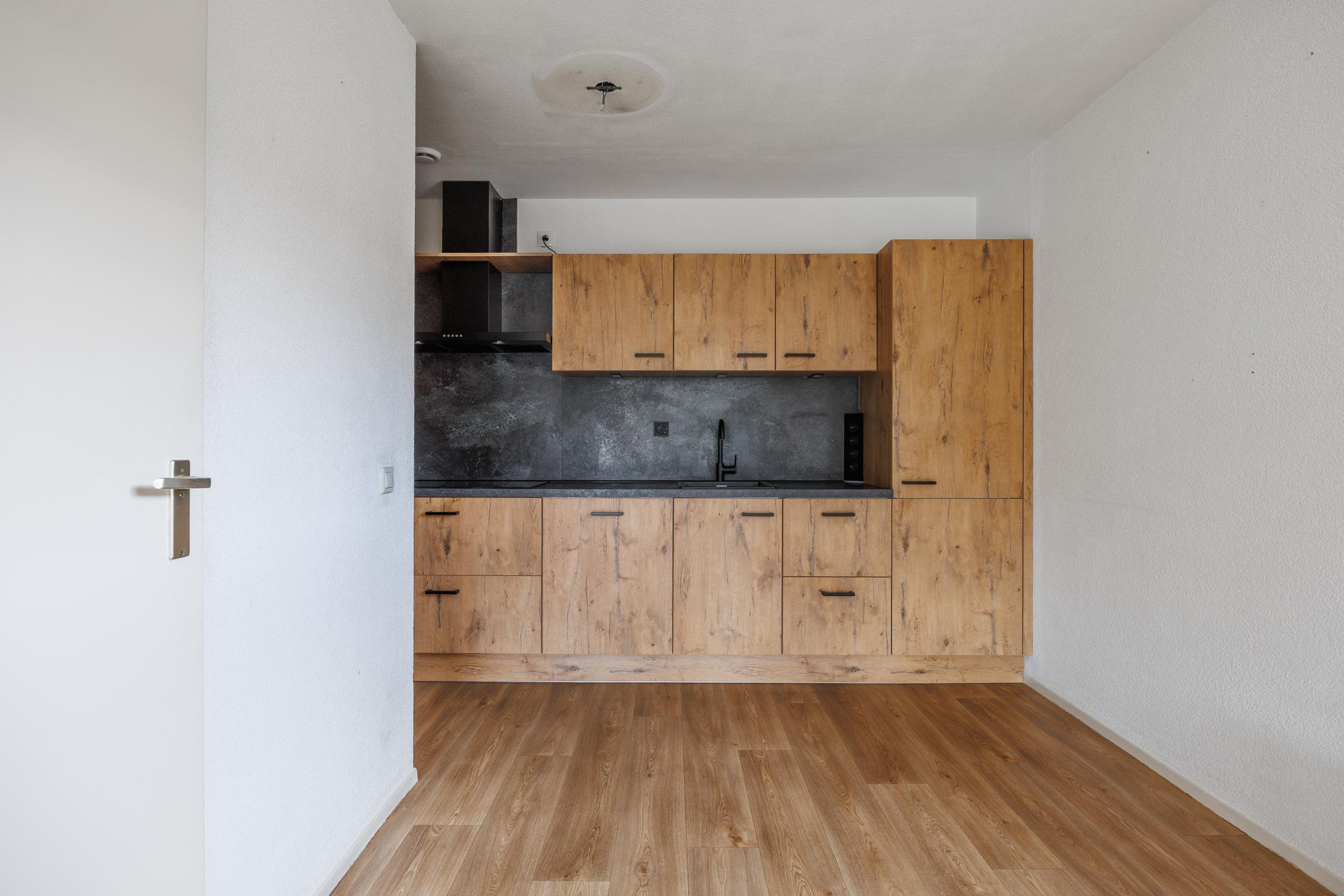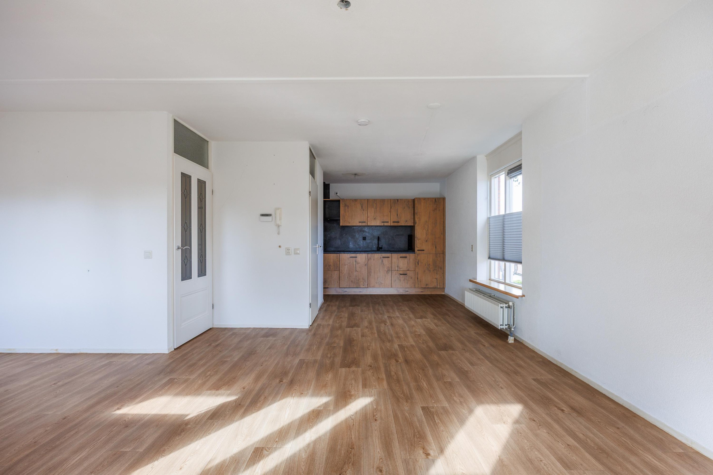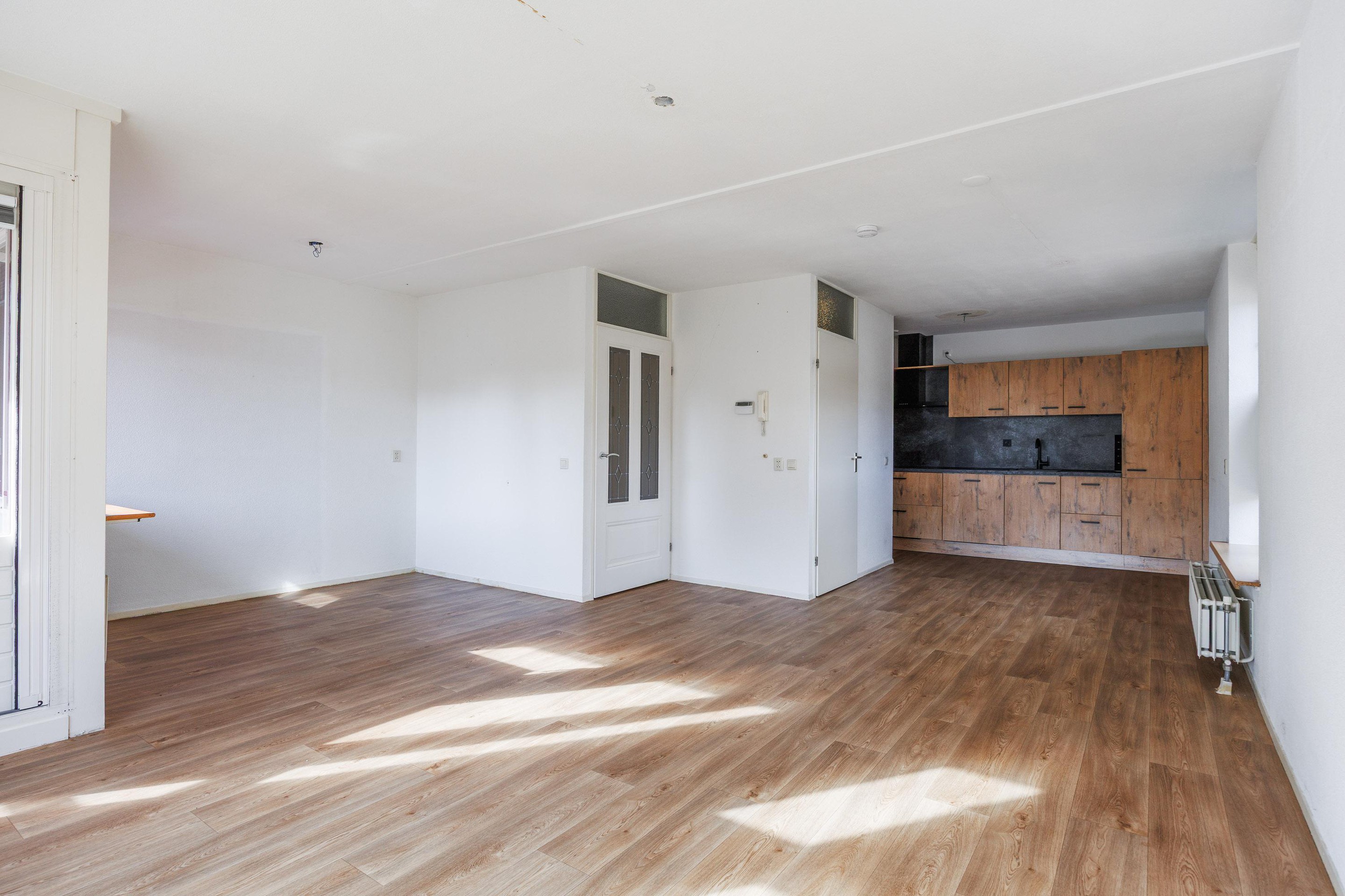 Entree/hal, woonkamer met open keuken; de woonkamer is ruim te noemen en de open keuken met diverse inbouwapparatuur (inductie kookplaat met afzuiging, grote koeler, vaatwasser, combi magnetron/oven) is nieuw geplaatst in 2025, met boven en onderkasten/lades, voorts een badkamer met douche, wastafel en toilet en radiator, en een ruime slaapkamer. De slaapkamer en de woonkamer grenzen aan het balkon. Het balkon is op het oosten gericht.