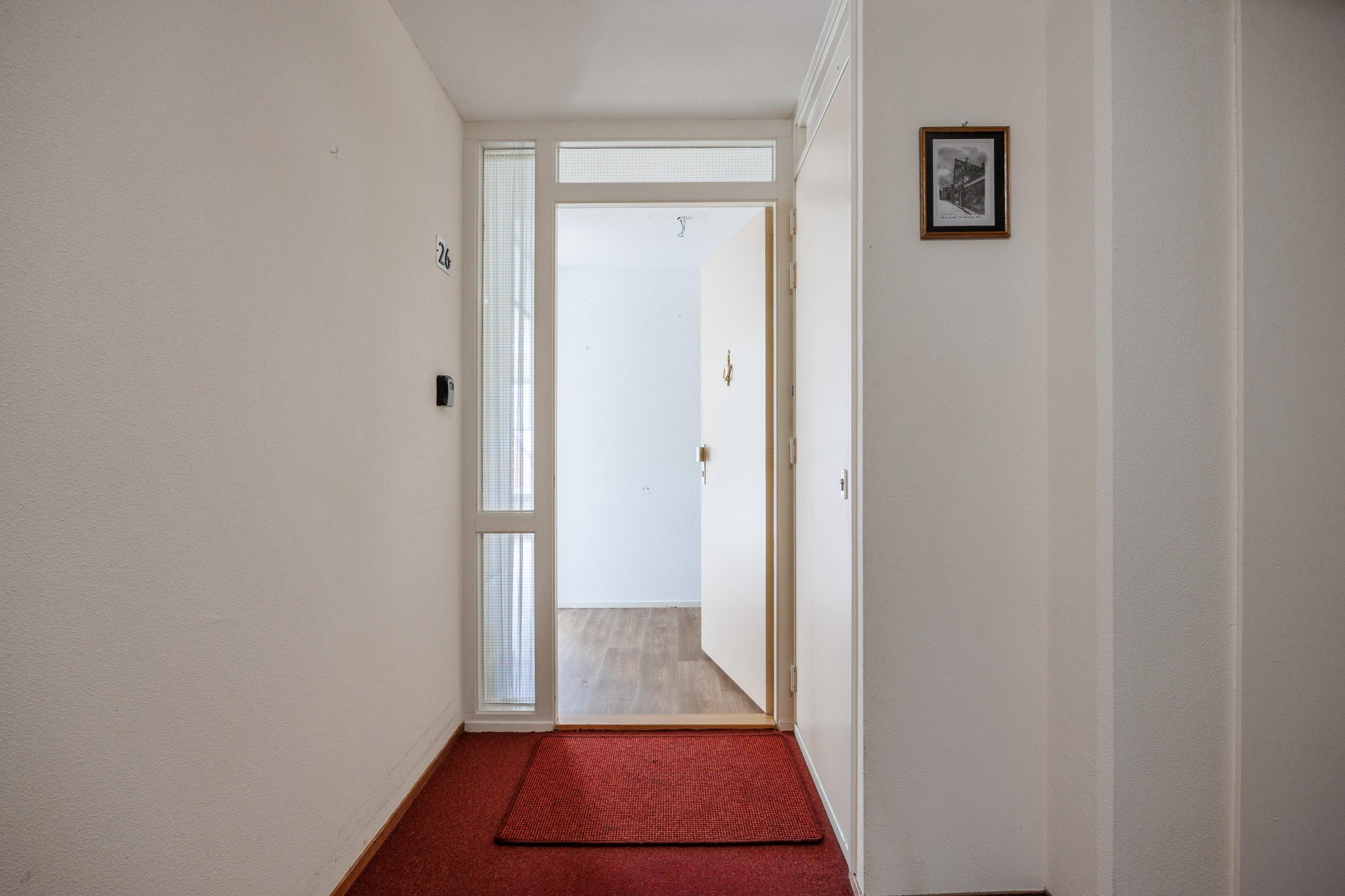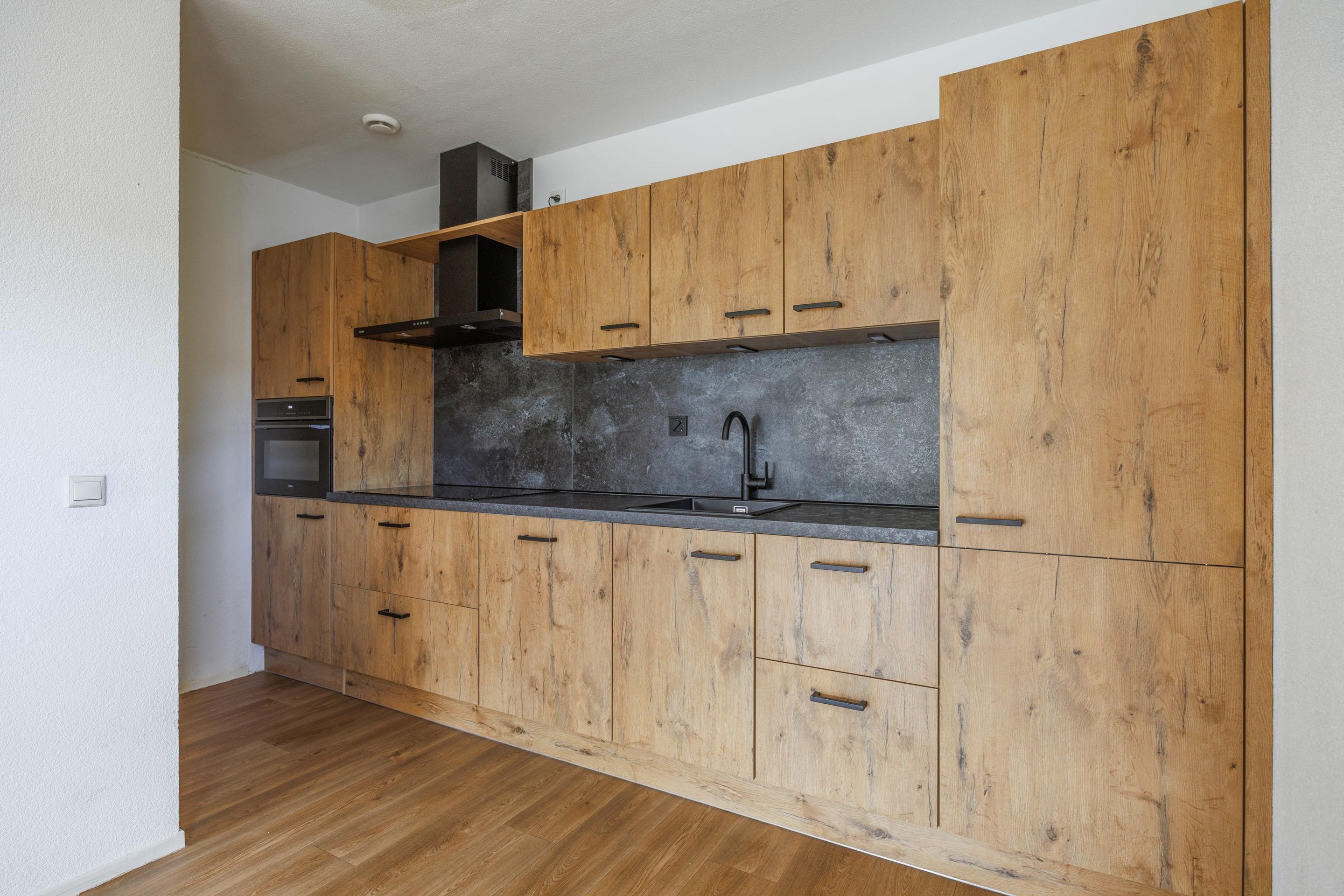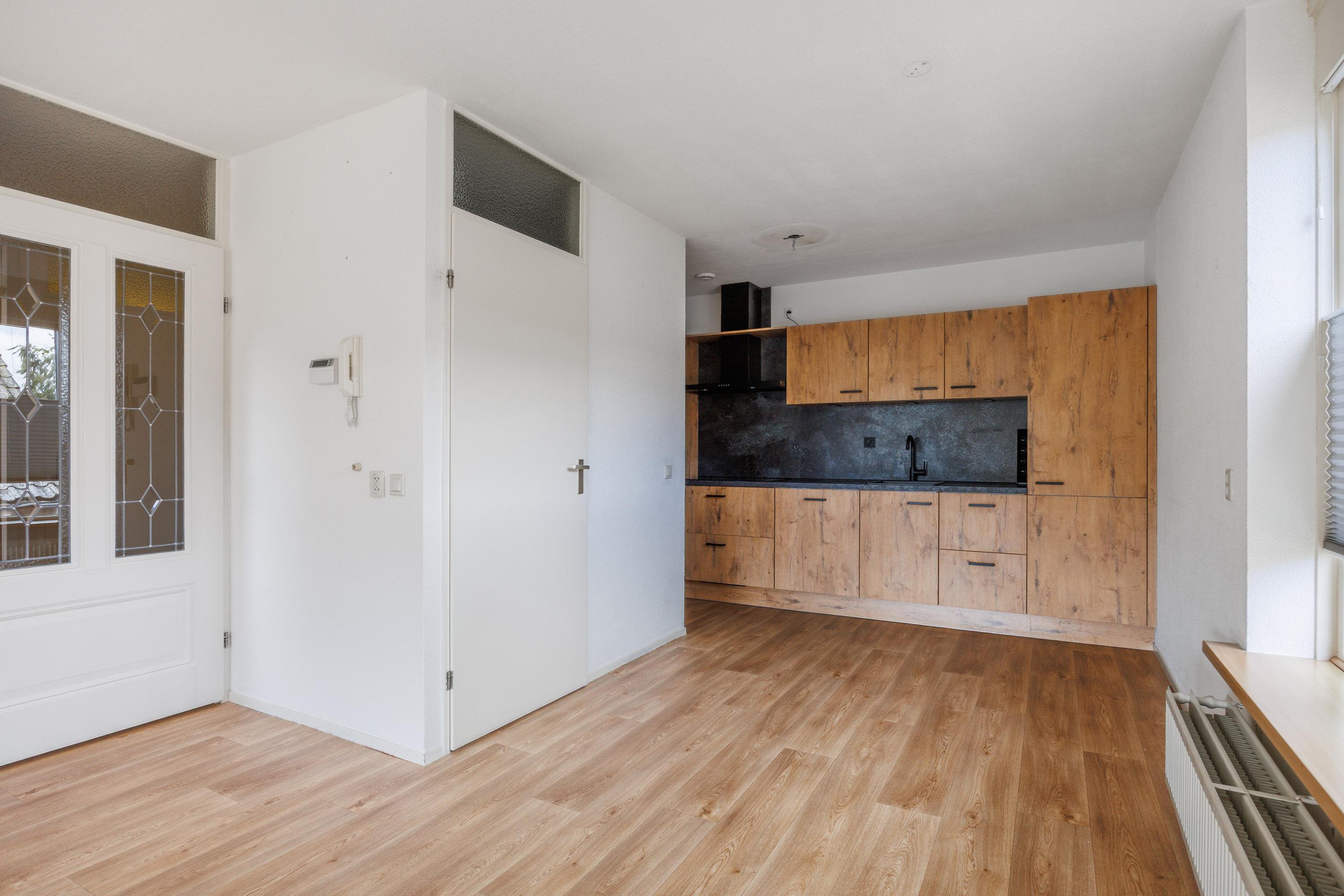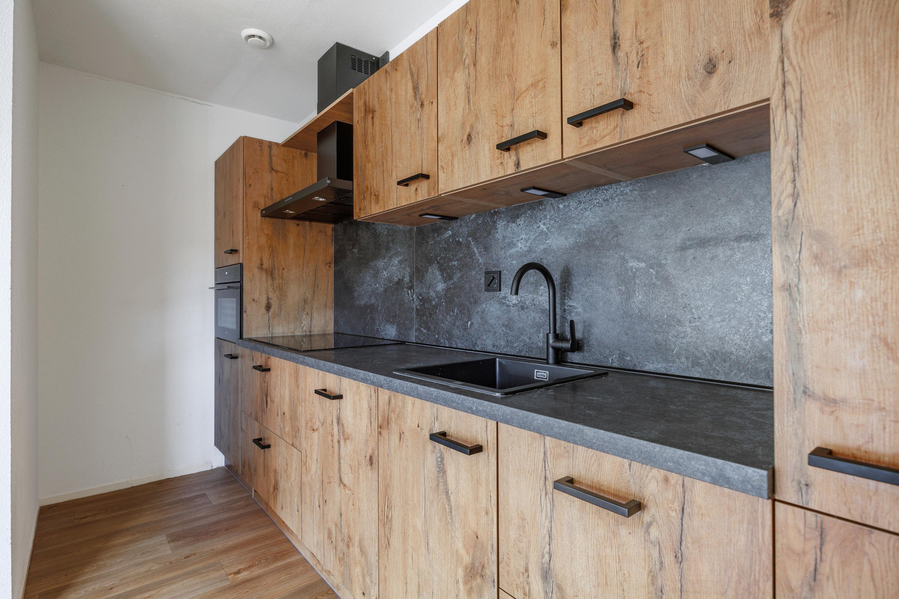 Entree/hal, woonkamer met open keuken; de woonkamer is ruim te noemen en de open keuken met diverse inbouwapparatuur (inductie kookplaat met afzuiging, grote koeler, vaatwasser, combi magnetron/oven) is nieuw geplaatst in 2025, met boven en onderkasten/lades, voorts een badkamer met douche, wastafel en toilet en radiator, en een ruime slaapkamer. De slaapkamer en de woonkamer grenzen aan het balkon. Het balkon is op het oosten gericht.