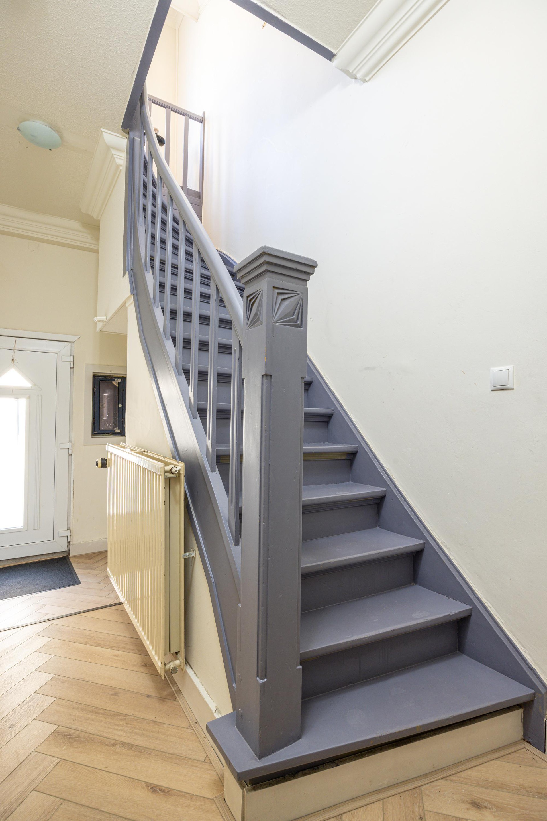 Begane grond Via de eigen entree op de begane grond kom je binnen in de ontvangsthal, waar zich de meterkast bevindt. Via de trap bereik je de eerste verdieping. De overloop is afgewerkt met een pvc-vloer en geeft toegang tot de woonkamer, een slaapkamer en de badkamer..