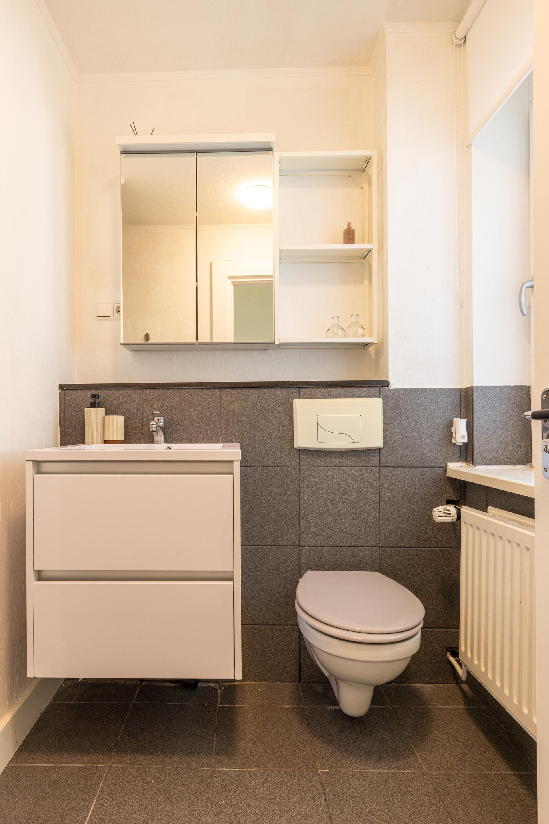 De badkamer is praktisch ingericht met een tegelvloer, een douche, een zwevend toilet en een badkamermeubel met wastafel en spiegel.