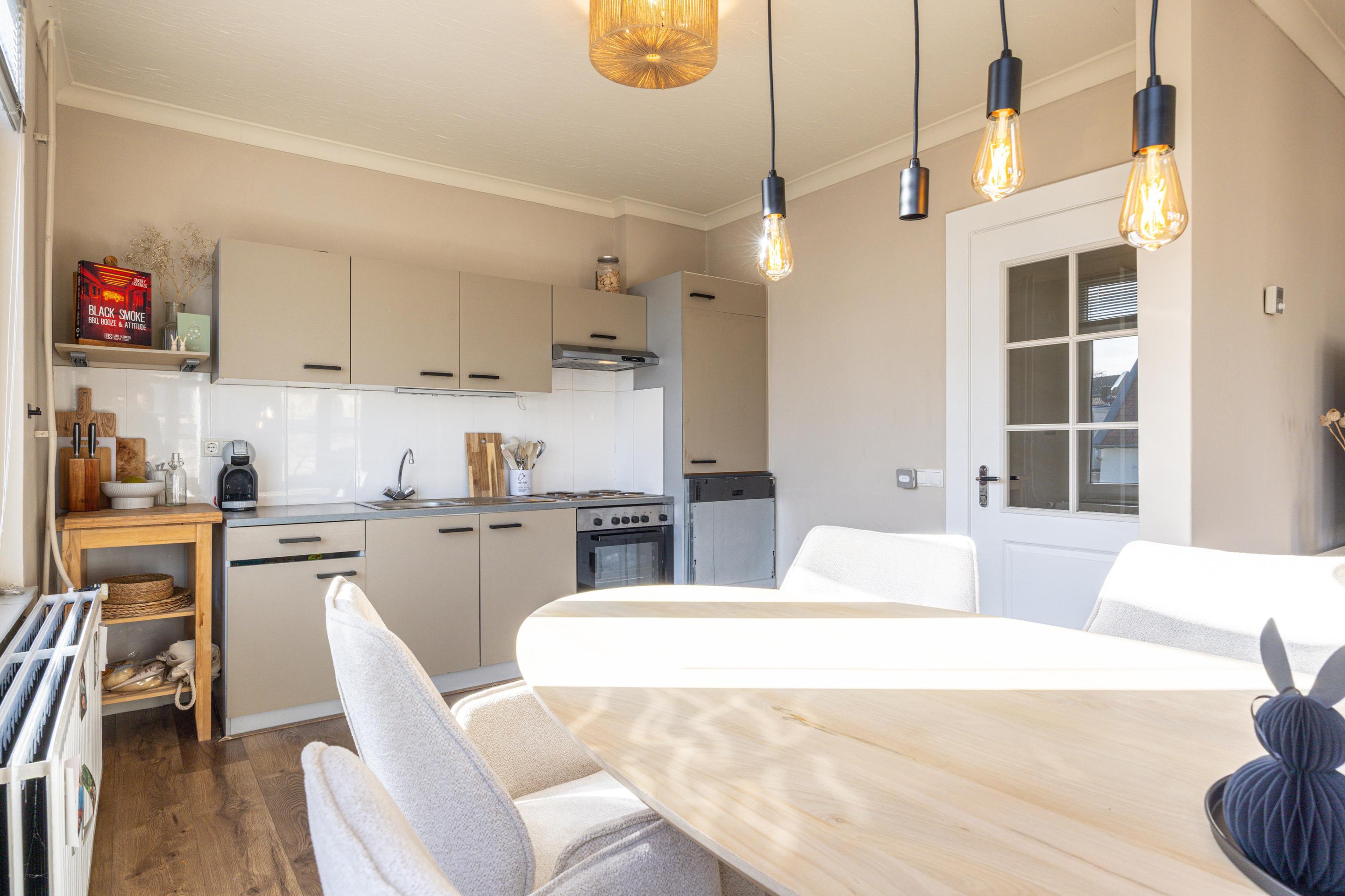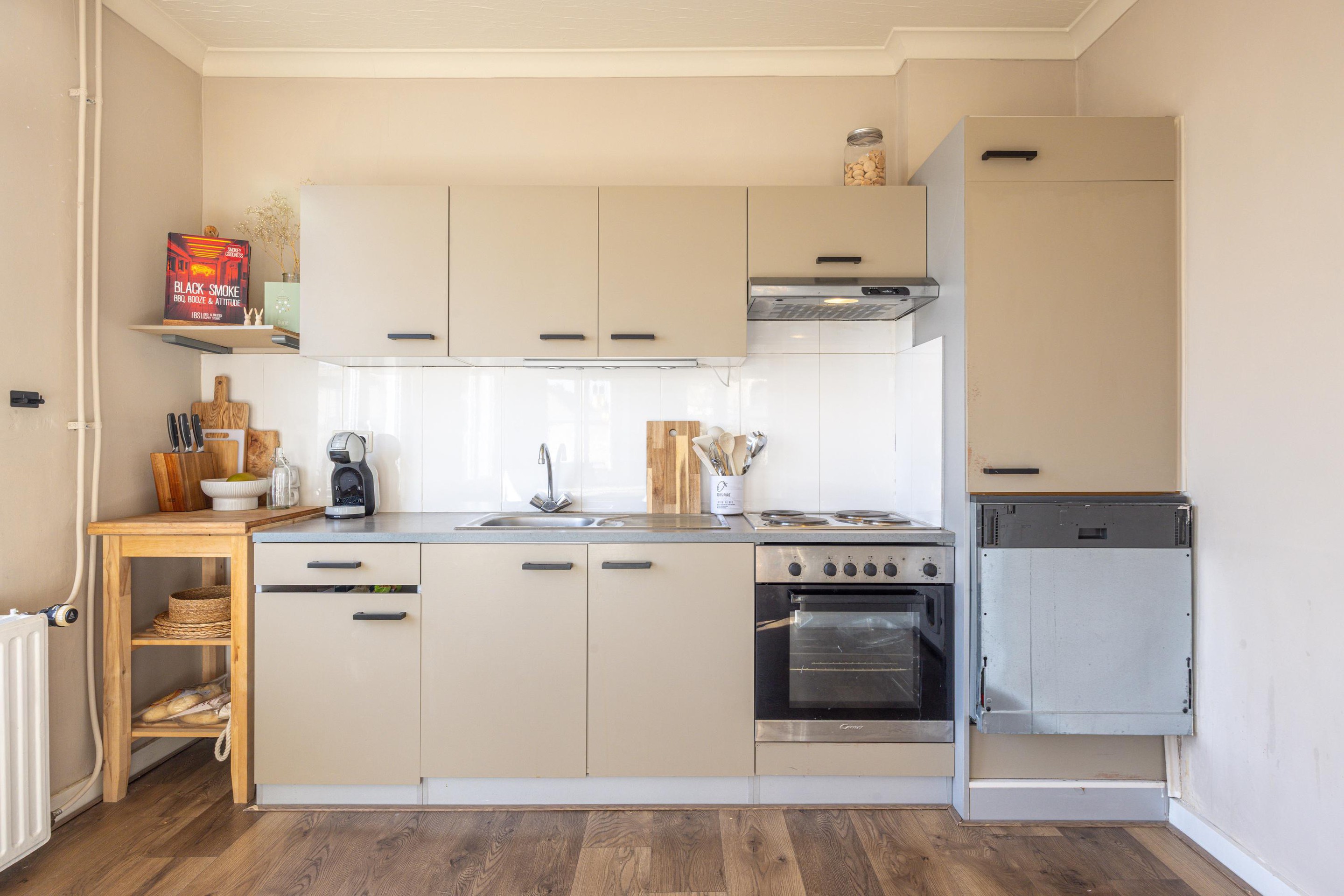 Aansluitend bevindt zich de open keuken, die logisch in verbinding staat met de woonkamer. Ook hier ligt een laminaatvloer en zijn kunststof kozijnen met HR++ beglazing aanwezig. De keuken beschikt over voldoende kast- en werkruimte en is praktisch ingericht met een 4-pits inductiekookplaat, afzuigkap, oven en koelkast.