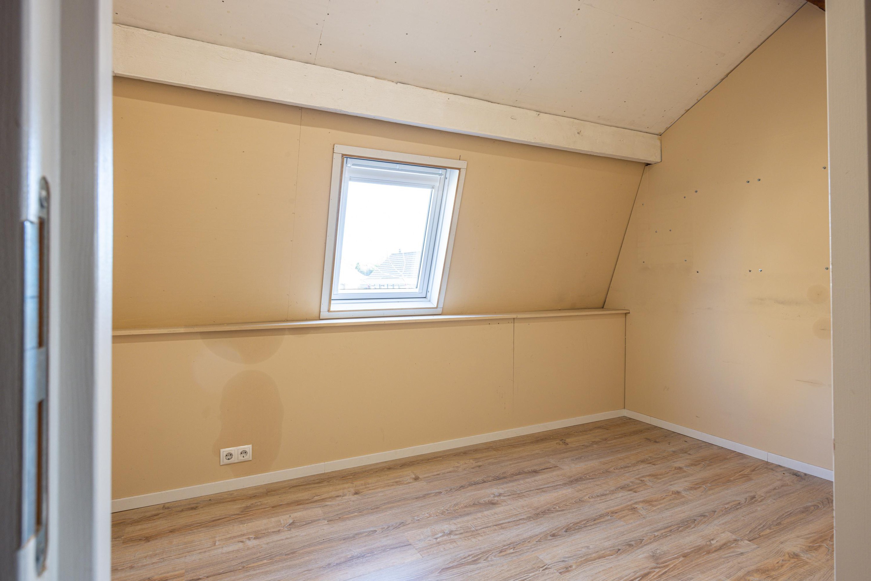De slaapkamer op deze verdieping is van goed formaat en afgewerkt met een laminaatvloer. Ook hier zorgen de kunststof kozijnen met HR++ beglazing voor een aangenaam wooncomfort.