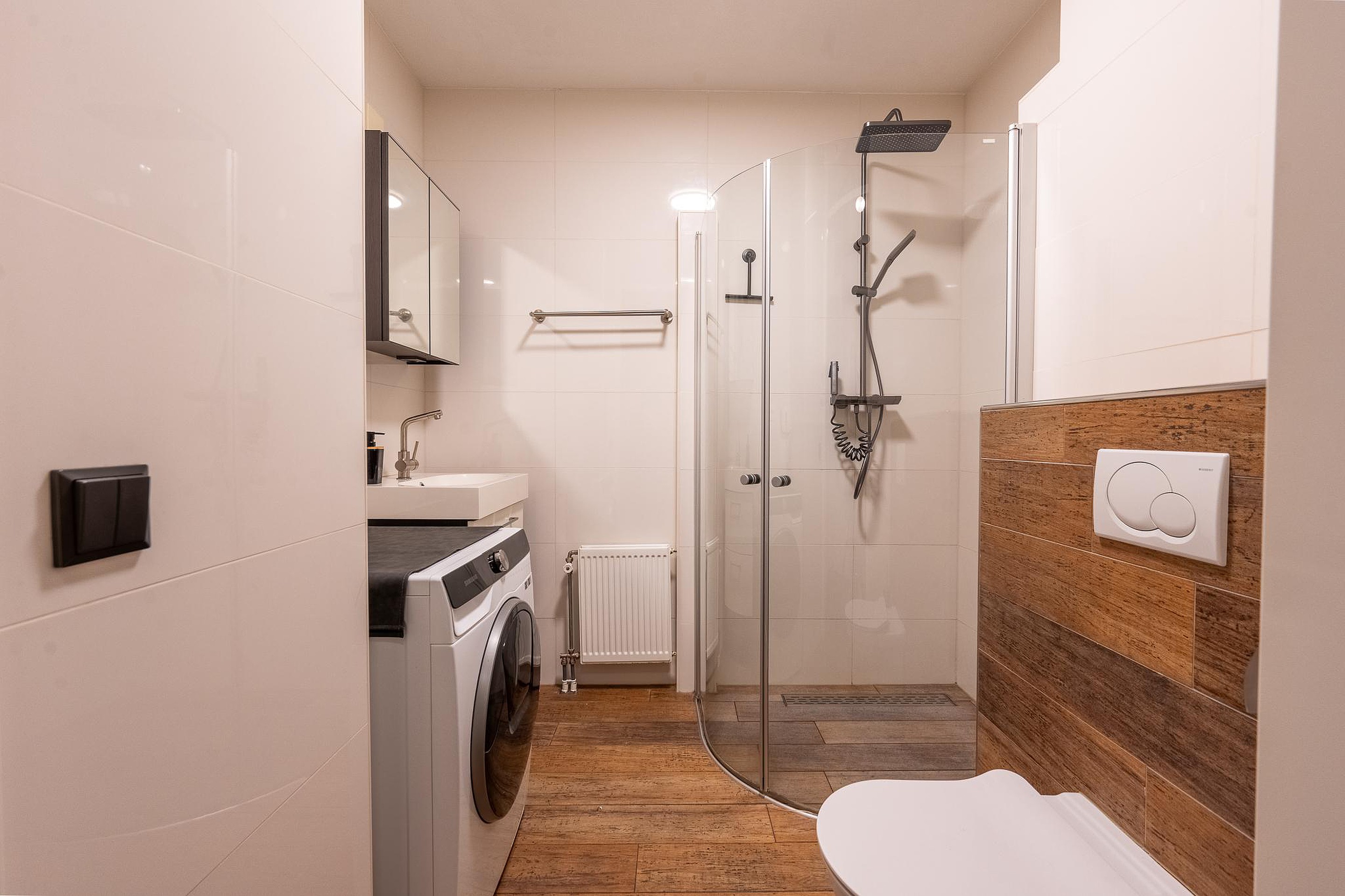 De badkamer is praktisch ingericht en voorzien van een douchecabine, wastafel en een hangend toilet.