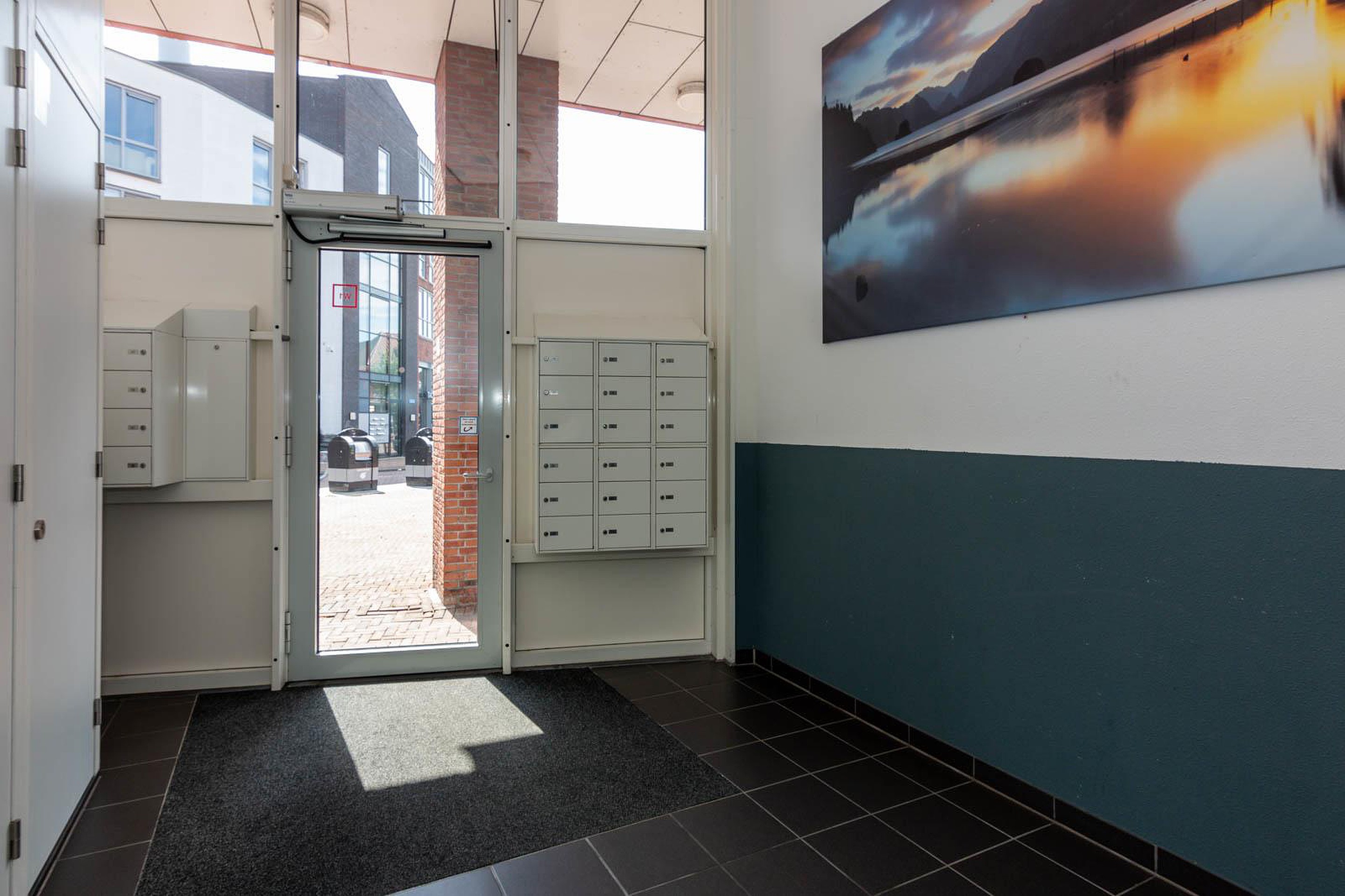 Entree van het nette appartementencomplex met bellentableau, brievenbussen, toegang tot de liftinstallatie en het trappenhuis.