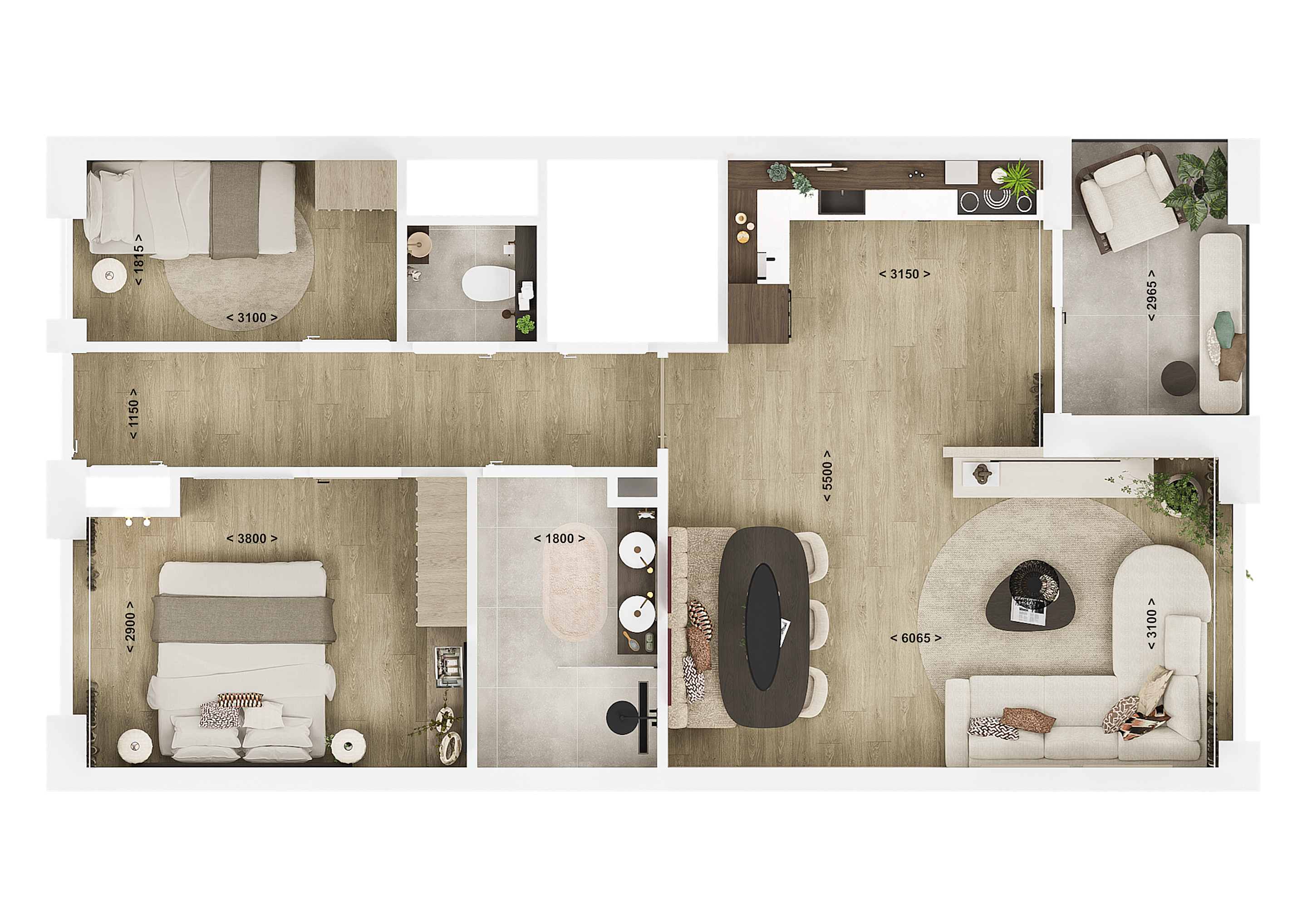 Dezelfde fijne indeling met twee slaapkamers, aangevuld met een balkon aan de