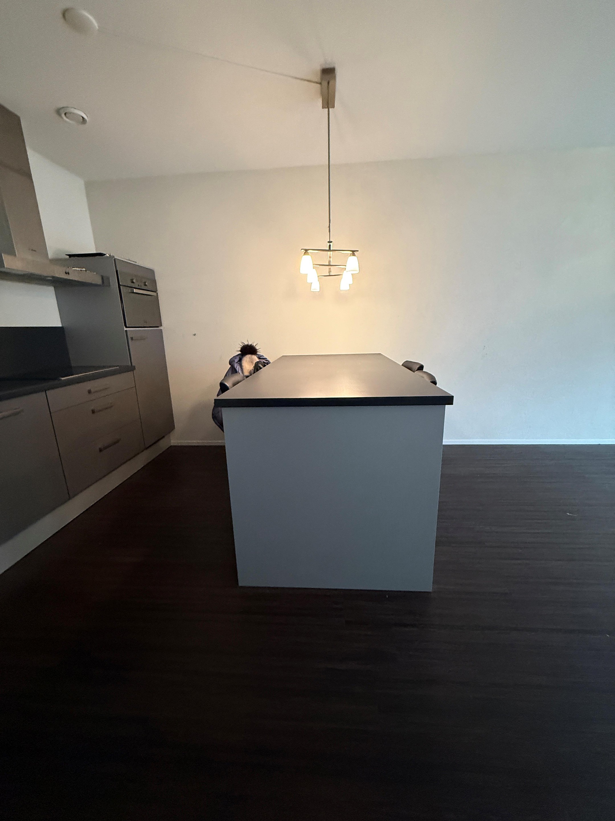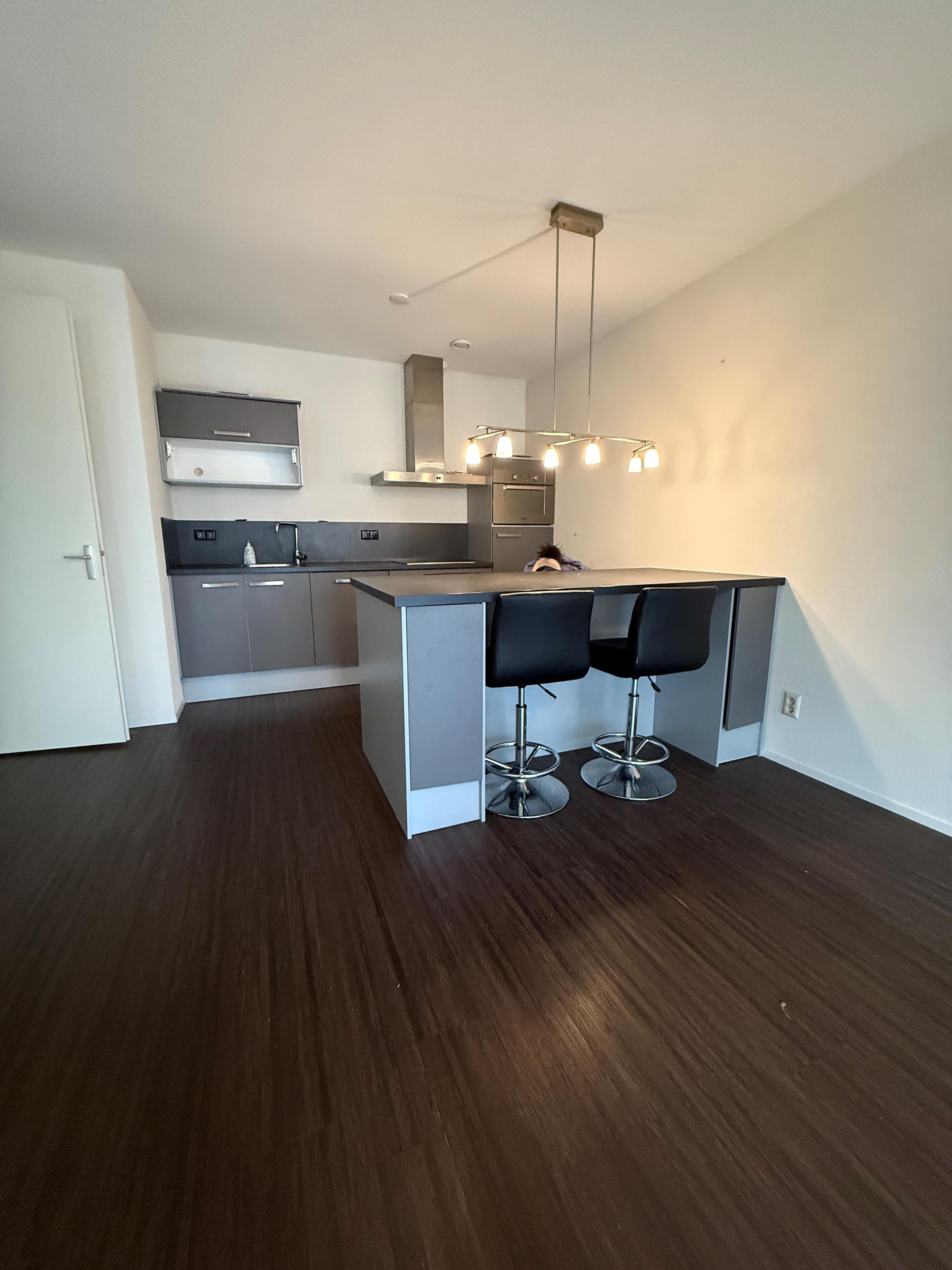 De keuken is voorzien van een recht opgesteld keukenblok tegen de wand met een keramische kookplaat, combimagnetron, rvs recirculatiekap, koelkast, vaatwasser en spoelbak. Daarnaast is er een groot vast eiland met opbergruimte en 4 zitplaatsen. Een eettafel is dus niet meer nodig.
